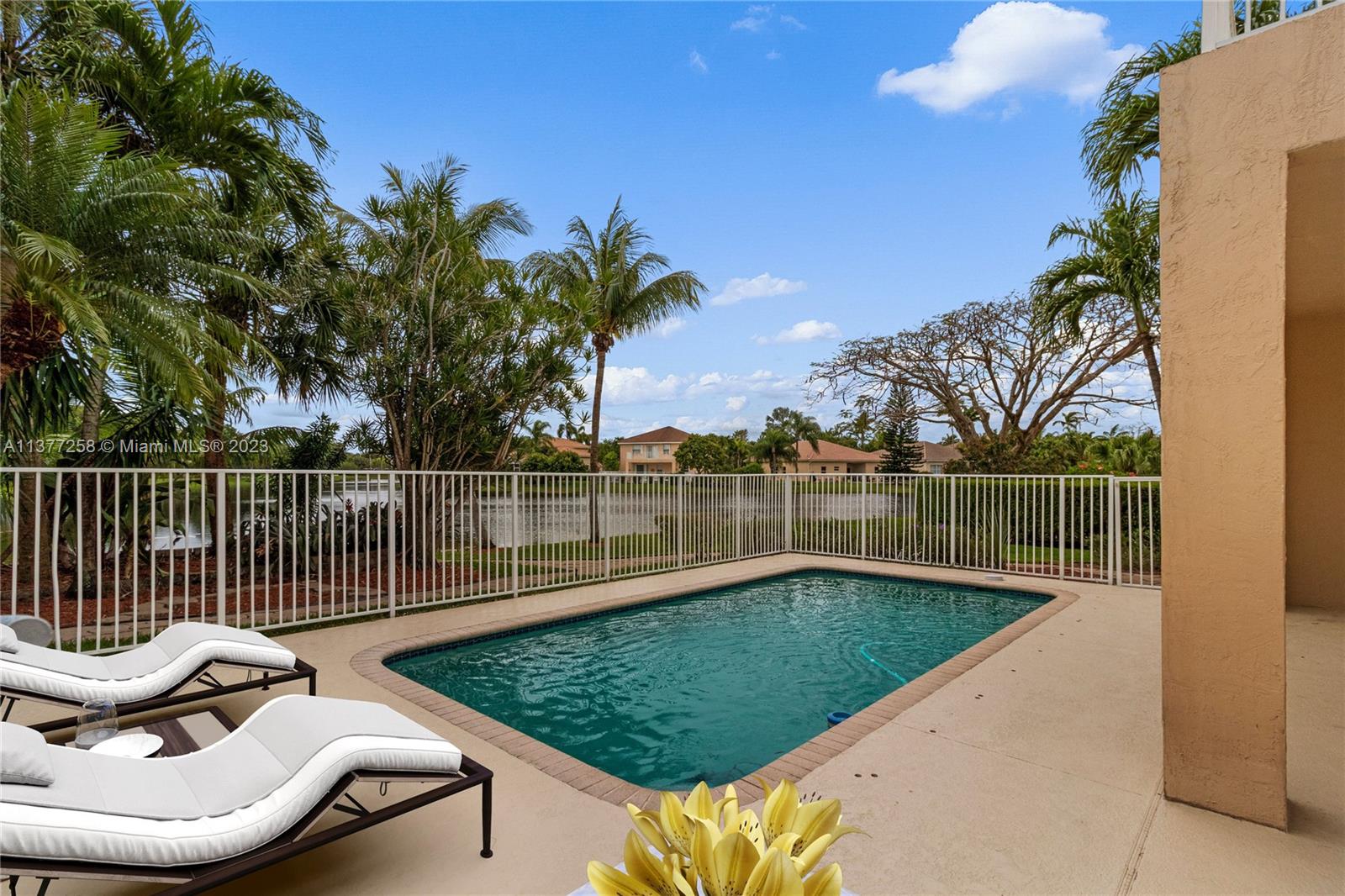 Best buy in Weston! Spectacular pool, lagoon & garden views abound from this two story 4 bedroom, 2.5 bath home located at Sapphire Isle in the Emerald Estates community. Features include updated kitchen & baths, marble floors downstairs & wood floors upstairs. Large primary suite offers sitting area, private balcony overlooking the pool and lagoon plus large walk-in closet & second closet, spacious primary bath includes dual vanities, tub & separate shower. All bedrooms are upstairs. Home is on a large fenced corner lot with meandering walk paths through lush, tropical landscaping. Community amenities include swimming pool, fitness room & playground. Outside the gates is Emerald Estates Public Park w/tennis & basketball courts, picnic pavilions & more. Furnishings are virtually staged.