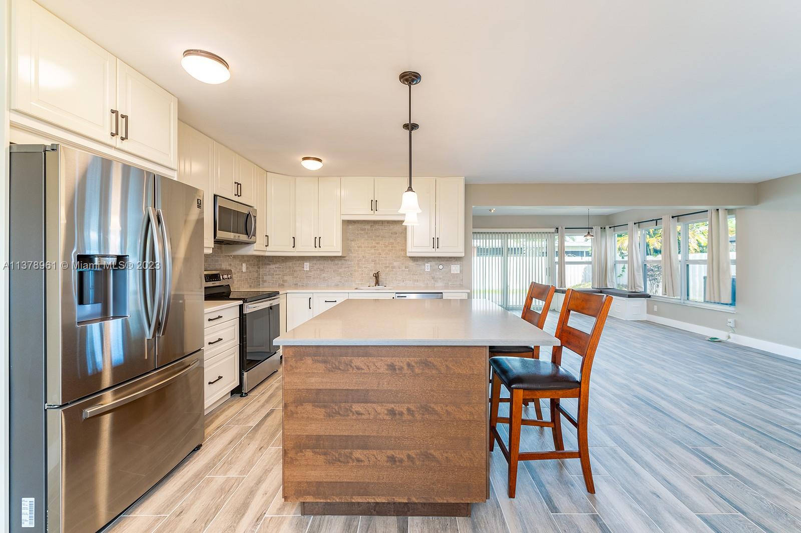 Completely remodeled home with over $60,000 worth of upgrades in Pembroke Pines! Come and see this turnkey home featuring an open layout with brand new tile wood flooring throughout the home. The kitchen has been redone to include new appliances, wood cabinets, quartz counters, and an eat-in island. This home has two full bedrooms with updated bathrooms and includes an extra den/office/room split from the other bedrooms for privacy. This is not where the updates stop, this home has a laundry list of new features including: new hurricane impact windows, new roof, newer A/C, new lighting, and a fresh coat of paint! The yard opens up to a brand new deck, perfect for entertaining and with plenty of avocados from the fruit tree! A circular driveway and garage complete this home. No work needed!