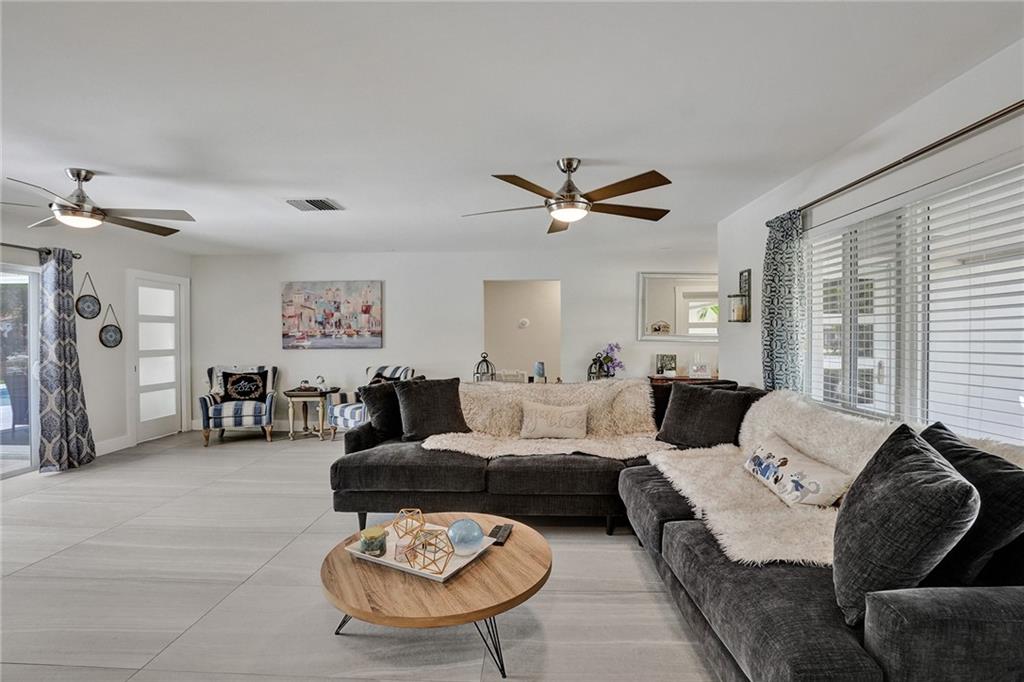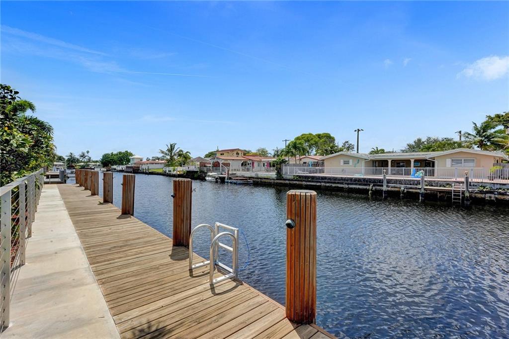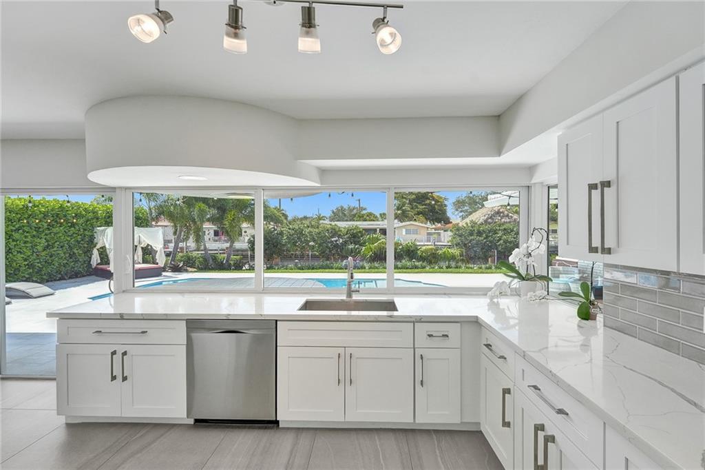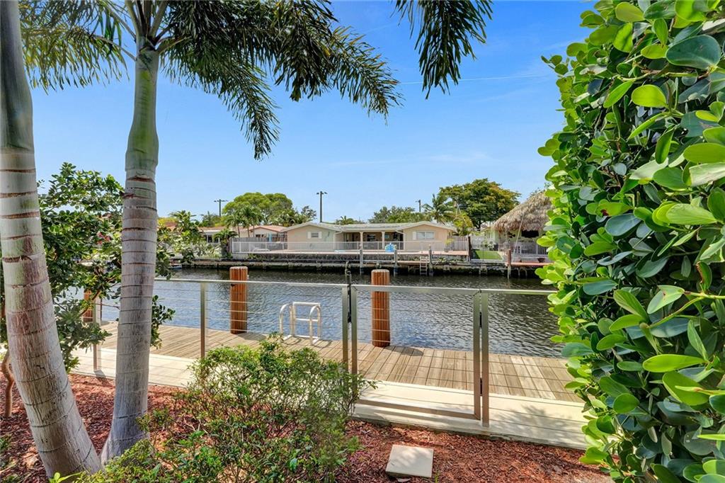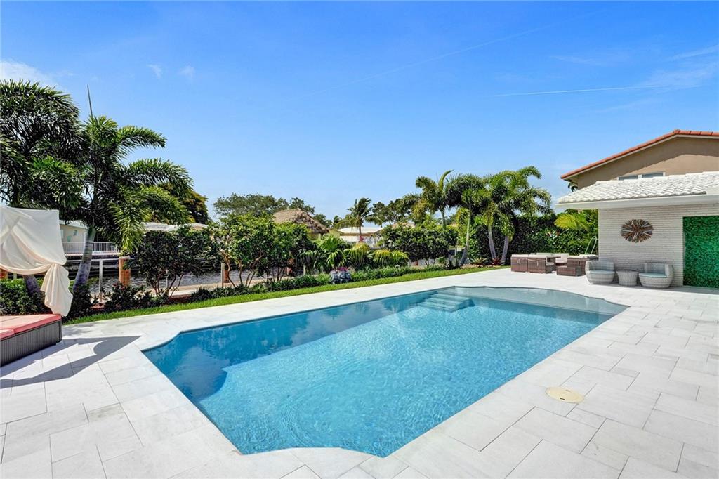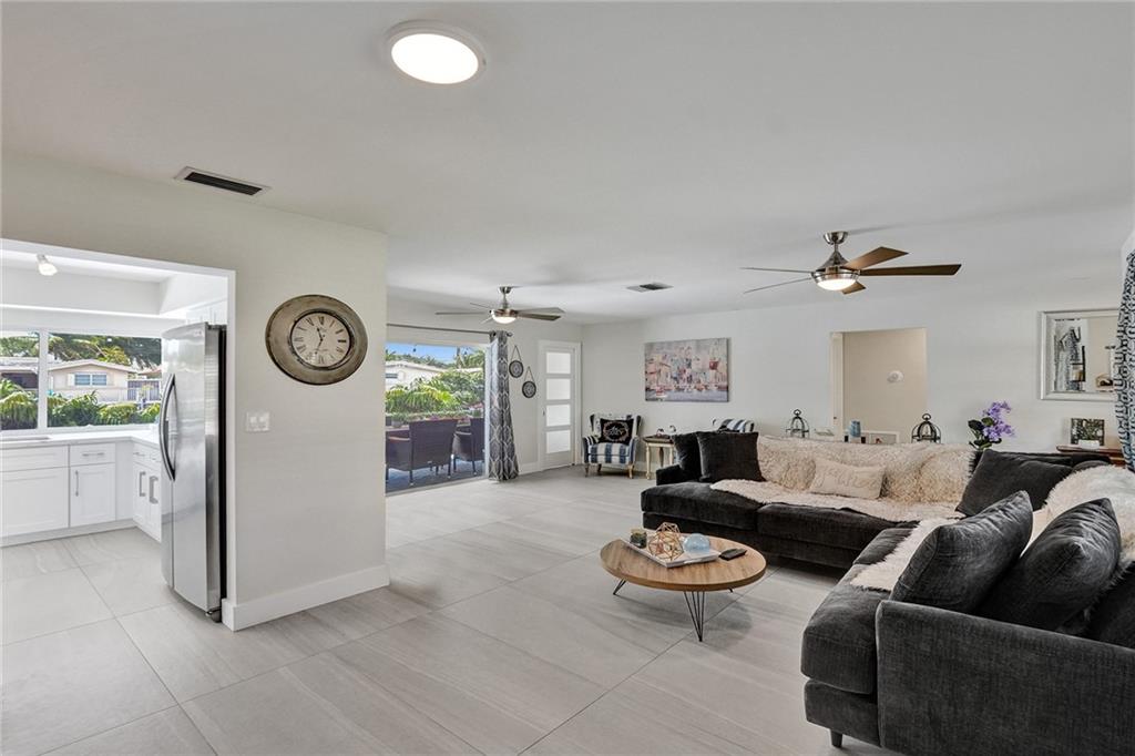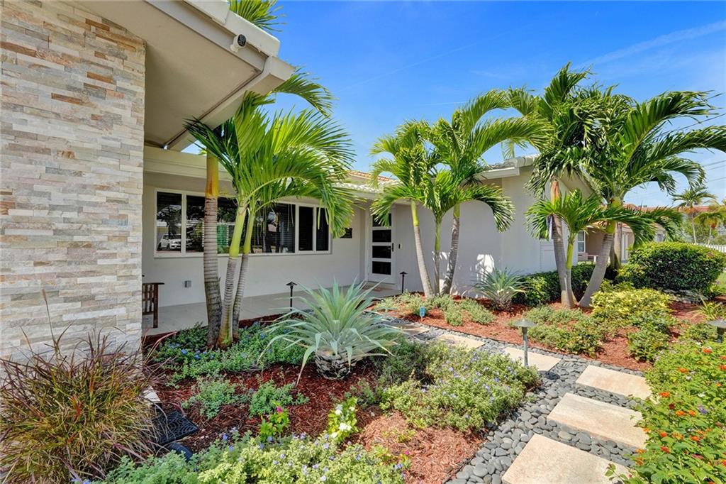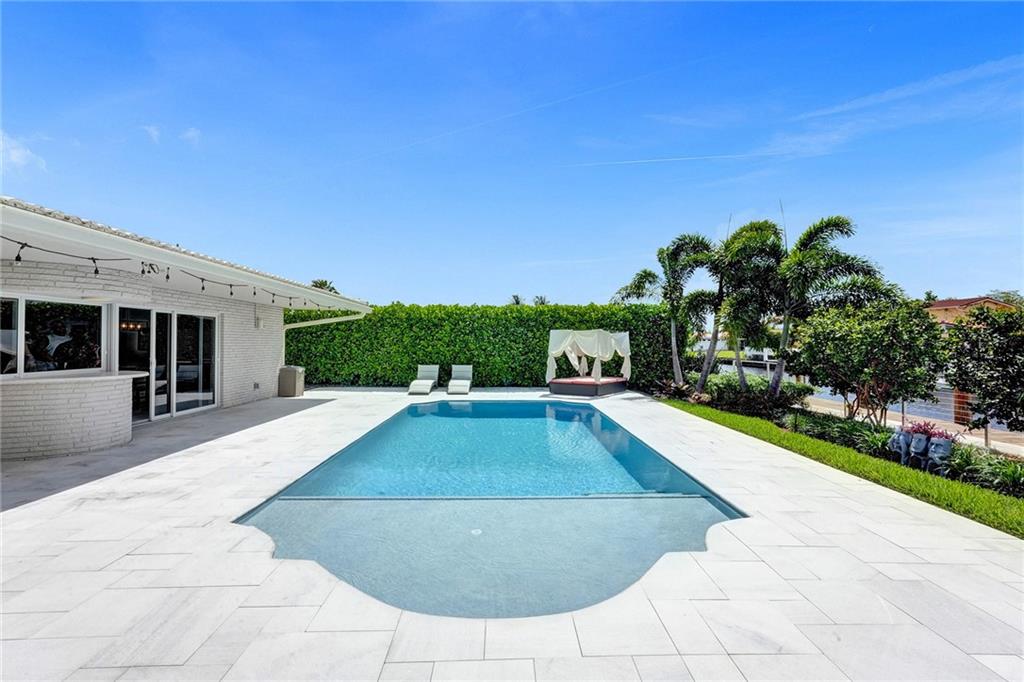 Stunning turnkey Coral Ridge Isles Waterfront property! Over 277k worth of upgrades with current owners, all permitted!! Three sun drenched bedrooms each with walk in closets and 2 oversized bathrooms with dual sinks draped in Calcutta Quartz countertops. 24x48 Porcelain Stone flooring throughout seamlessly transitioning one living space to the next. Large bright kitchen is equipped with solid wood shaker style cabinetry, Calcutta Quartz countertops and top of the line Stainless Steel Appliances. Backyard features 75 linear feet of waterfront, sparkling resort style pool and patio. Brand new seawall and full length dock with electric add extra charm to this already amazing property. Hurricane Impact windows and doors throughout plus 2 car garage. No HOA! Don't walk to this property...run!