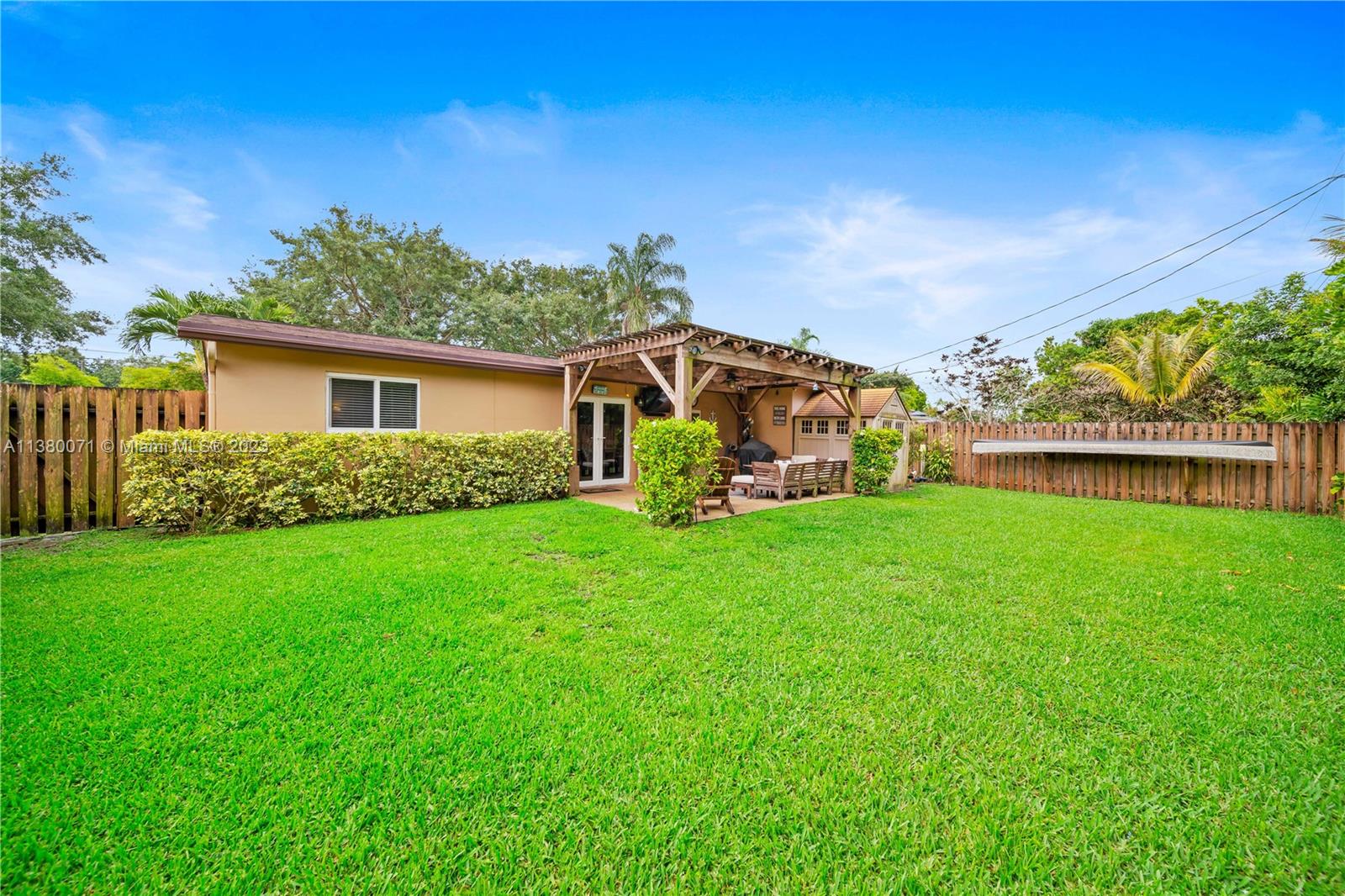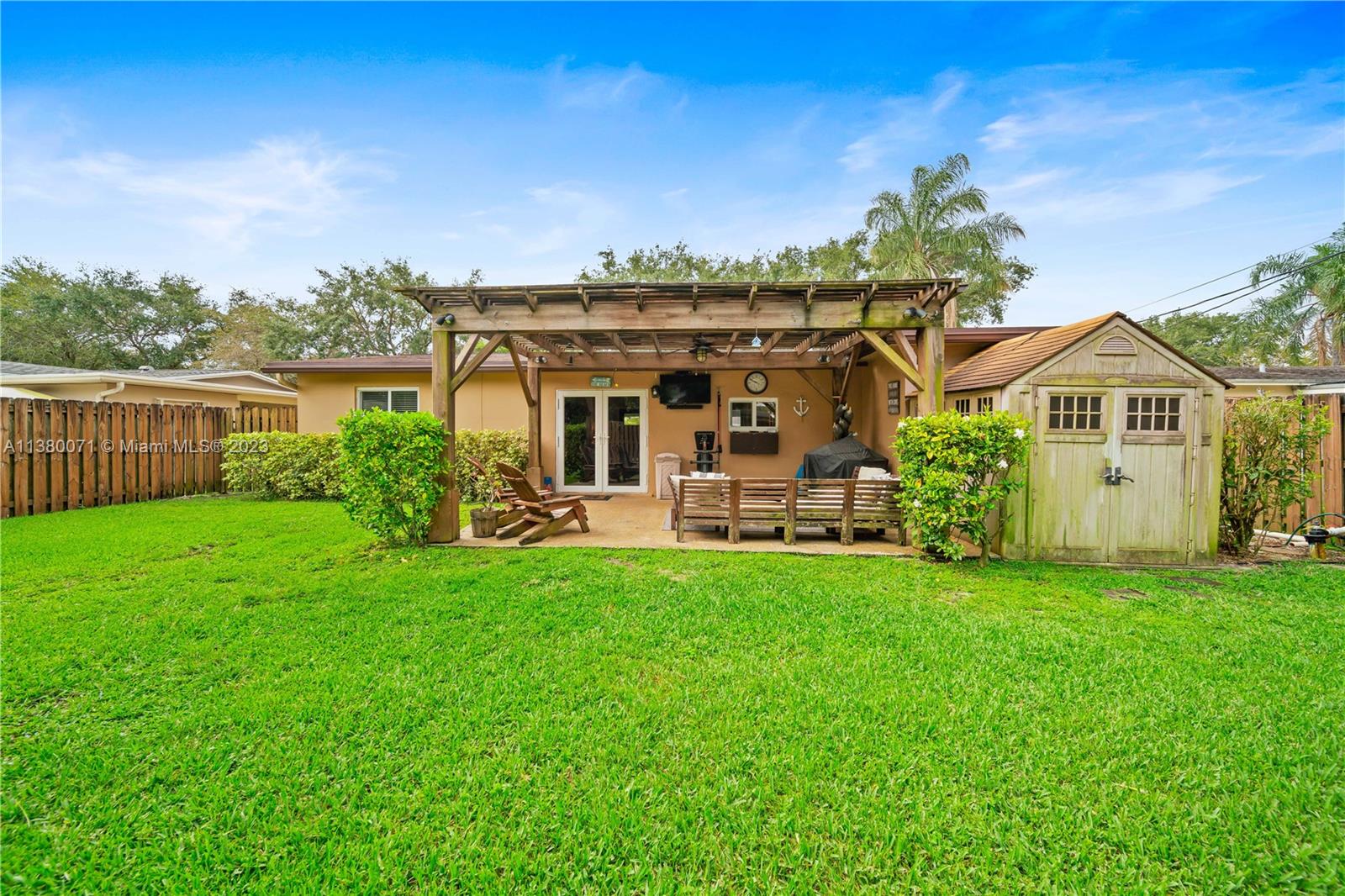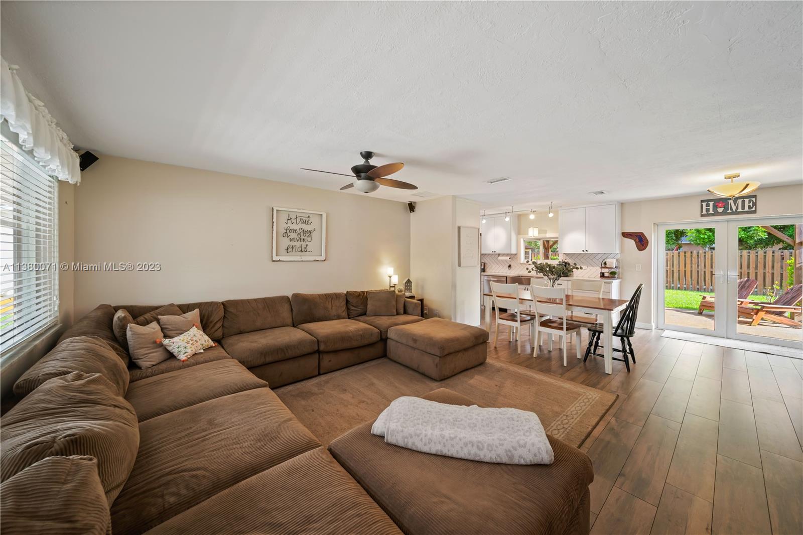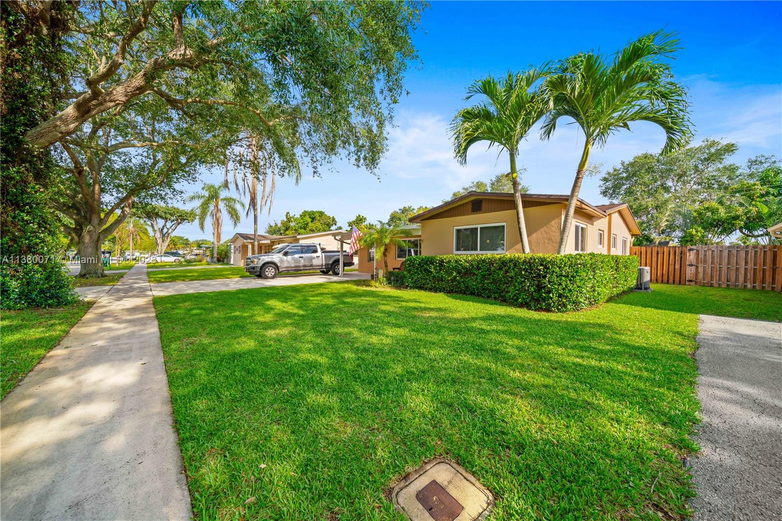 Beautifully updated family home in the heart of Cooper City! Open floor plan highlights the sleek kitchen with white quartz countertops, farmhouse sink, stainless appliances, and built-in office area. Spacious living/dining room with French doors to patio. Primary bedroom has wood slat ceiling, crown molding, and walk-in closet. Both bathrooms have been renovated, with a spa tub in the hall bath. Tile floors (with wood look) throughout. Interior utility closet. Newer A/C system. IMPACT GLASS windows and doors. Big fenced back yard with gazebo-style patio and storage shed ... and plenty of room for a pool. Double wide driveway. Covered front patio. Roof replaced in 2014. EXCELLENT SCHOOLS ... all A-rated. Nearby shopping, restaurants, access to highways.