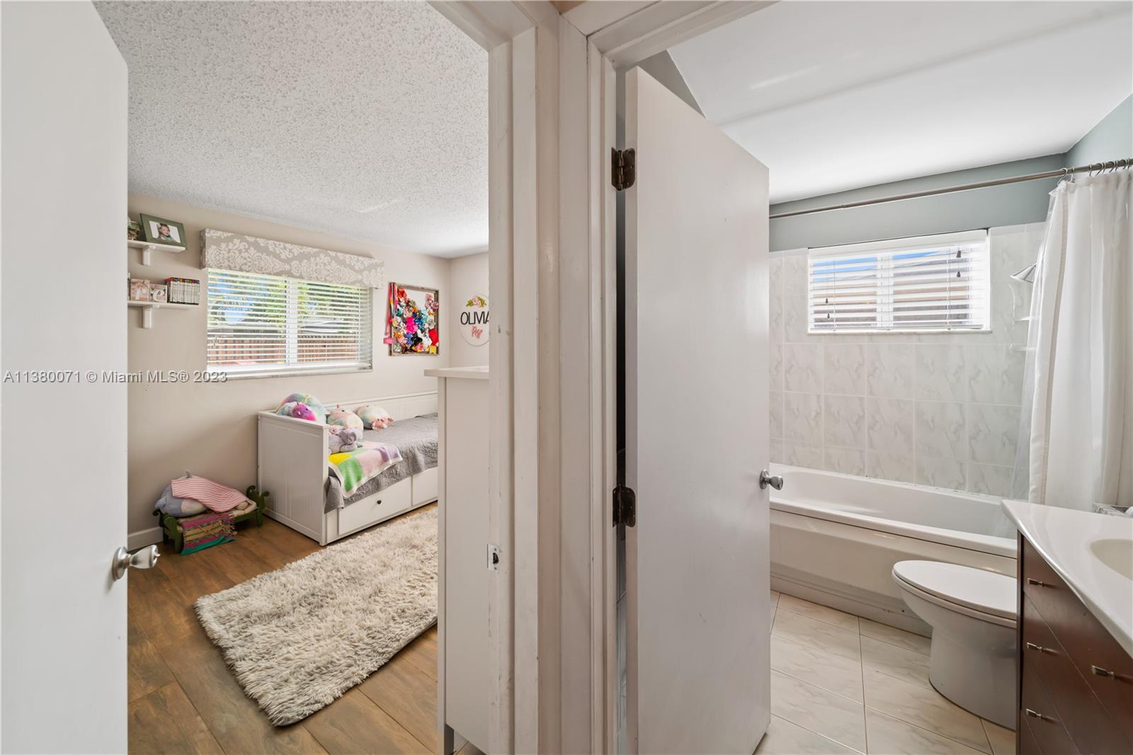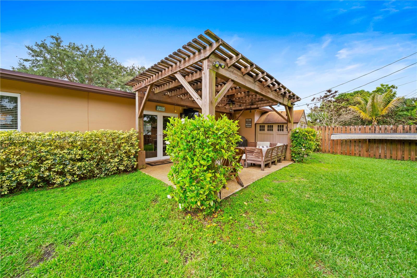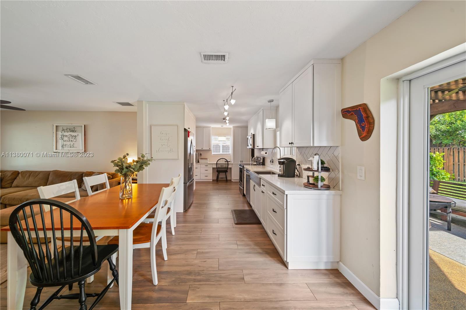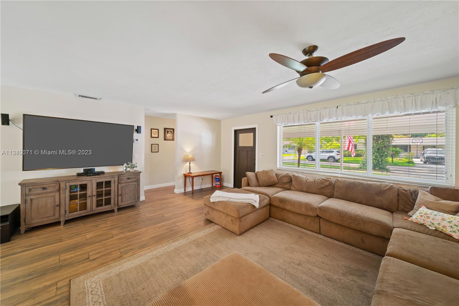 Beautifully updated family home in the heart of Cooper City! Open floor plan highlights the sleek kitchen with white quartz countertops, farmhouse sink, stainless appliances, and built-in office area. Spacious living/dining room with French doors to patio. Primary bedroom has wood slat ceiling, crown molding, and walk-in closet. Both bathrooms have been renovated, with a spa tub in the hall bath. Tile floors (with wood look) throughout. Interior utility closet. Newer A/C system. IMPACT GLASS windows and doors. Big fenced back yard with gazebo-style patio and storage shed ... and plenty of room for a pool. Double wide driveway. Covered front patio. Roof replaced in 2014. EXCELLENT SCHOOLS ... all A-rated. Nearby shopping, restaurants, access to highways.
