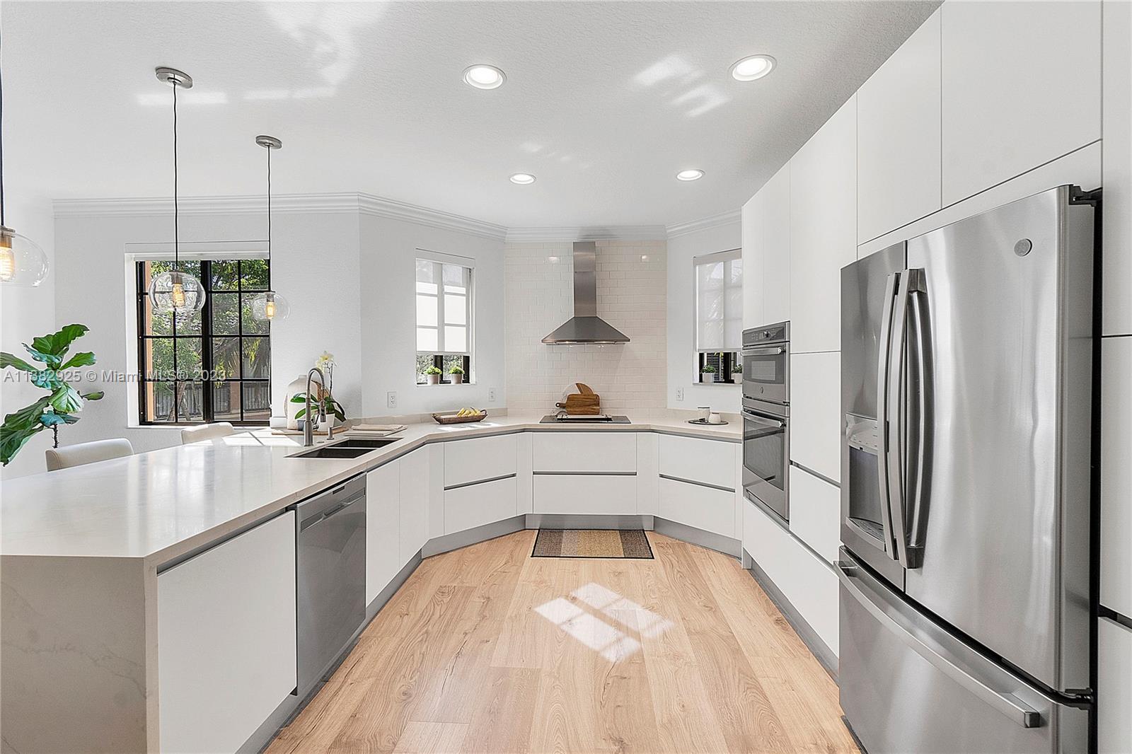 This stunning residence boasts a Modern-style garden and a private gated courtyard. Featuring 3 Bedrooms + Office/Den, 2 1/2 Bathrooms, 2 Car Garage, situated within the prestigious Weston Hills Country Club. This home has been tastefully renovated to include modern upgrades such as new flooring, stylishly updated bathrooms, and an open concept kitchen featuring elegant white quartz countertops and stainless steel appliances.