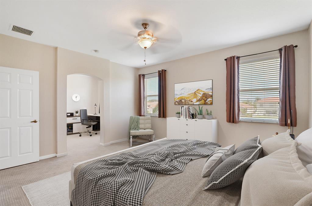 Welcome to your stunning 5-bedroom, 3-bath, 3-car garage home with a den/office, plus a spacious loft! The downstairs bedroom is perfect as an in-law or guest suite. This home offers expansive living and family rooms with volume ceilings that give the space an open and airy feel. The designer kitchen boasts gorgeous granite counters and a convenient island that's perfect for cooking and entertaining. You'll find plenty of space for everyone, with a den and loft area to accommodate your large family. With tile downstairs and plush carpeting upstairs and in the bedrooms, this home is both stylish and comfortable. Plus, the gated community provides an added sense of security and peace of mind.