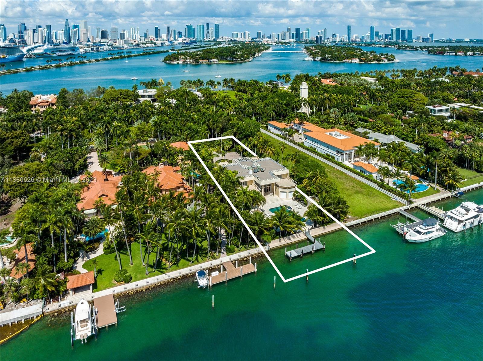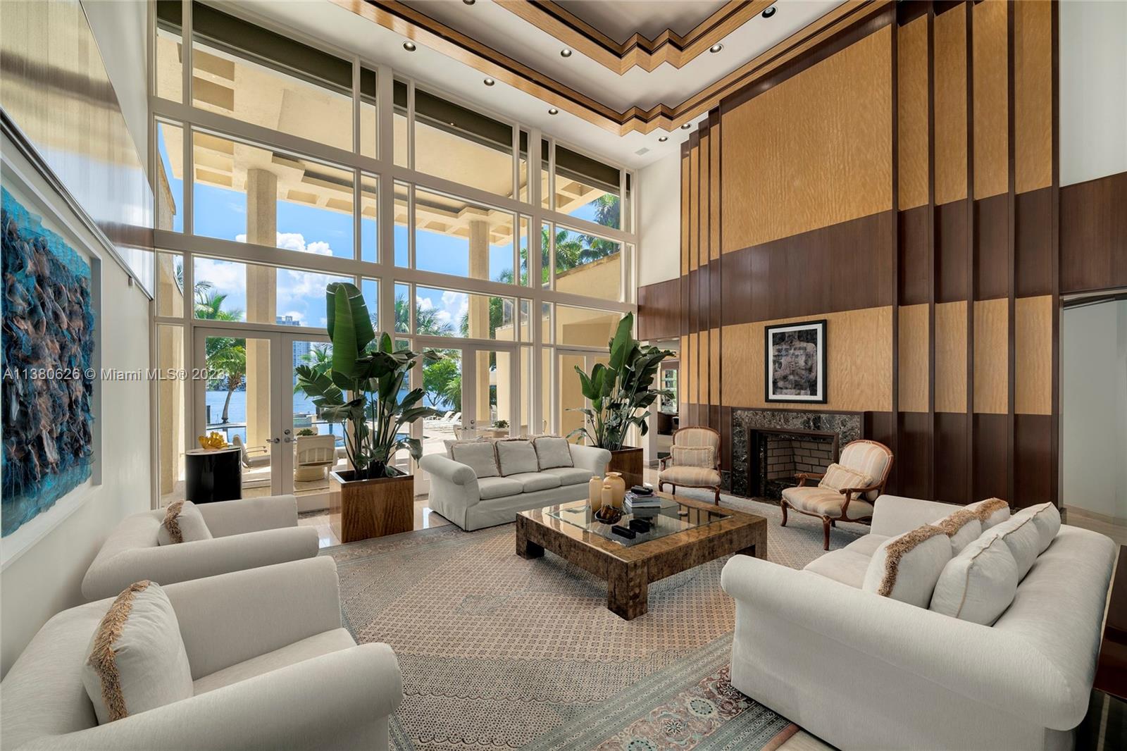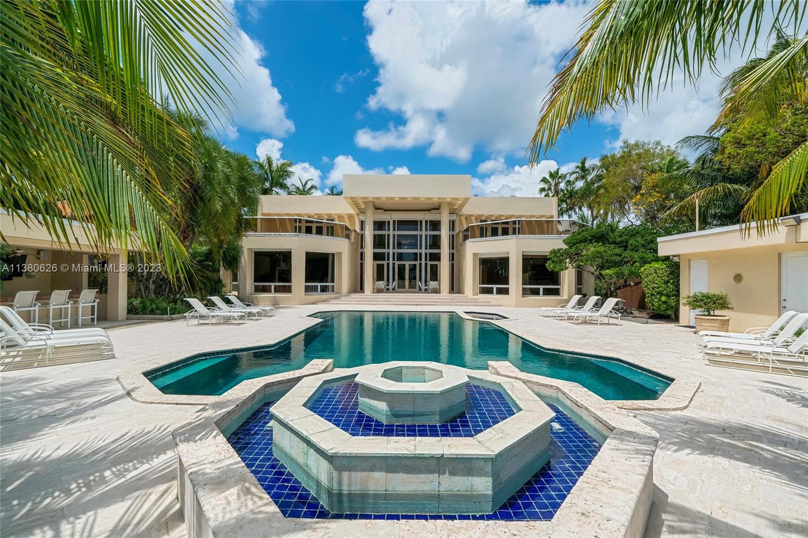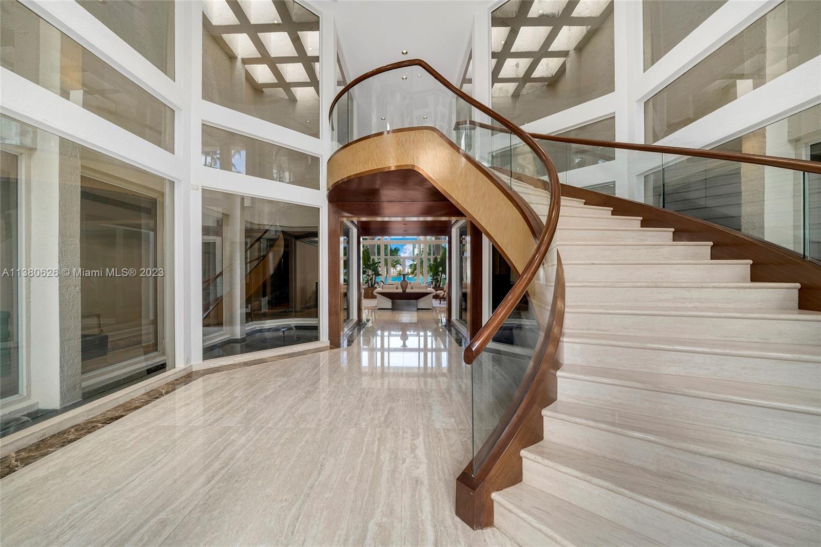 Located on exclusive guard-gated Star Island this residence boasts a manicured 40,000 SF lot, and actual area of 12,374 SF, 6BR plus an office, 8+1BA, and 100FT of sparkling waterfront. Impressive foyer with soaring 30+FT ceilings and custom staircase, exquisite Travertine floors and custom millwork throughout, expansive living room and entertainment room/bar all with large windows and amazing views to the pool and bay. A private dining area, chef’s kitchen with top-of-the-line appliances and a separate breakfast room. The large bay-facing principal suite features dual walk-in closets and dual bathrooms. Upstairs has 4 large guest bedrooms with en-suite baths & oversized Plaza Deck terraces. Heated pool, summer kitchen, 40FT dock, direct bay & ocean access plus amazing central location.