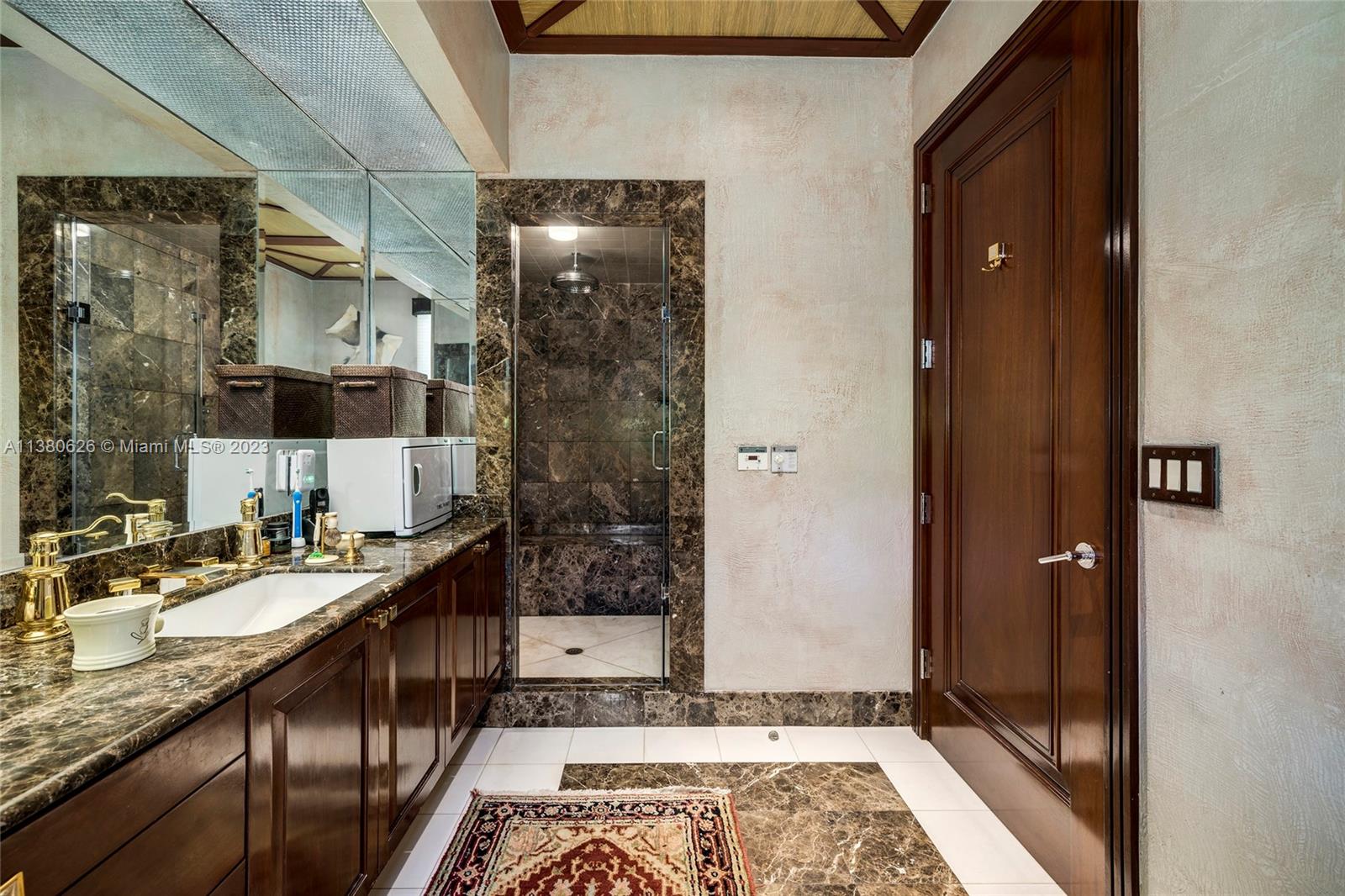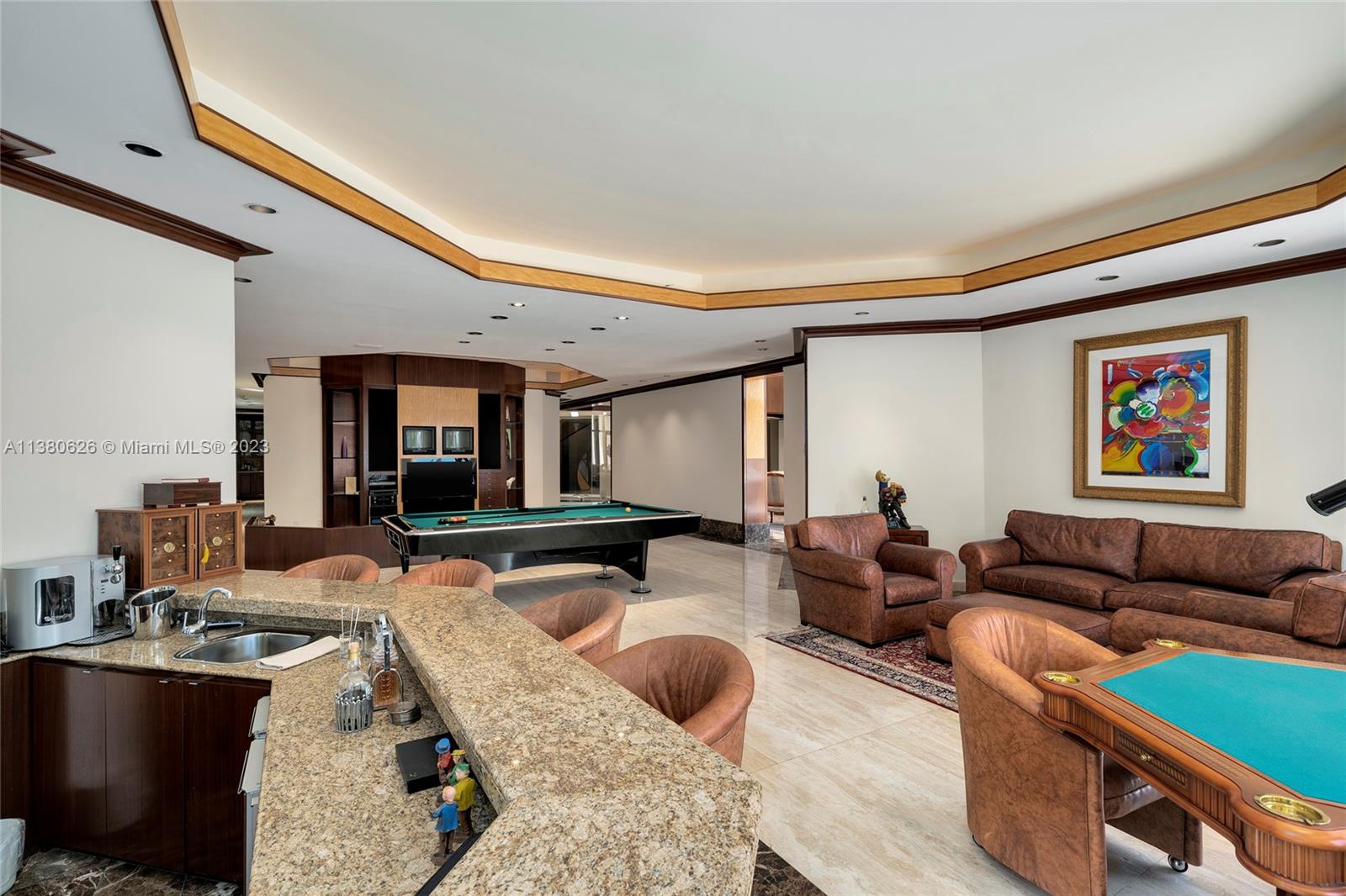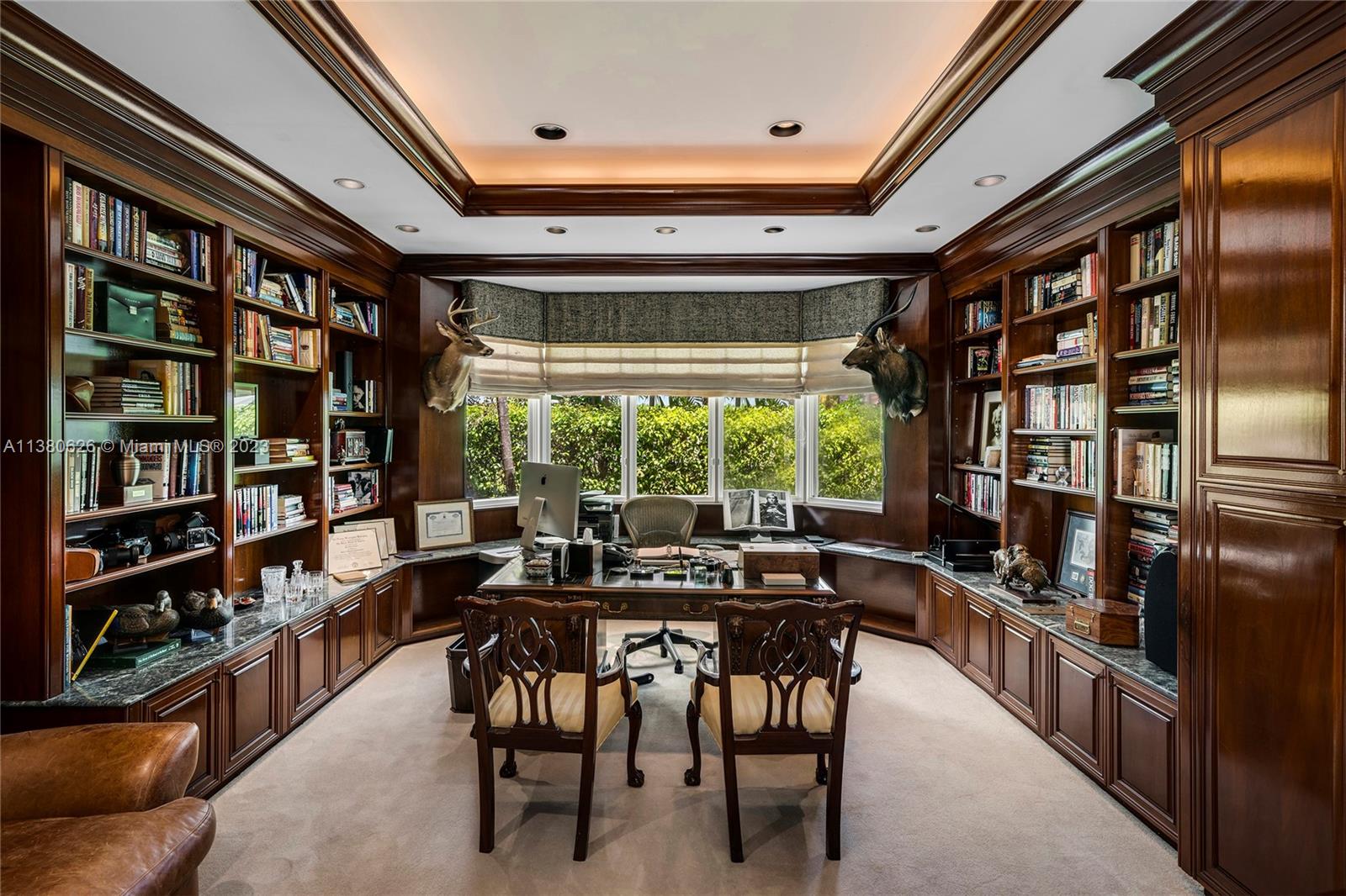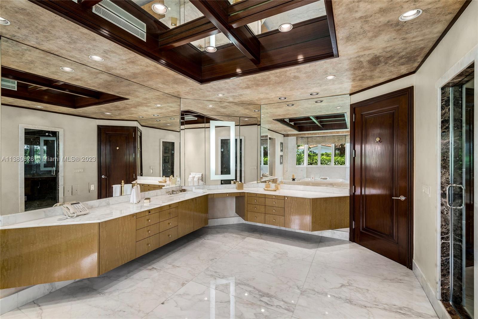 Located on exclusive guard-gated Star Island this residence boasts a manicured 40,000 SF lot, and actual area of 12,374 SF, 6BR plus an office, 8+1BA, and 100FT of sparkling waterfront. Impressive foyer with soaring 30+FT ceilings and custom staircase, exquisite Travertine floors and custom millwork throughout, expansive living room and entertainment room/bar all with large windows and amazing views to the pool and bay. A private dining area, chef’s kitchen with top-of-the-line appliances and a separate breakfast room. The large bay-facing principal suite features dual walk-in closets and dual bathrooms. Upstairs has 4 large guest bedrooms with en-suite baths & oversized Plaza Deck terraces. Heated pool, summer kitchen, 40FT dock, direct bay & ocean access plus amazing central location.