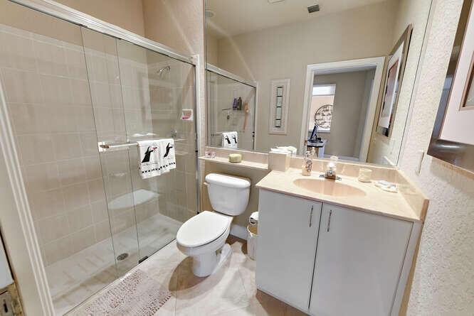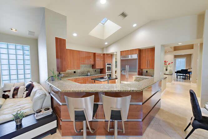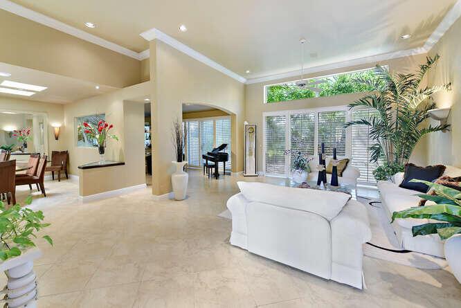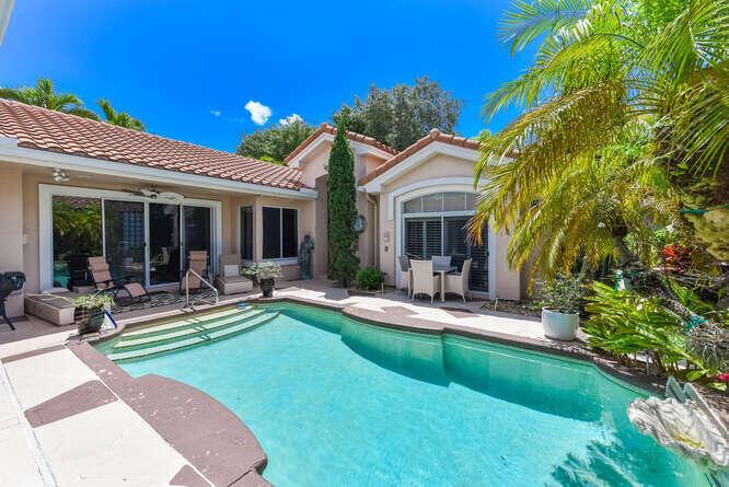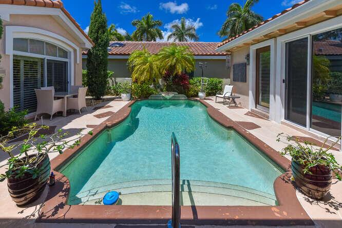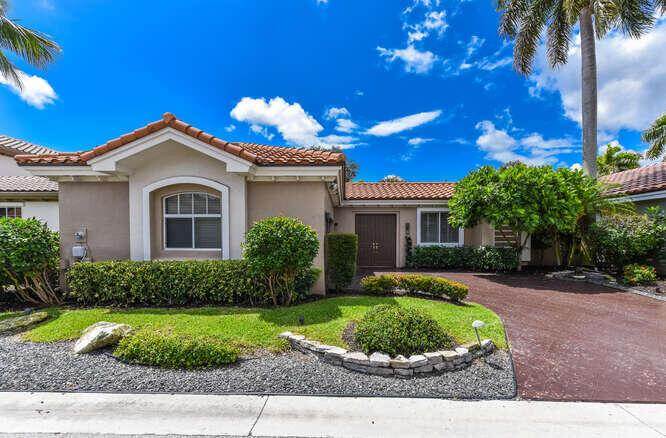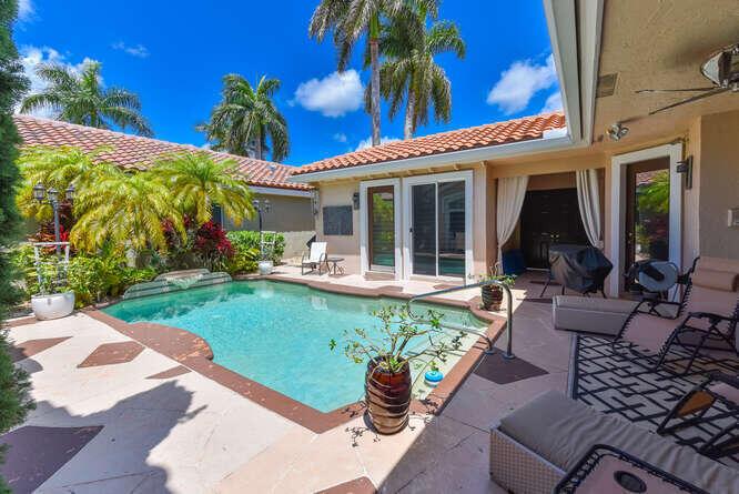 Contemporary Courtyard home in ever popular Santa Barbara. Located in central Boca Raton, near Town Center and local schools. Completely furnished in neutral colors with tile thru out , volume ceilings , french doors , open kitchen with stainless steel appliances and granite counters. Separate guess house with bedroom and full bath in a courtyard setting. Move right in to this lovely modern home. Gated community with tennis courts, pool and fitness center.