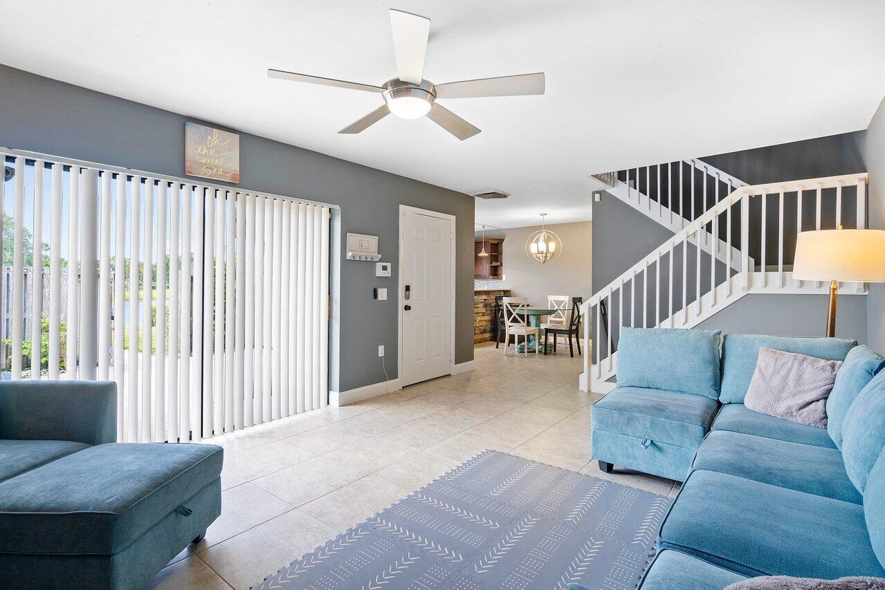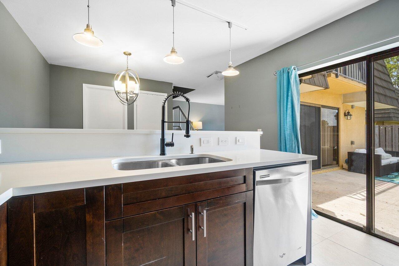 Highly desirable LAKE VIEW 2/2 townhome w/ large, fenced patio! Beautifully updated kitchen with newer shaker wood cabinets, mosaic tile backsplash, quartz countertops & newer appliances. Neutral tile throughout first floor and laminate flooring upstairs - no carpet!This unit is unlike any other - completely private - away from the parking lot and no other unit is in view when you are gazing out the windows! Perfect for entertaining as the sliding doors from the kitchen and family room spill out onto the huge 13X21 fenced patio - enjoy hosting your friends and family. Upstairs has split bedrooms for optimum privacy - bedrooms do not share a wall. Perfect for light sleepers or roommate set up! Full-size washer and dryer.