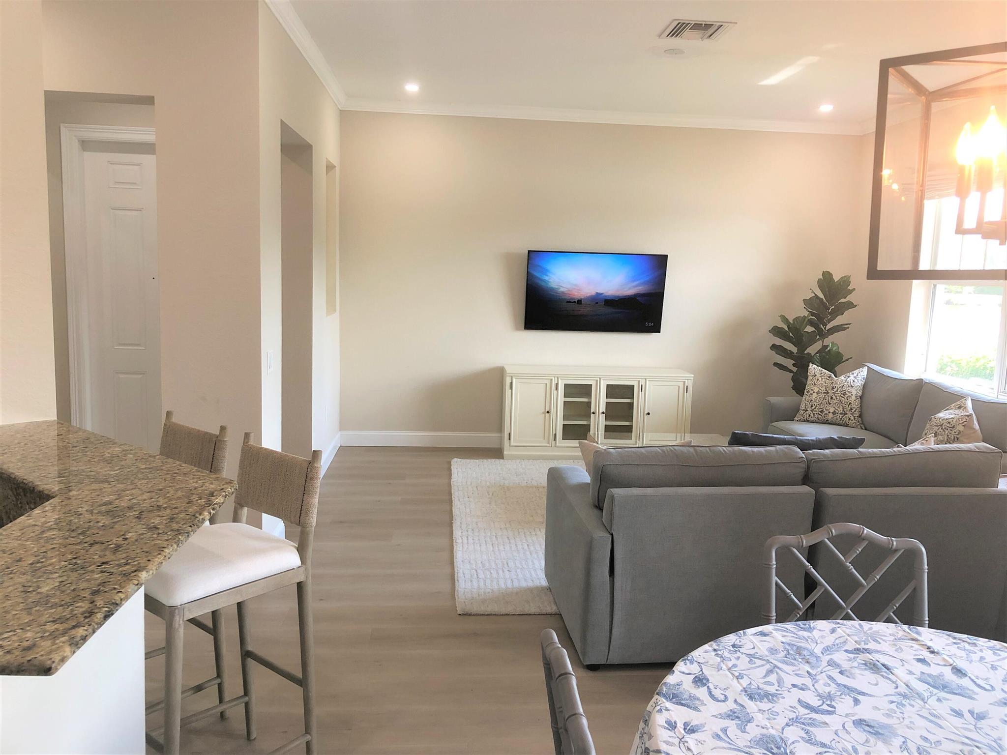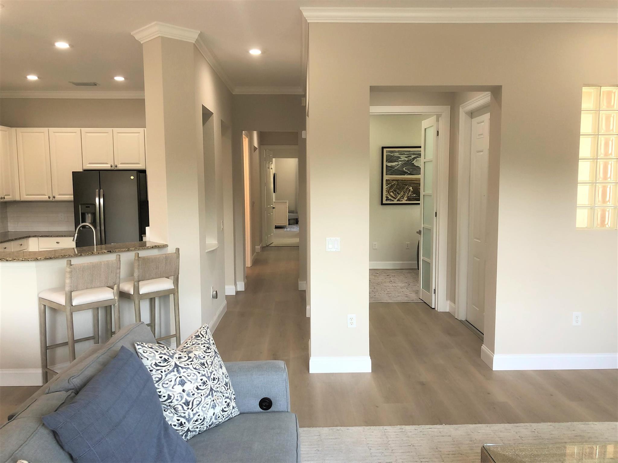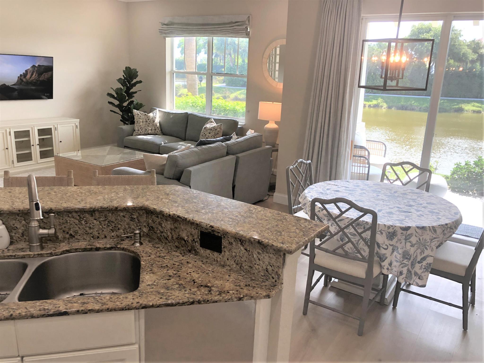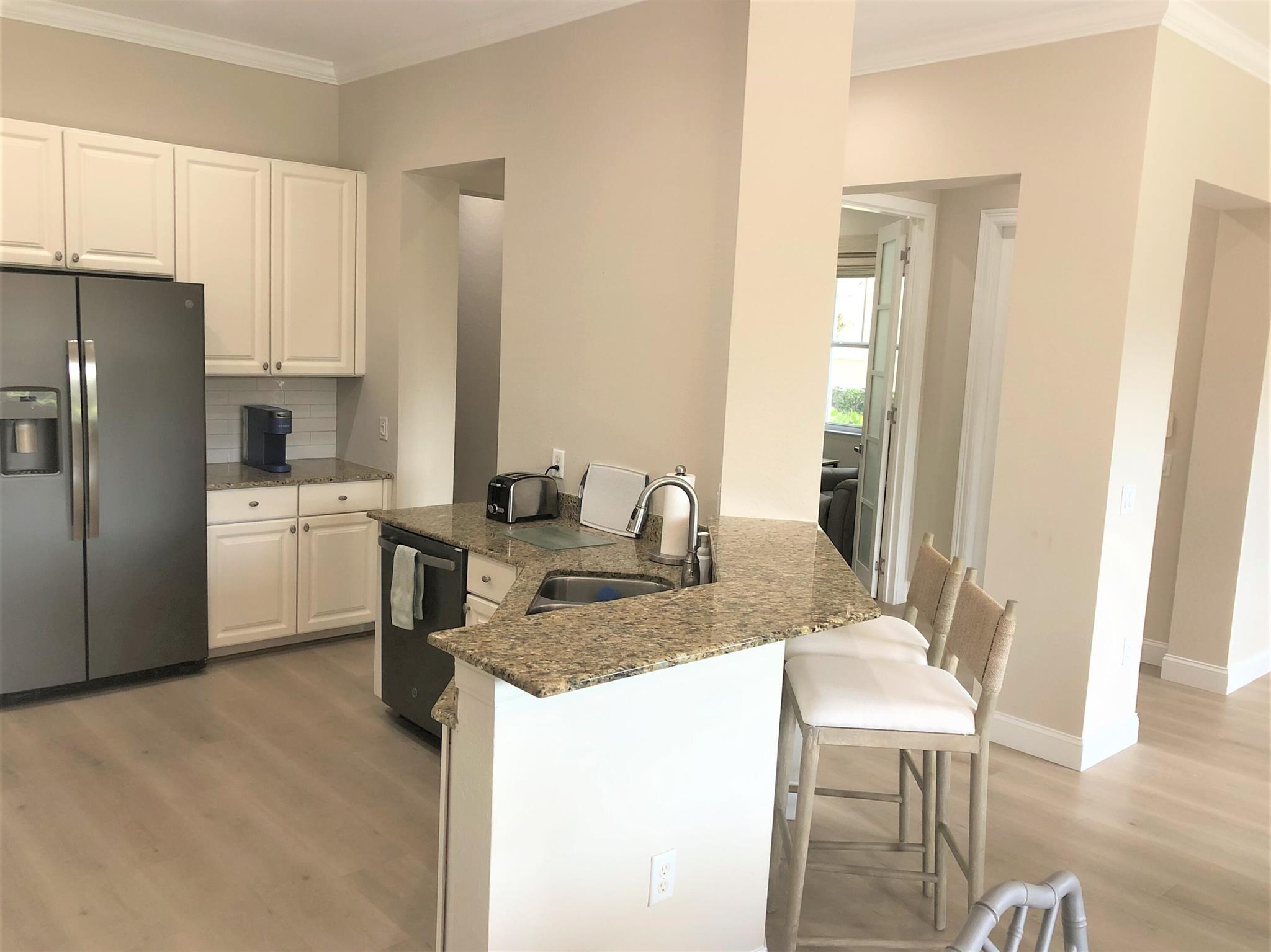 RARE!! Enjoy sunsets over the water from your patio in this ranch-style Santa Barbara lakeside model. Updated private corner unit. New floors & recessed lighting throughout. Kitchen features granite counters with GE Slate appliances, beautiful subway tile backsplash and 42'' cabinets. This tastefully appointed townhome is awash in natural light with soaring 10ft ceilings & inviting neutral tones to compliment. Primary suite features dual vanity sinks and spacious walk-in closet with plenty of shelving & storage. 3rd bedroom converted to den / office. Great location! A hidden gem only 5 minutes from downtown, I-95 & PBIA. Walking distance to the the new Outlet Shoppes, Whole Foods, Target and several restaurants. Community amenities include high speed wifi & cable service, water,