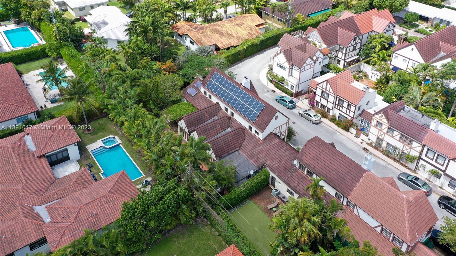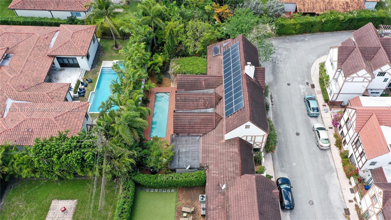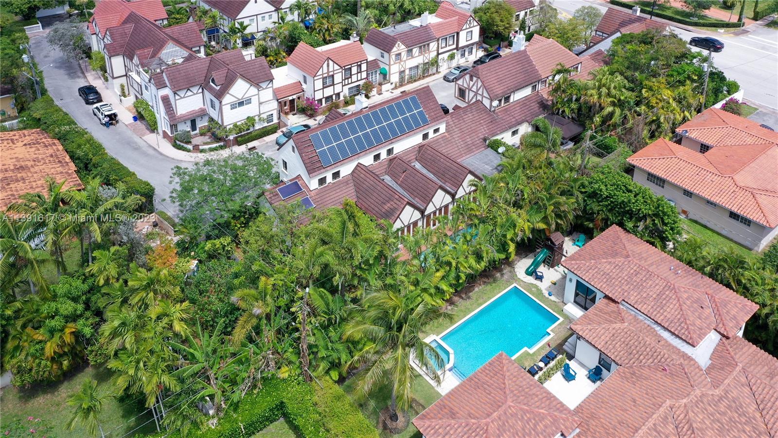 New Listing! Once-in-a-blue-moon opportunity to make one of George Merrick’s original historic villages your home. Nestled within the French Normandy Village, this unique home boasts the only swimming pool and has the largest sq. ft. and land within the neighborhood. Additionally, the house is designed to be environmentally efficient with 28 solar panels and high-end recycled materials throughout. This one-of-a-kind property has over 3,500 adj. sq. ft. High-ceiling living room. Dining room, 2 fireplaces, eat-in kitchen, huge family room with French doors opening to brick patio and pool. 2 master suites - one up and one down, additional bdrm up, library, sitting room, nursery or office, laundry room & 3.5 baths. Lushly landscaped, walled garden. The home can also be enlarged to 5 bedrooms.