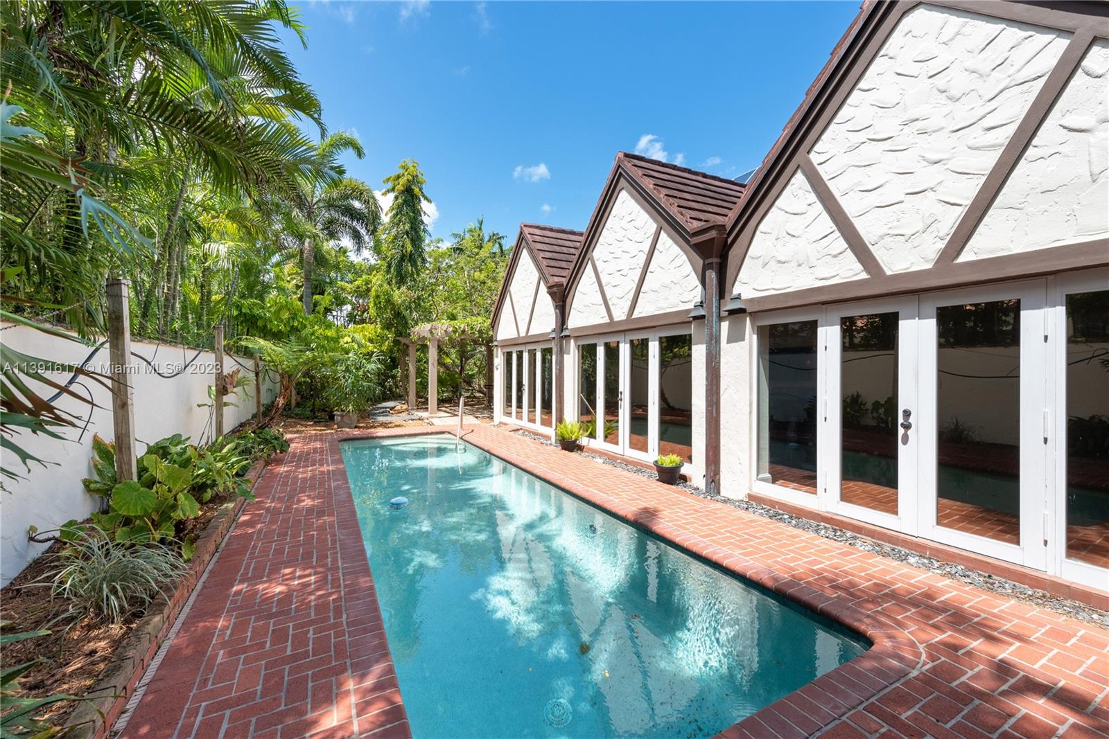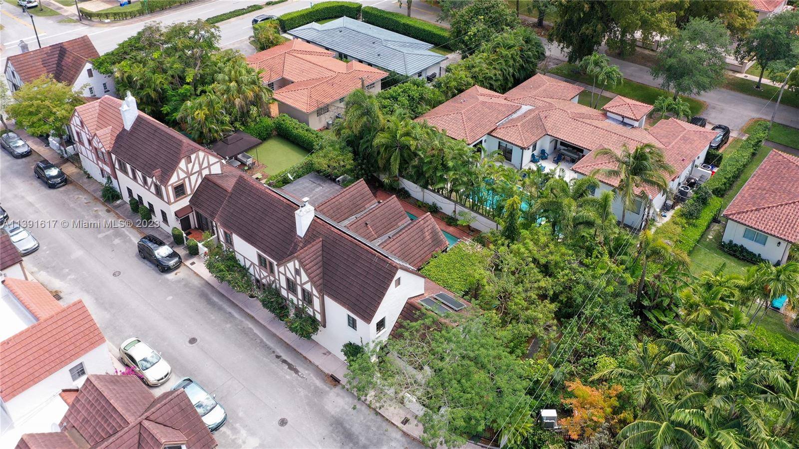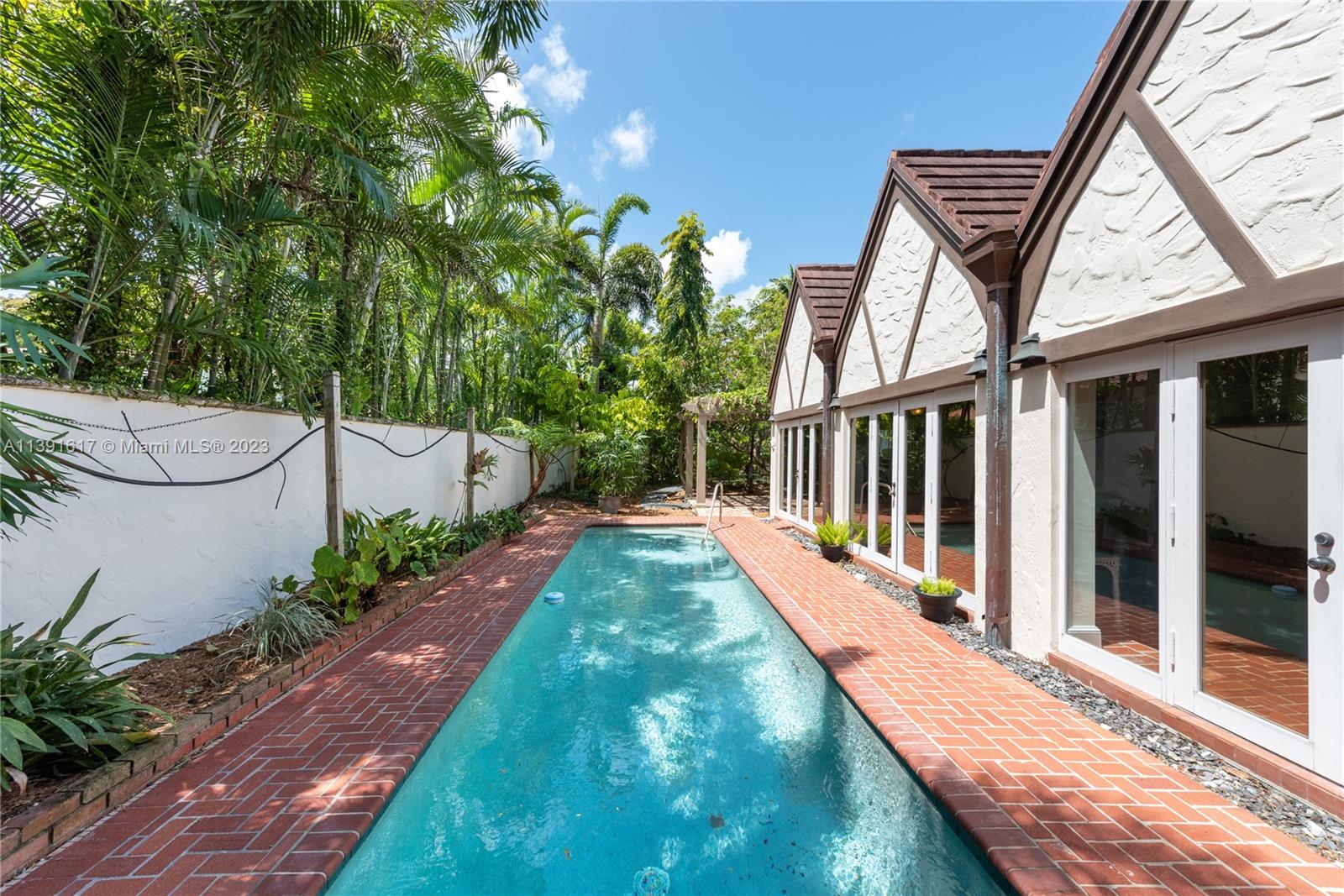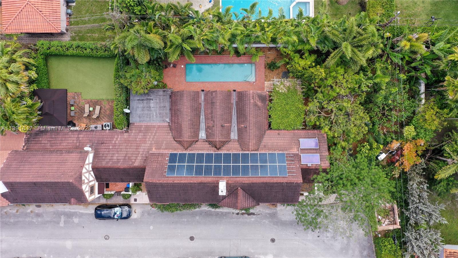 New Listing! Once-in-a-blue-moon opportunity to make one of George Merrick’s original historic villages your home. Nestled within the French Normandy Village, this unique home boasts the only swimming pool and has the largest sq. ft. and land within the neighborhood. Additionally, the house is designed to be environmentally efficient with 28 solar panels and high-end recycled materials throughout. This one-of-a-kind property has over 3,500 adj. sq. ft. High-ceiling living room. Dining room, 2 fireplaces, eat-in kitchen, huge family room with French doors opening to brick patio and pool. 2 master suites - one up and one down, additional bdrm up, library, sitting room, nursery or office, laundry room & 3.5 baths. Lushly landscaped, walled garden. The home can also be enlarged to 5 bedrooms.