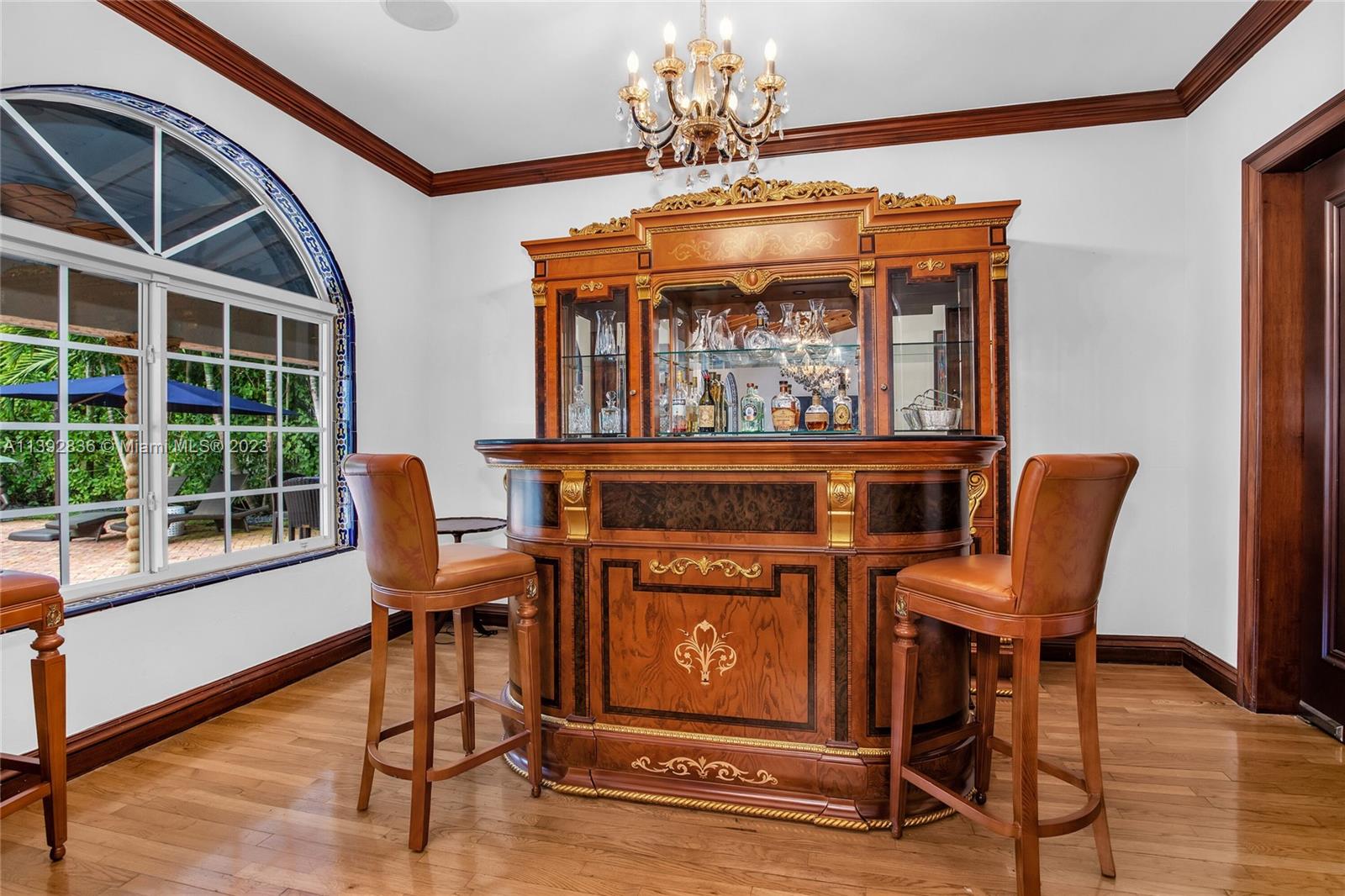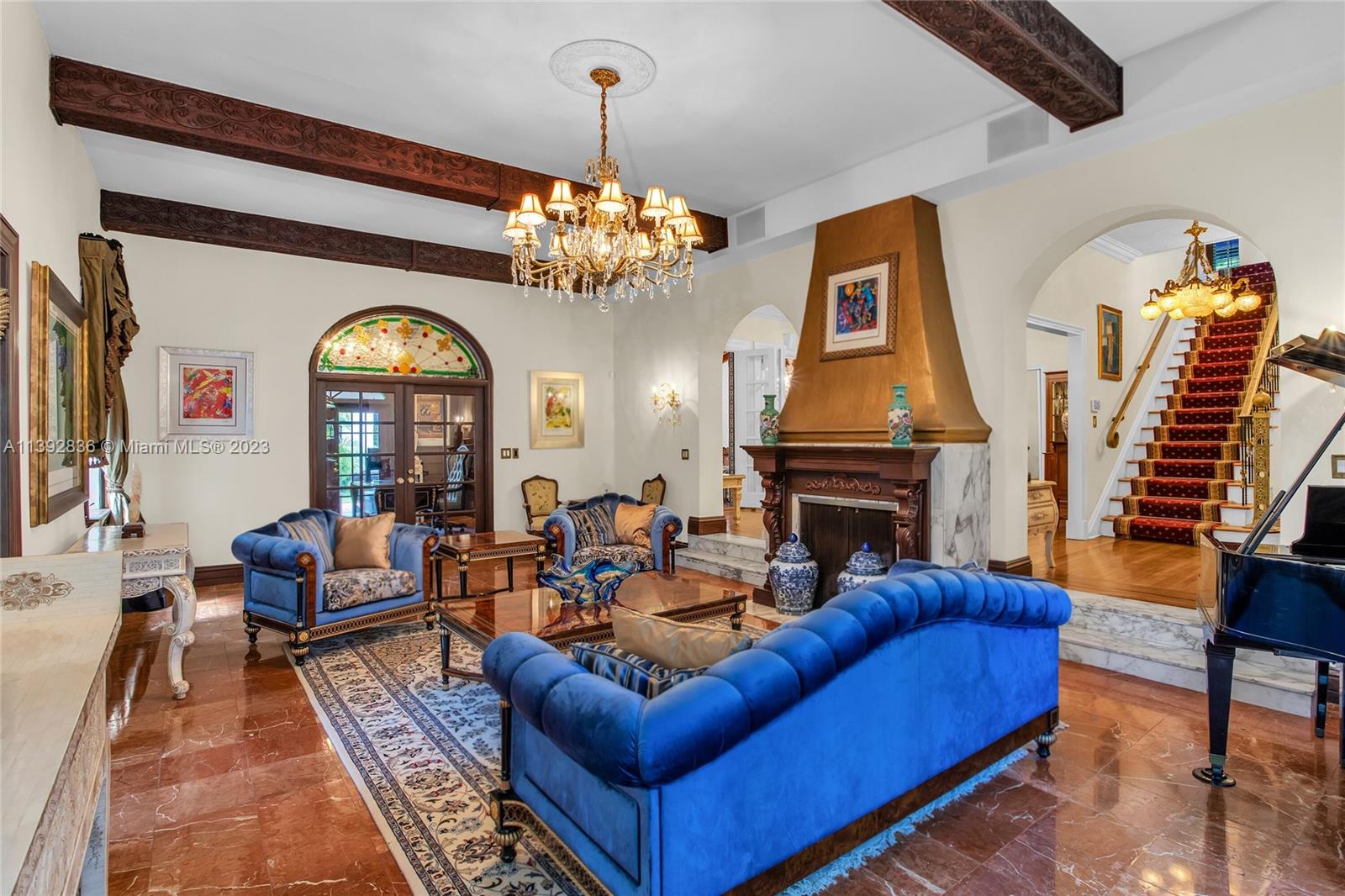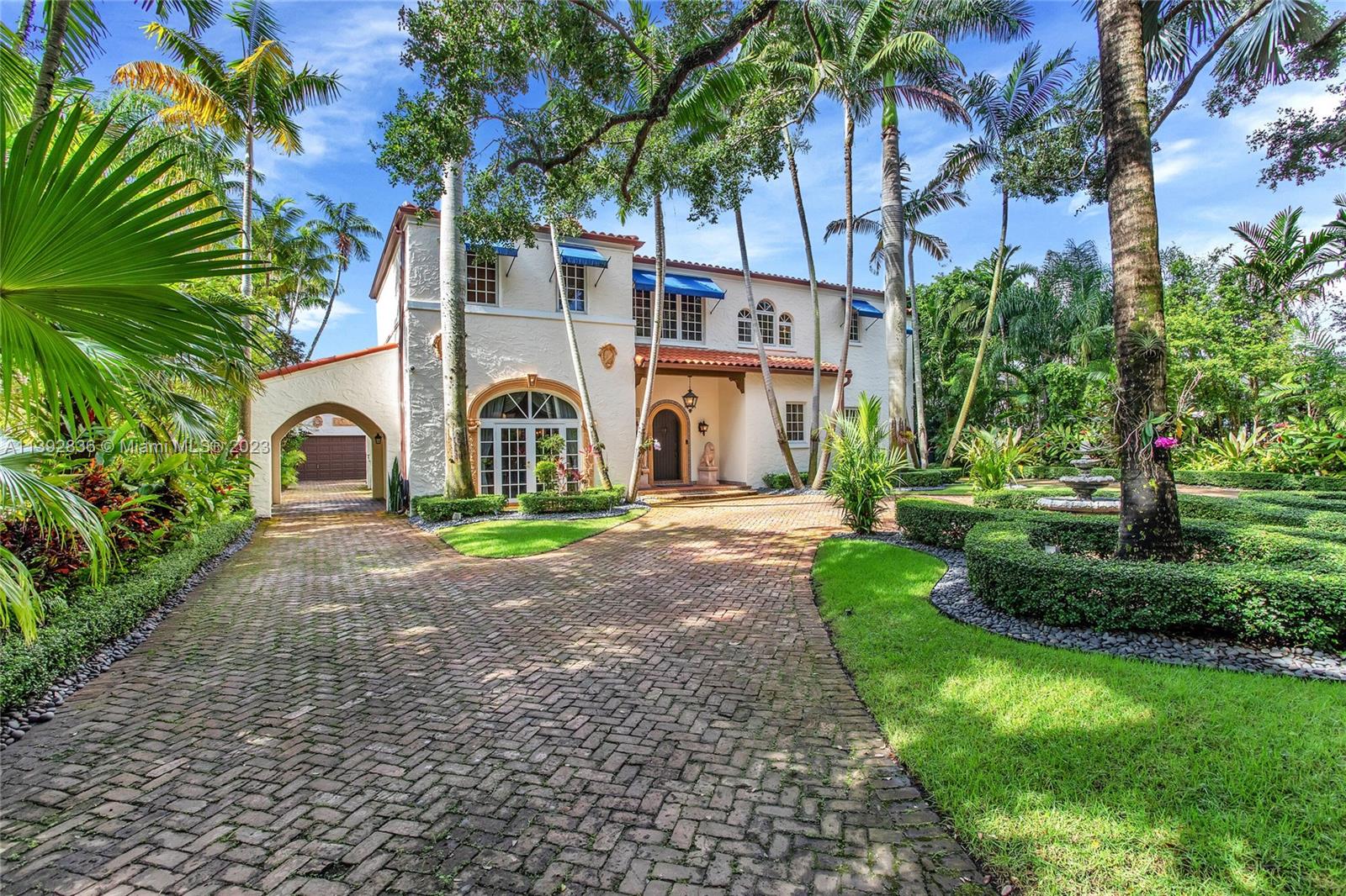 Majestic Mediterranean mansion on Coral Way. Grand foyer leads to large gracious spaces; living room w/fireplace,library/office w/gas fireplace, dining room, and family room w/bar. Main floor features guest room and staff room, each w/bath, cook's kitchen, breakfast room, and wine cellar. Impact glass French doors open to wide covered terrace w/entertaining area. On the 2nd floor: primary bedroom with massive bath and 2 walk-in closets; two other bedrooms each with private bath. Home was renovated in 2006 preserving the Old Spanish look and charm w/wood, marble, and tile floors, beamed ceilings and original stained glass. Pool area features a cabana w/bath, steam room, and a 2nd wine cellar (possible guest cottage). Impact glass throughout, roof and ACs new in 2022.