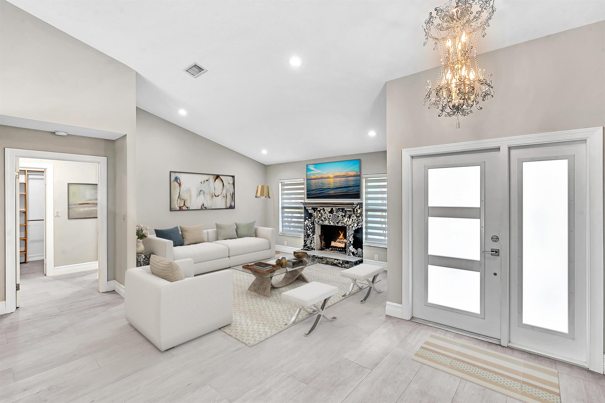 A newly remodeled home with 4 bedrooms and 2.5 baths split plan, on a quiet street. New roof, new 12''x60'' wood style porcelain floor, all 3 baths & kitchen renovated. Heated pool resurfaced with Blue Quartz, travertine patio & deck, outside kitchen, large 49'x14' covered patio. Fenced yard. Formal dining, LR w/remodeled fireplace, family room & open kitchen facing patio & pool. New front door & remodeled entrance. Volume ceilings in all living areas & principal bedroom. Newer hurricane rated & insulated 2-car garage door, new side door. Impact windows in all bedrooms & living areas. Circular driveway.HOA managed perimeter hedges for value enhancing uniformity. A stable neighborhood with A rated schools like Verde K-8 & Boca Raton HS. Access to all the city's Beaches, Parks & Librari