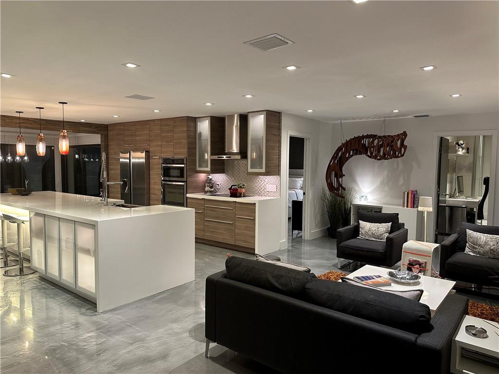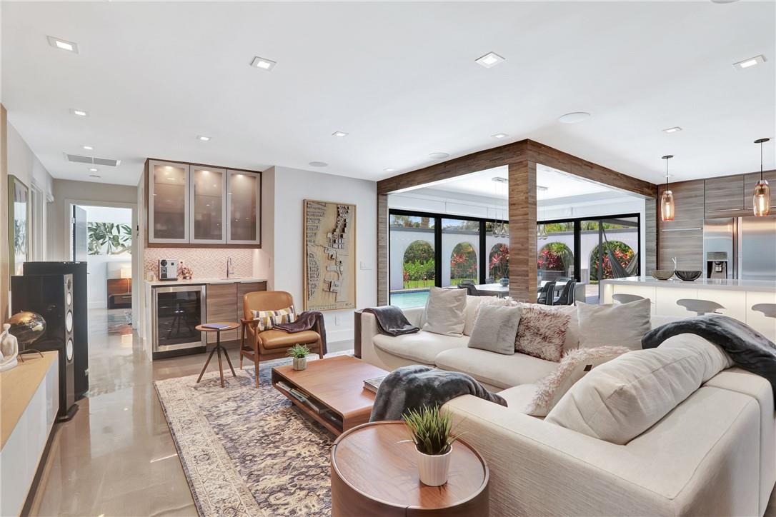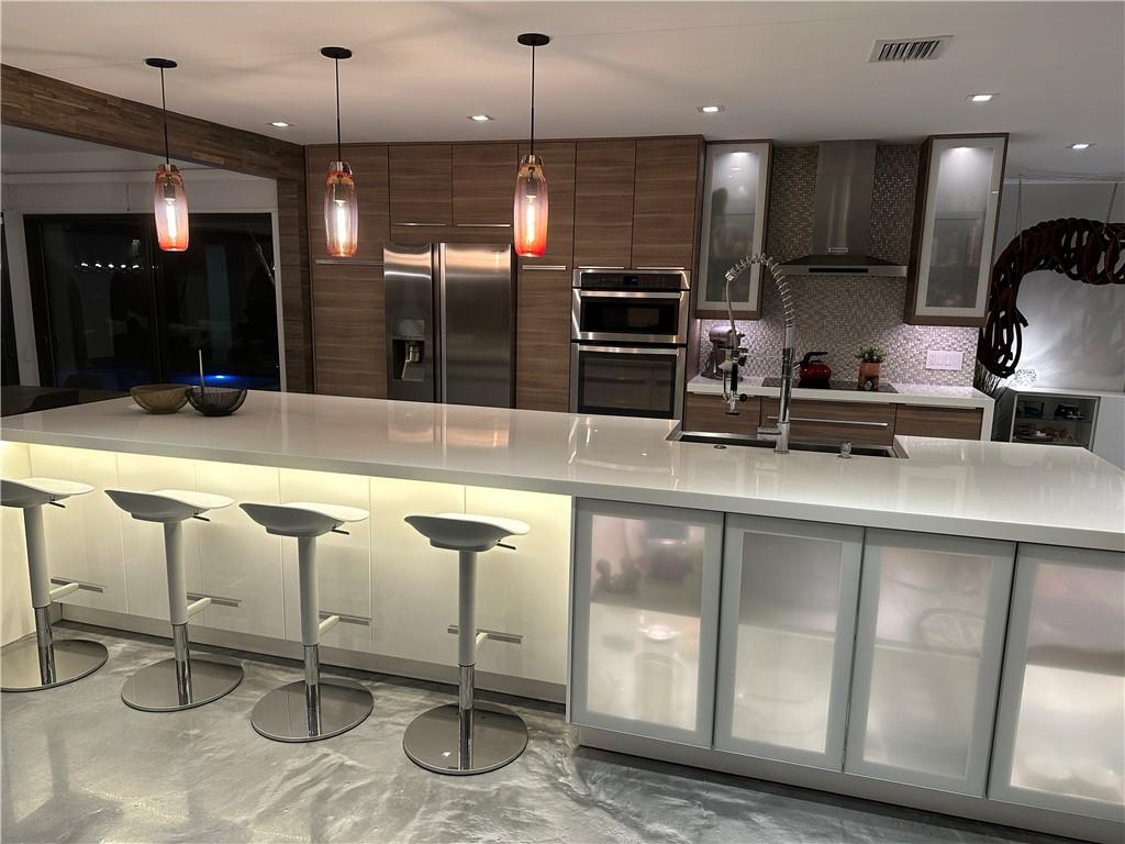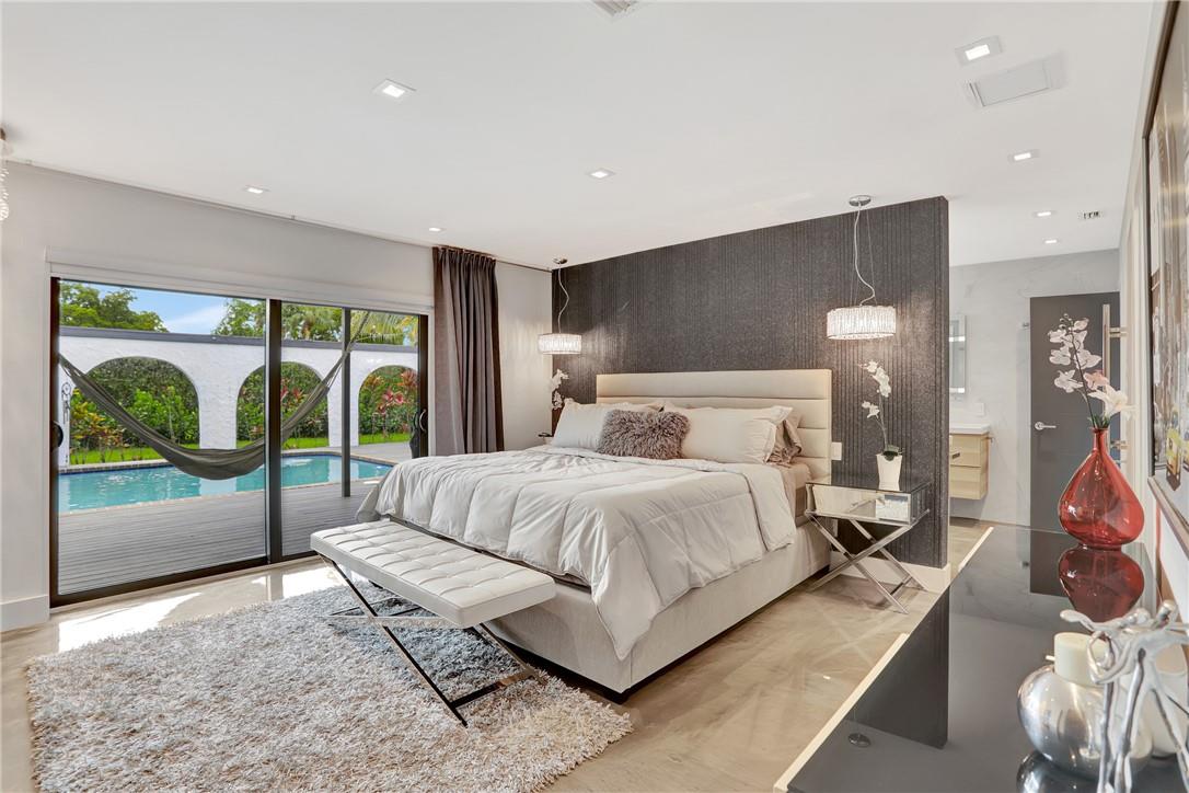 5 bedrooms and 3 baths. Smart control home with automated curtains, lighting, AC, door locks, cameras, garage door and sprinklers. Impact windows and sliders. Beautiful open kitchen with 14 ft Kryon bar and seamless look countertops. Large laundry room with second refrigerator. Master bath with walk-in shower and soaking tub. Rain-head showers from ceiling and body jets. LED mirrors in all baths and wall mounted toilets. Custom tv wall units in living room and primary bedroom. Custom walk-in modular closets. Electrical lines, AC ductwork, plumbing drain lines redone. Custom epoxy floor coating. Recessed LED lighting throughout. Dining area overlooks pool area with stacked sliding doors.