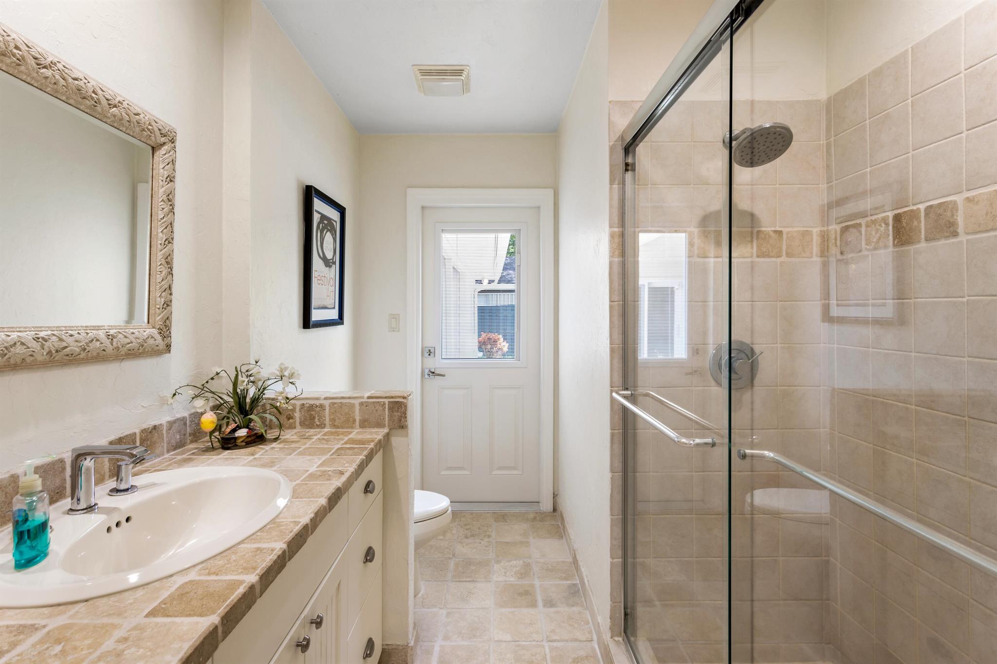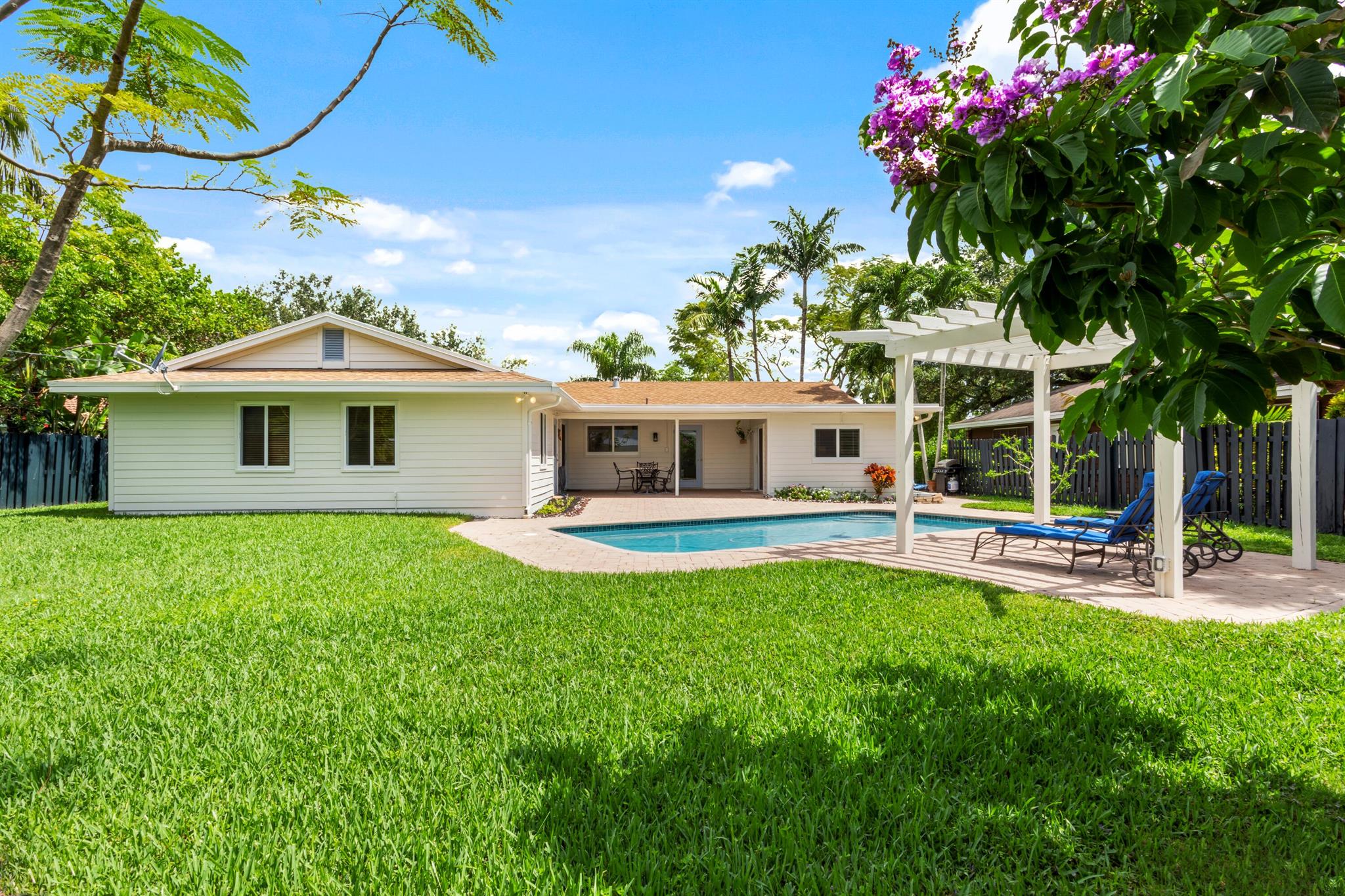 Quietly nestled on an expansive lot in the sought-after enclave of Palm Beach Farms in east Boca Raton within an A-rated school district of Addison Mizner. This charming Coastal-Inspired Estate includes three-bedrooms and two-bathrooms. Newly updated interiors with sleek porcelain and marble floors, shaker-style kitchen cabinetry with stainless steel appliances, and primary suite with separate office. Resort-like pool entertainment area with lanai and pergola. The expansive backyard also features exclusive gate access to Pine Breeze Park. Other amenities include impact windows and doors and cabana bath.