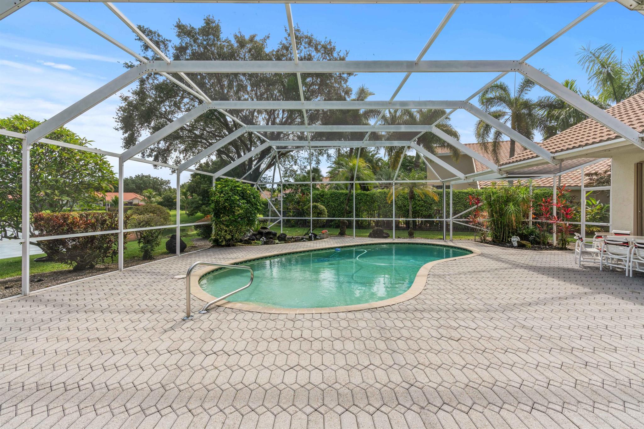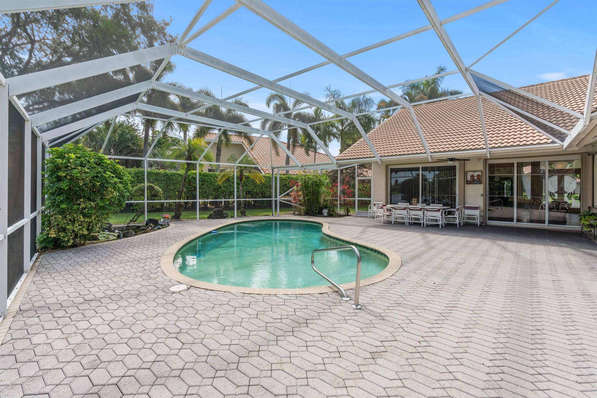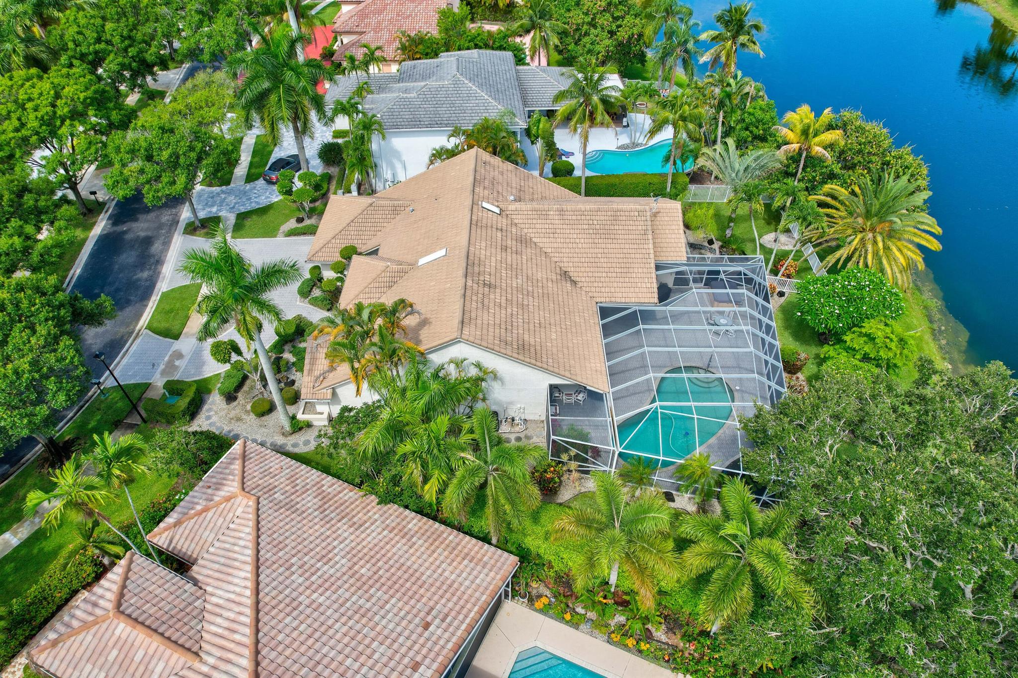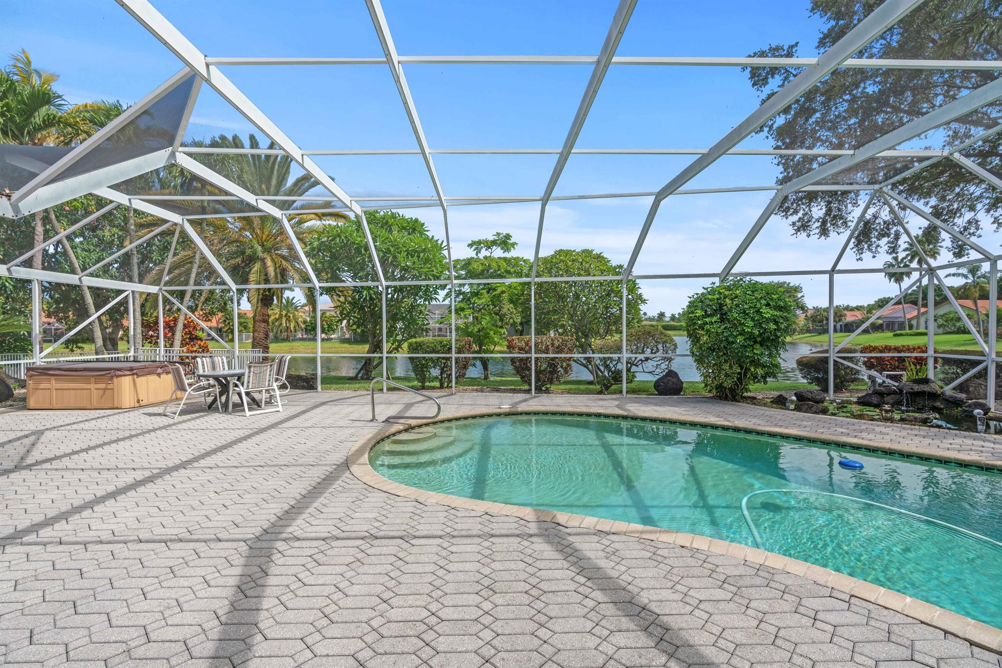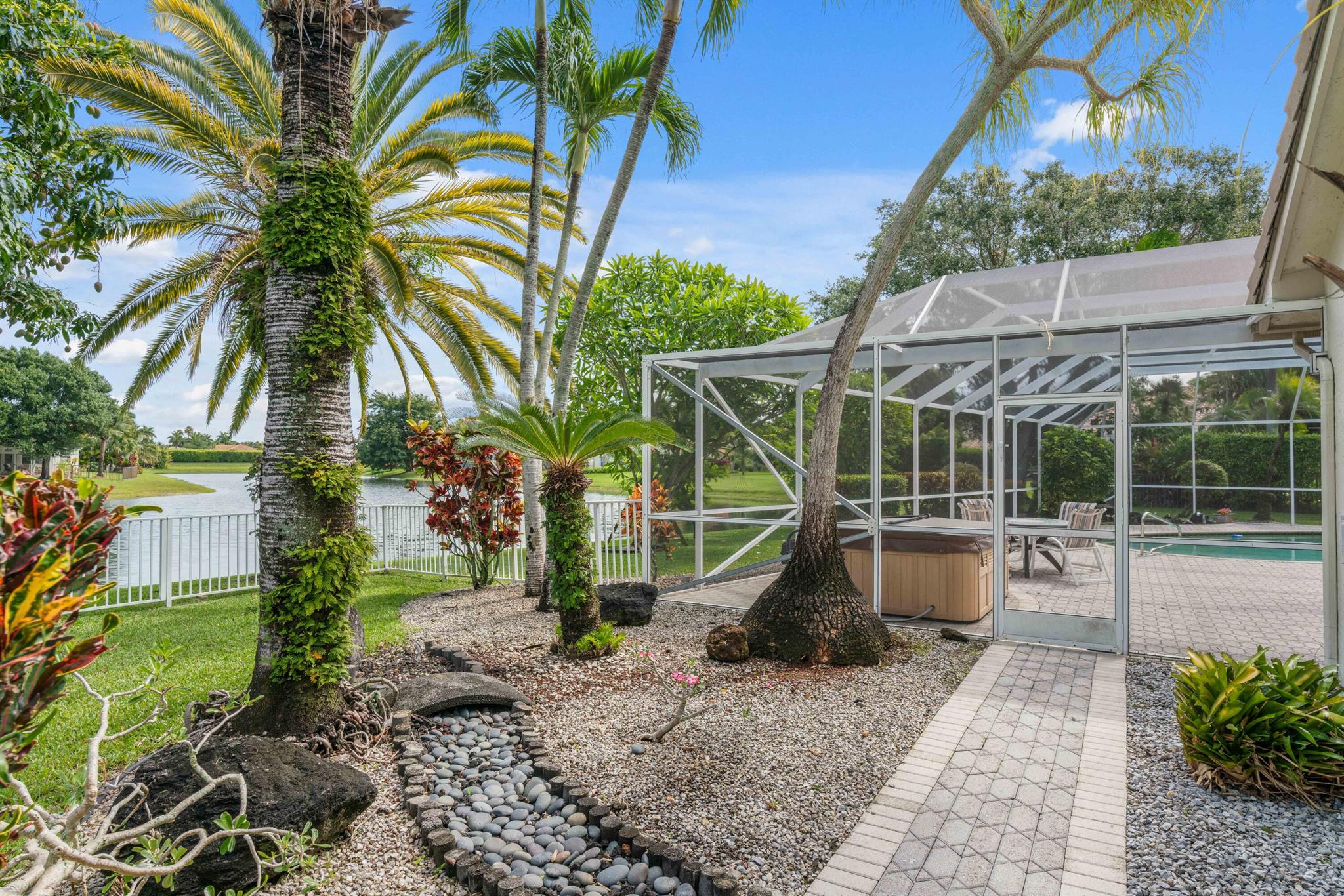 Stunning Waterfront Sunsets, Perfect for entertaining. The Isle at Mission Bay is a gated, family-friendly community with Oak tree-lined streets offering impressive country club resort-style amenities & all A-rated schools. This majestic lakefront pool home has 4 bedrooms, 3 bathrooms, a very large screened patio, swimming pool, Spa Hot Tub, plantings & a custom fish pond, pavered circular driveway, concrete tile roof (2018), Accordion shutters, AC (2021), new water heater (2023), vaulted ceilings, built-in Bar, updated kitchen with center island and pull-outs, updated tile floors, walk-in & custom built-in closets, split floor plan, oversized garage, fenced yard, home water filtration system, & fruit trees producing Coconuts & Mangoes.