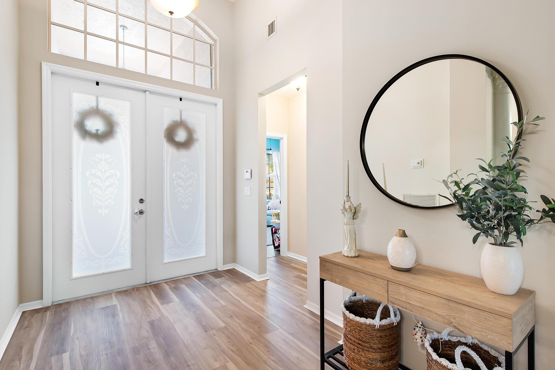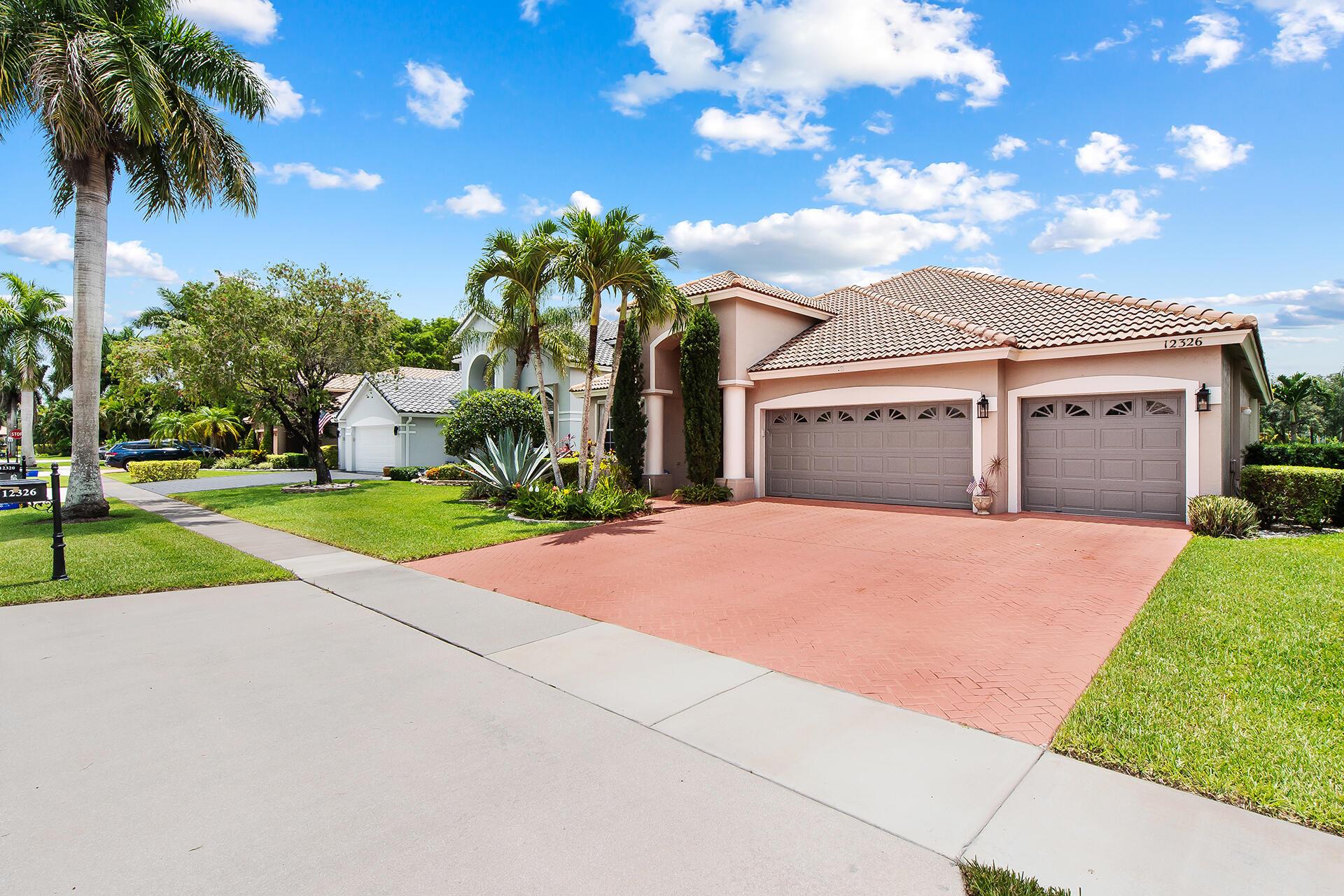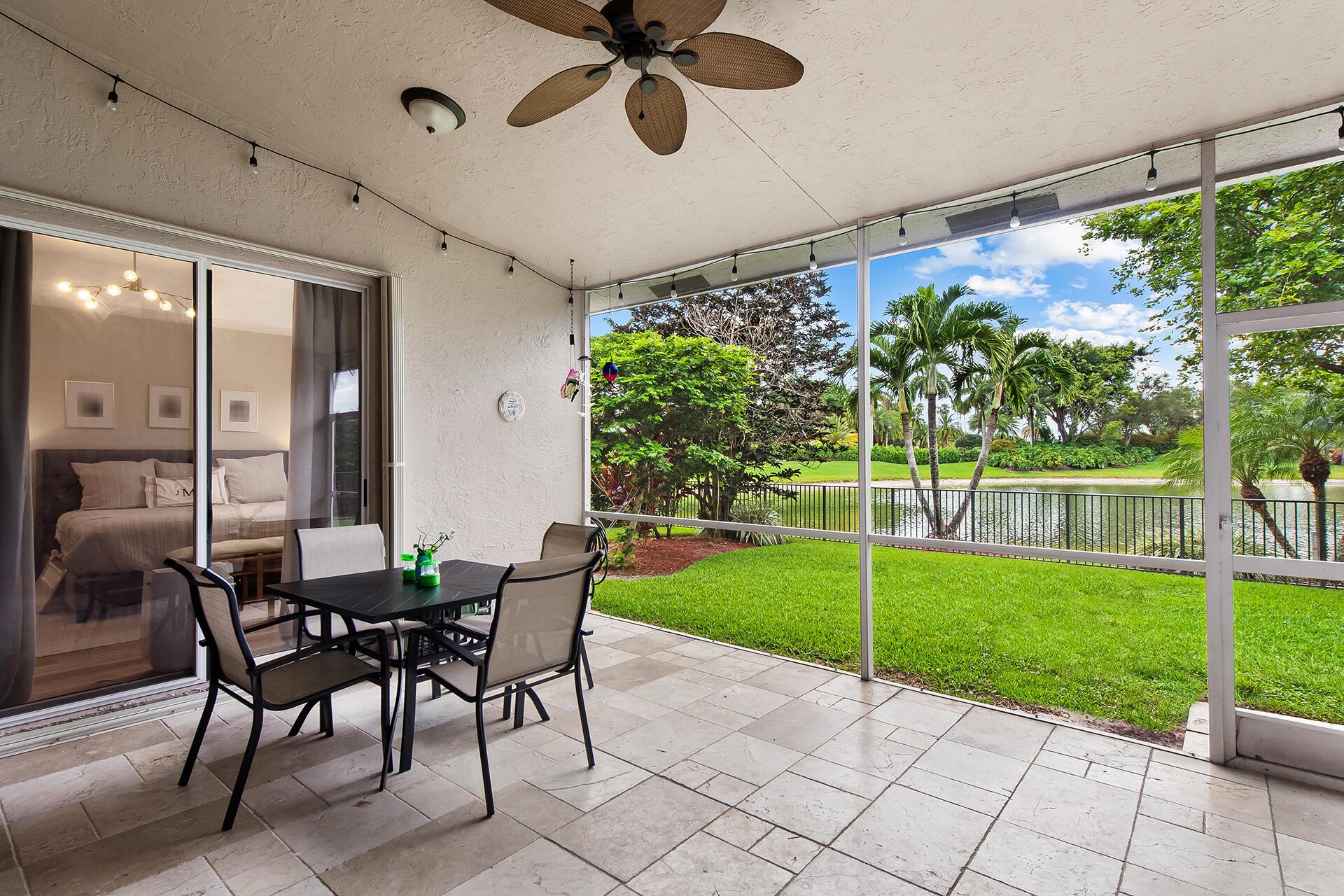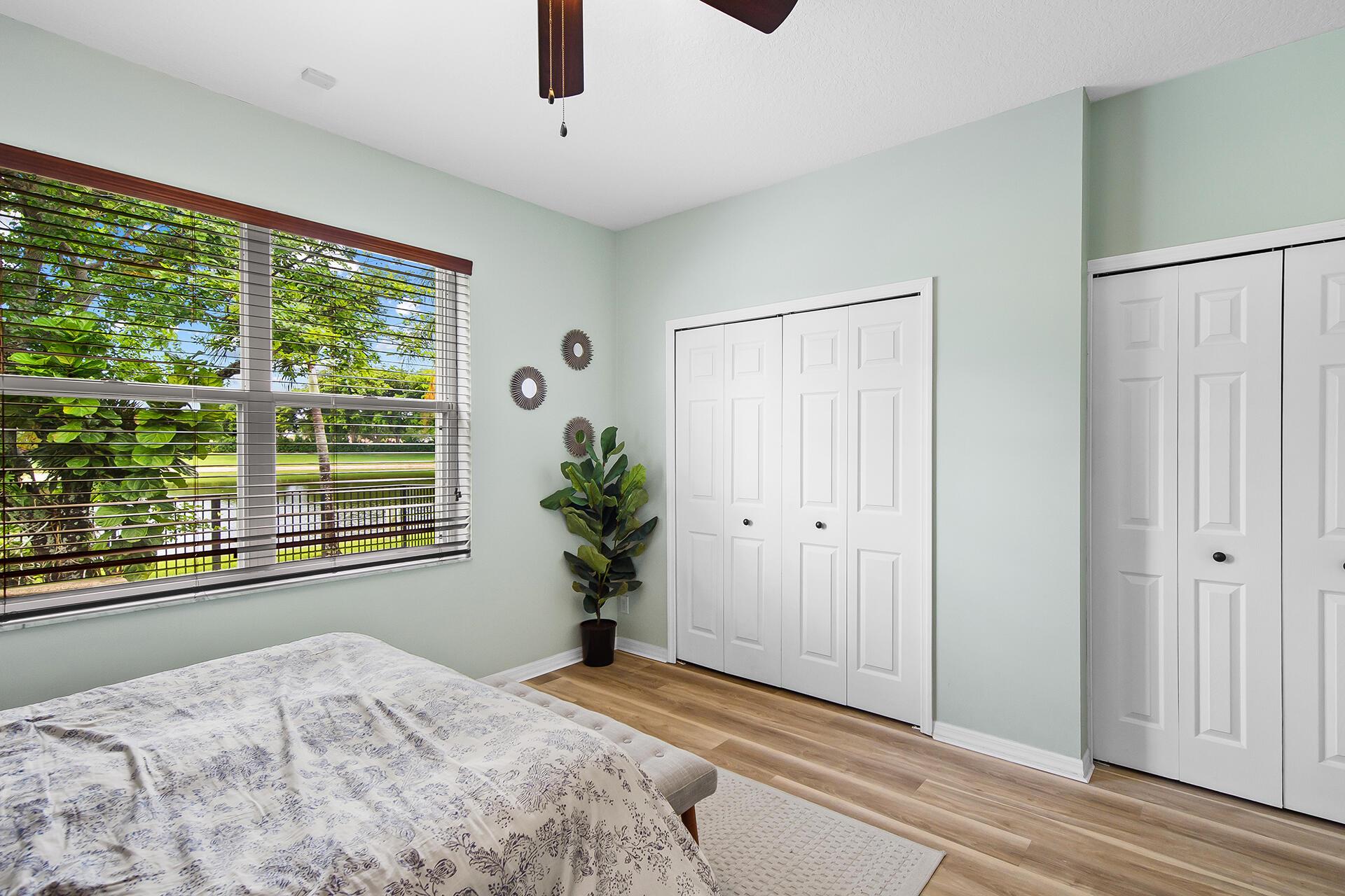 Desirable one story split floor plan with fenced backyard on the lake! This home is move-in ready with new wood look luxury vinyl flooring installed in 2022, newly painted exterior and interior, new LED lighting, renovated guest bath and more. Gourmet kitchen with SS appliances, new stove and microwave, granite countertops and breakfast bar. Large great room with stone accent wall with storage and lighting. Accordion hurricane shutters on all windows. Covered and screened patio overlooking large fenced yard and lake- perfect for pets and playsets. Boca Falls features two manned gates and a third gate going to highly rated Waters Edge Elementary. Amenities include heated resort style pool, tennis courts with league play, fitness center, playground & clubhouse all with NO equity required