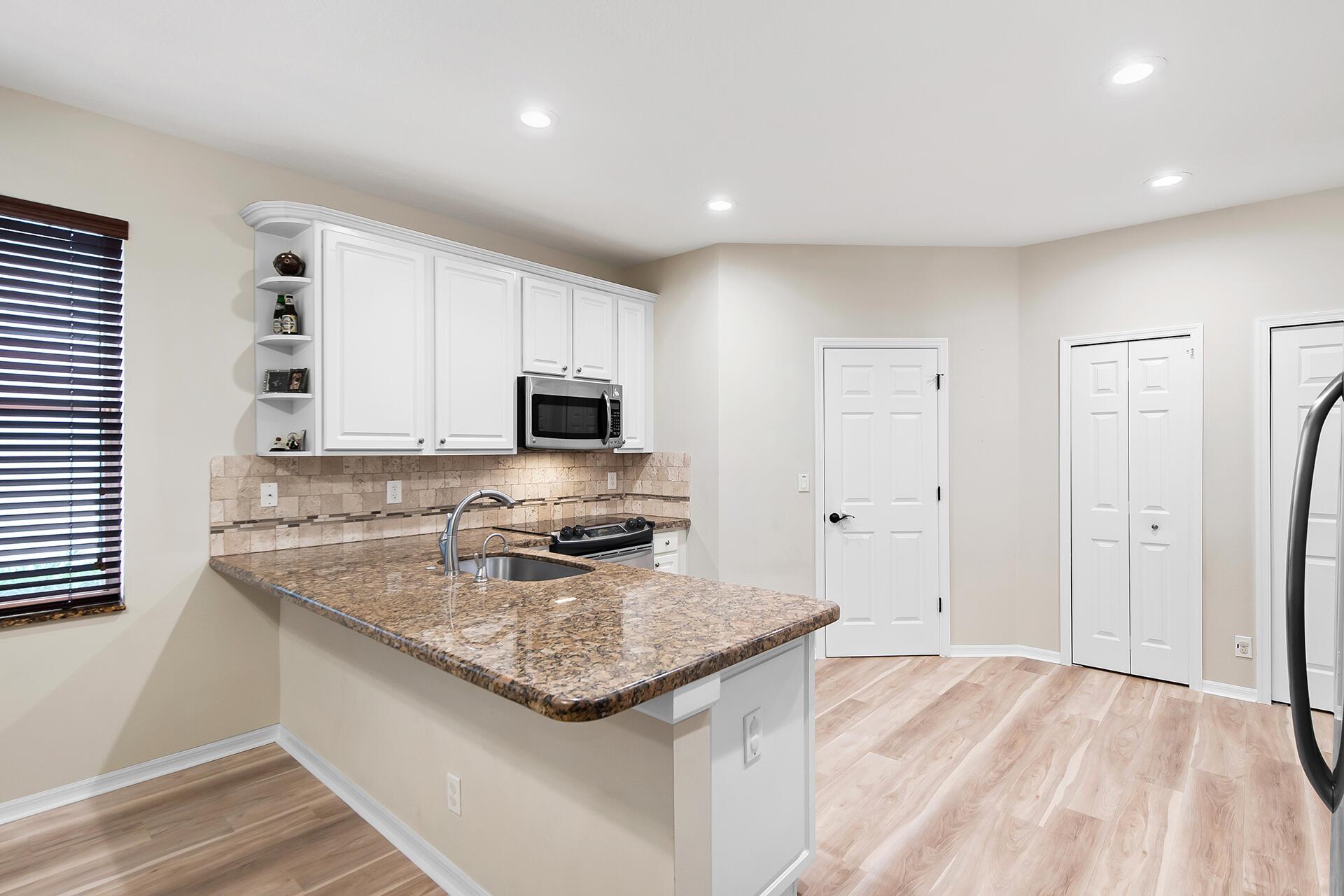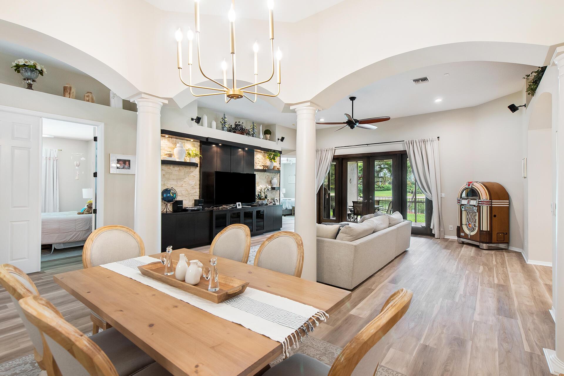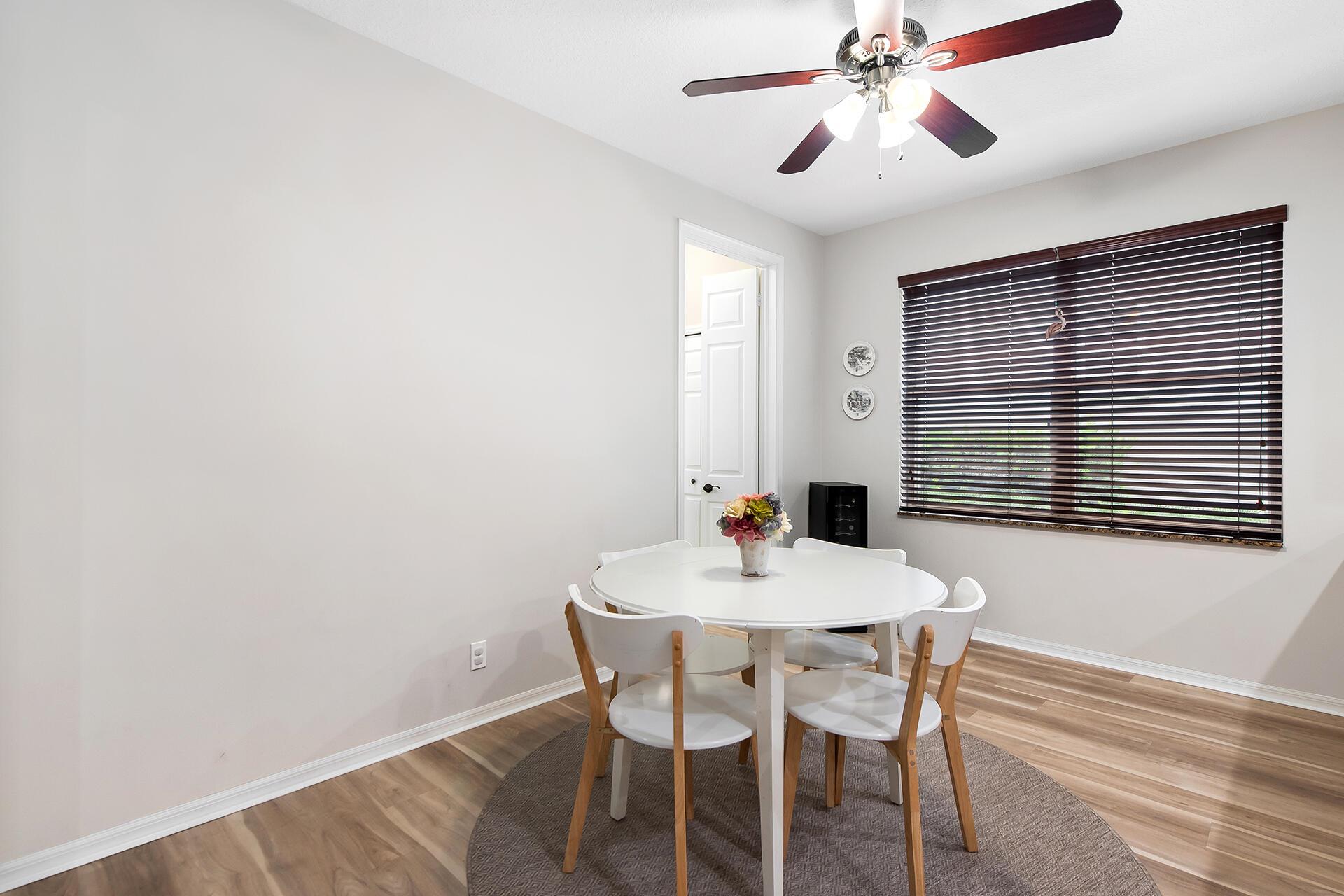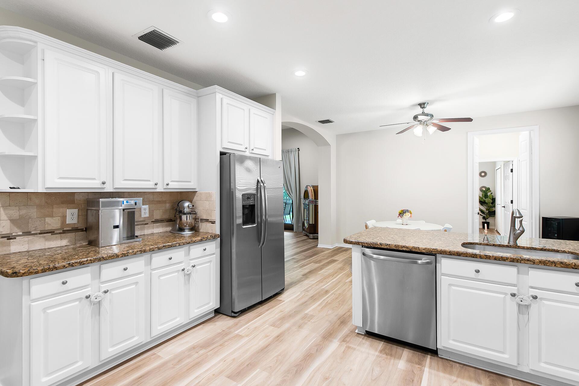 Desirable one story split floor plan with fenced backyard on the lake! This home is move-in ready with new wood look luxury vinyl flooring installed in 2022, newly painted exterior and interior, new LED lighting, renovated guest bath and more. Gourmet kitchen with SS appliances, new stove and microwave, granite countertops and breakfast bar. Large great room with stone accent wall with storage and lighting. Accordion hurricane shutters on all windows. Covered and screened patio overlooking large fenced yard and lake- perfect for pets and playsets. Boca Falls features two manned gates and a third gate going to highly rated Waters Edge Elementary. Amenities include heated resort style pool, tennis courts with league play, fitness center, playground & clubhouse all with NO equity required