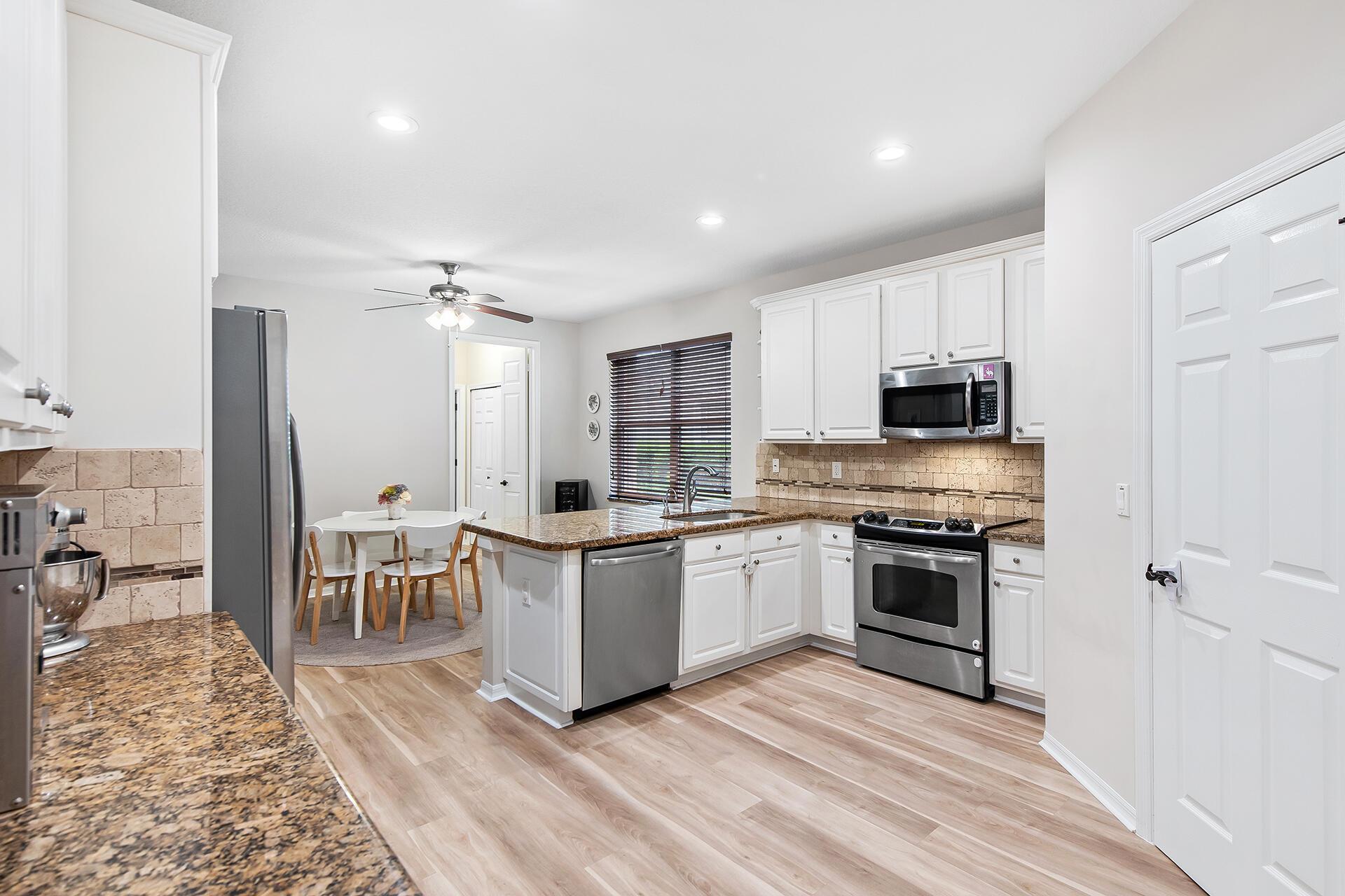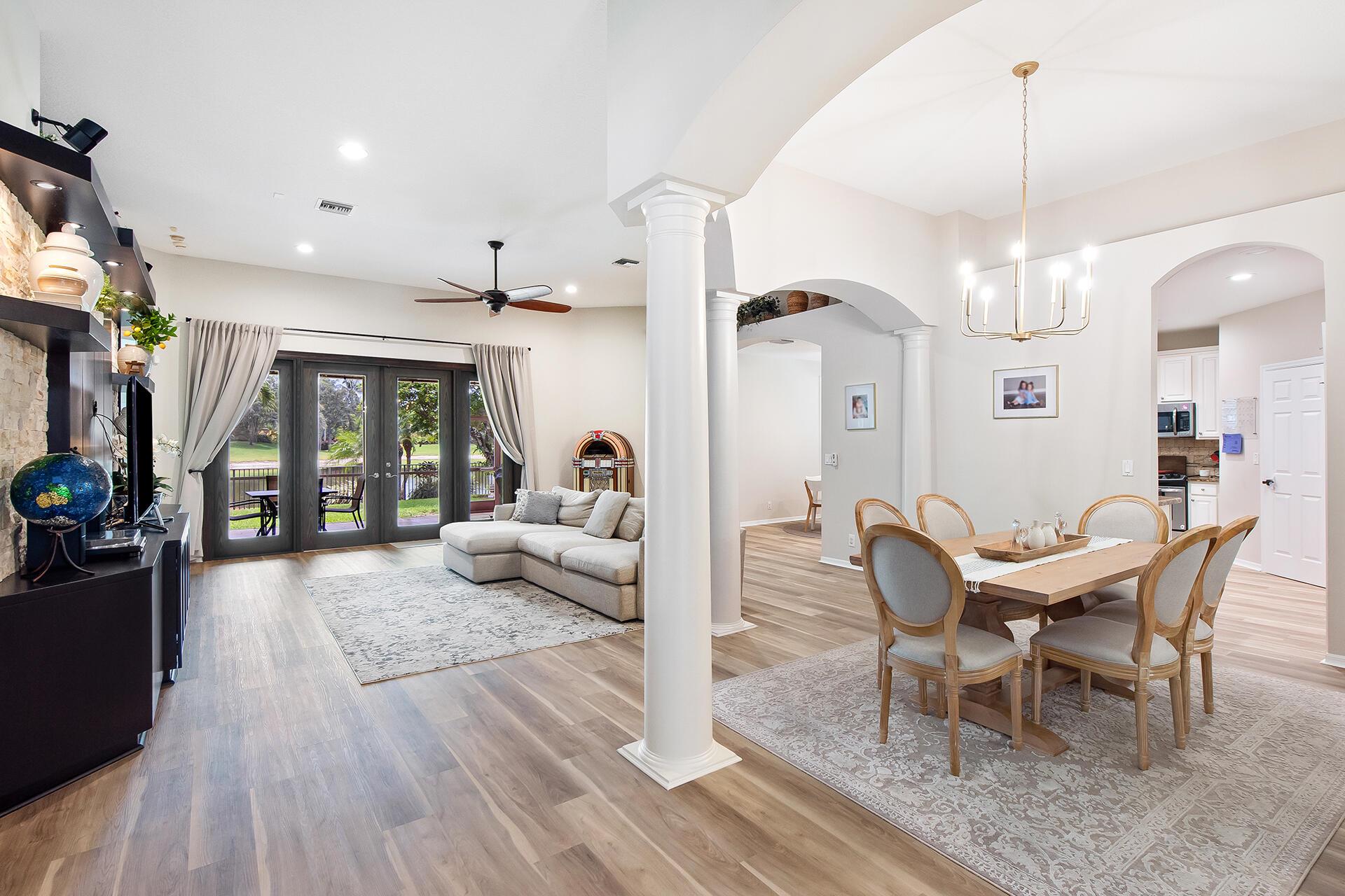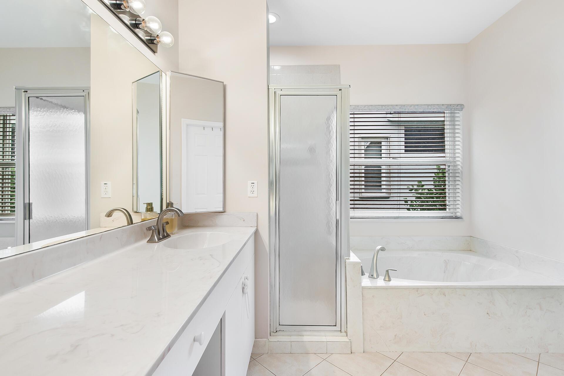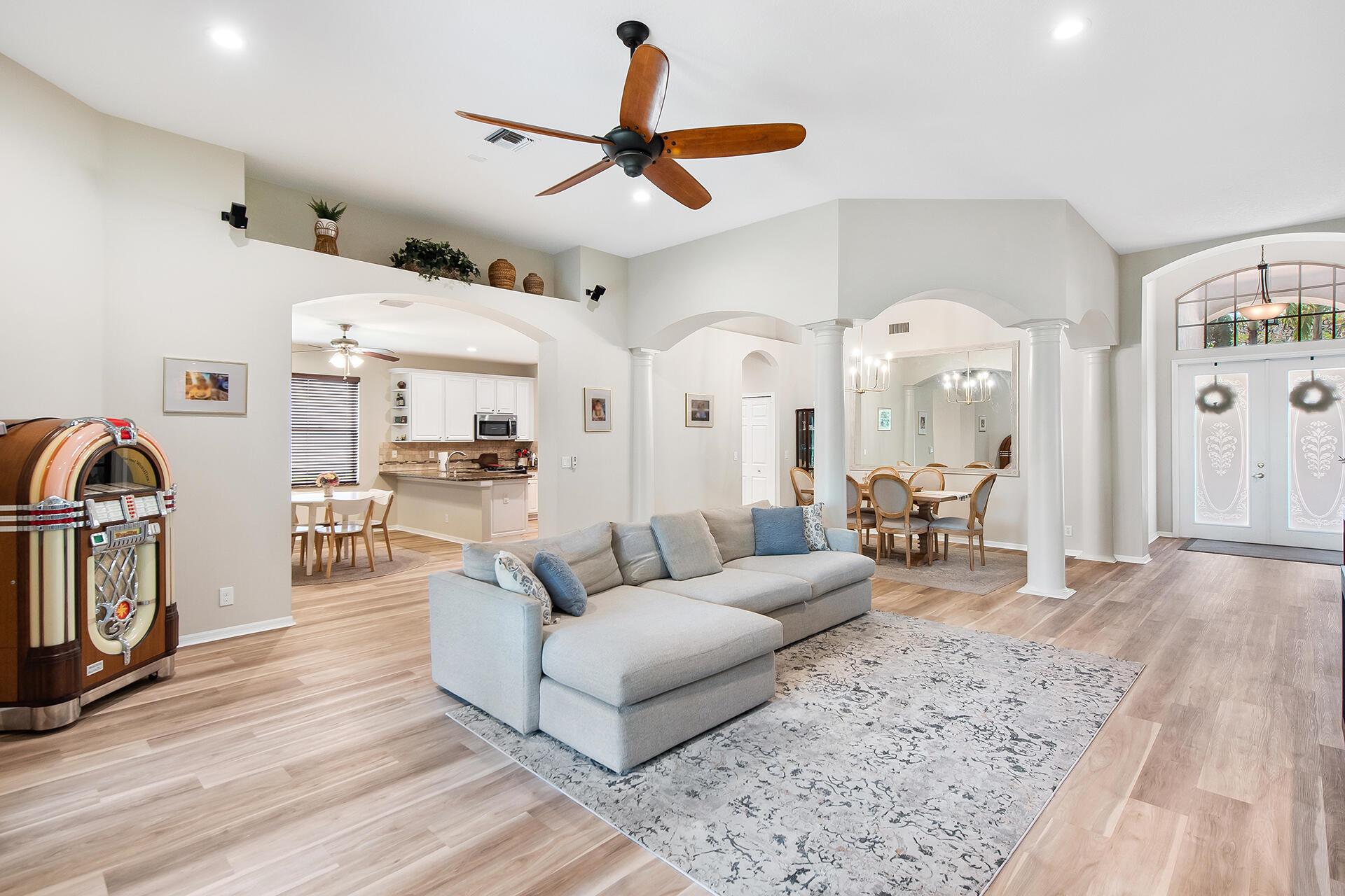 Desirable one story split floor plan with fenced backyard on the lake! This home is move-in ready with new wood look luxury vinyl flooring installed in 2022, newly painted exterior and interior, new LED lighting, renovated guest bath and more. Gourmet kitchen with SS appliances, new stove and microwave, granite countertops and breakfast bar. Large great room with stone accent wall with storage and lighting. Accordion hurricane shutters on all windows. Covered and screened patio overlooking large fenced yard and lake- perfect for pets and playsets. Boca Falls features two manned gates and a third gate going to highly rated Waters Edge Elementary. Amenities include heated resort style pool, tennis courts with league play, fitness center, playground & clubhouse all with NO equity required