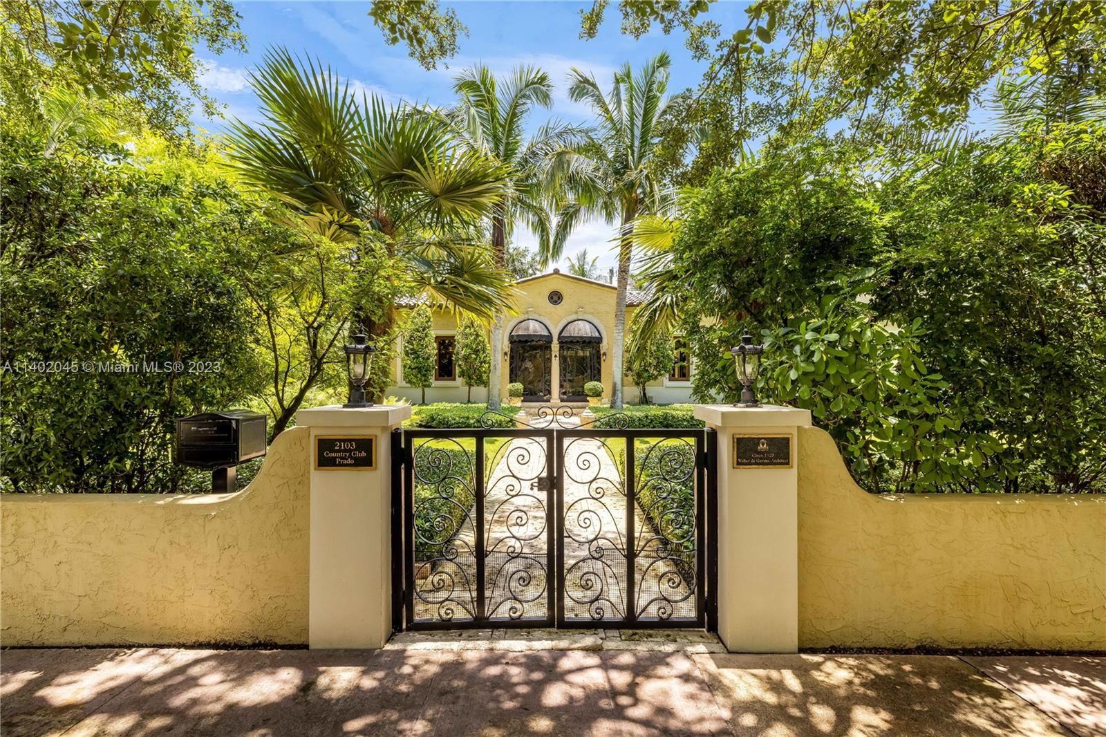 Fall head over heels for this restored and updated Historic Walter de Garmo on iconic Country Club Prado greenway & historic fountain park. Fully gated, w/ thriving koi pond in lushly landscaped grounds, w/ Old Man Palms, Bleeding Heart vine, Tree of Life. Old Spanish features incl wrought iron framed entrance foyer w/ Cuban tile, stained glass porthole windows & vaulted wood beam ceiling extending to living room w/ Fireplace feat original andirons. Large eat-in kitchen, oversized island, Lacanche stove, SubZero R/F. 2/1 downstairs used as bedroom & office. 2/1 upstairs used as primary suite. 1/1 guest wing. Pool patio w/ cabana bath. La Finestra impact W+D. Tiled/AC’d 1 1/2 car gar & laundry room. ‘22 historic board approved roof, ‘05 septic , ‘05/12 electric & plumbing, ‘21/22 AC motors.