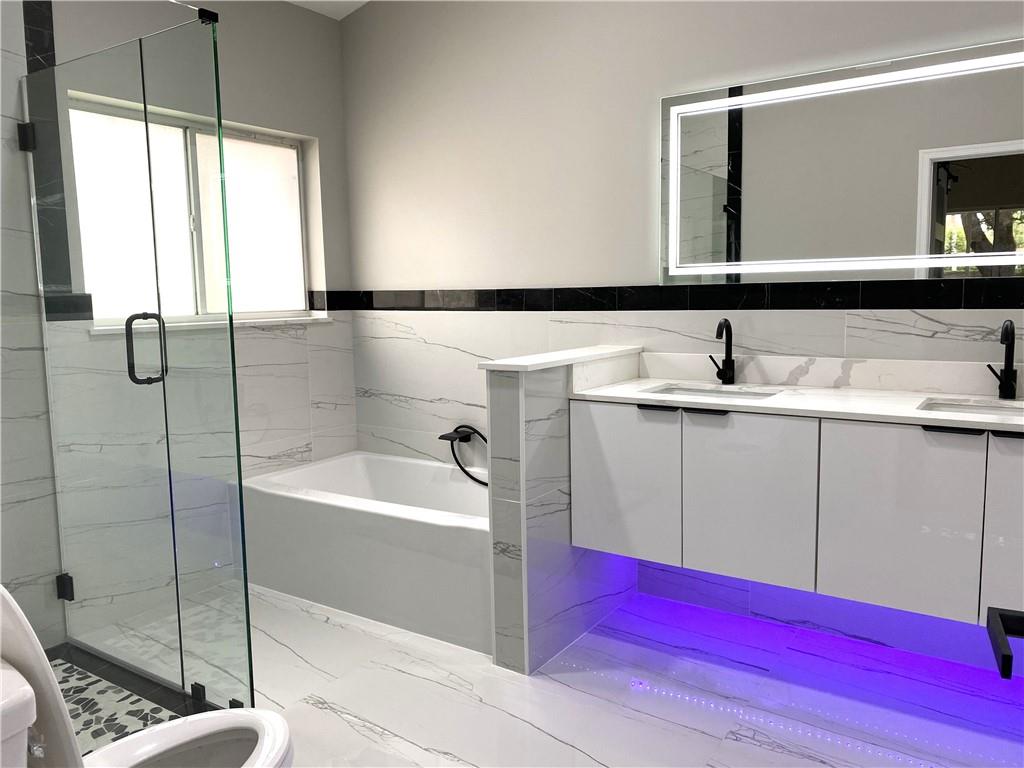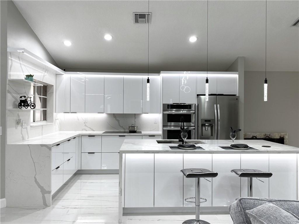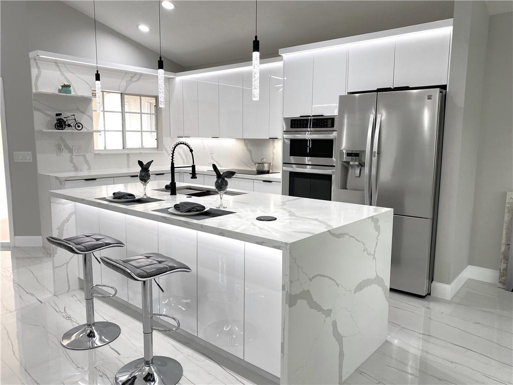 New Renovated 1-Story Home! Low HOA Fee w. lawn care, common area & a community pool! Bright Open & Split Floor Plan, Vaulted Ceilings, Tile & laminate floors, LED lights for the entire house. Modern kitchen has high-gloss cabinetry, quartz countertops & walls, 2-basket trash drawer, energy saving induction cooktop, touchless hood, SS appliances, self-clean oven, waterfall breakfast island has auto retractable outlets, & much more. Master suite features dual-sink vanity, custom-made closet has sensor lighting. Fresh painted exterior & interior. Window has UV protection films. Tropical Lush backyard w. screened Patio! An utility sink in laundry! 2-Car Garage w. Hurricane Impact Door. Roof 2007. AC 2014. WH 2020. A+ Rated Schools, no effect on the rezoning, Stoneman Douglas High School zone!