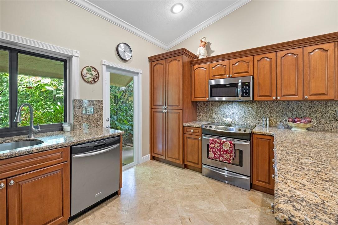 Highly sought after Country Address neighborhood, All A-Rated schools, safe neighborhood, corner lot. 3 bedroom / 2 bathroom, travertine floors throughout entire home, renovated bathrooms, renovated kitchen with granite countertops, stainless appliances, open floor plan with vaulted ceilings in living areas and kitchen/dining. Most doors and windows have been replaced with impact. Openings without new windows have hurricane protection. Garage has been converted to additional living space/kids play room but can easily be converted back. Water heater and dryer are less than 6 months old. Cul-de-sac street (low traffic) private fully fenced yard that is also a Broward County Certified Wildlife Habitat with Koi pond, wood decks and pergola. CHEAPEST LISTING IN COUNTRY ADDRESS. No HOA Fees.
