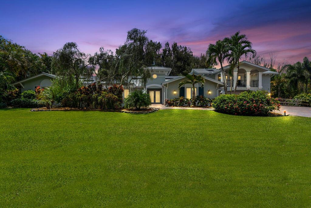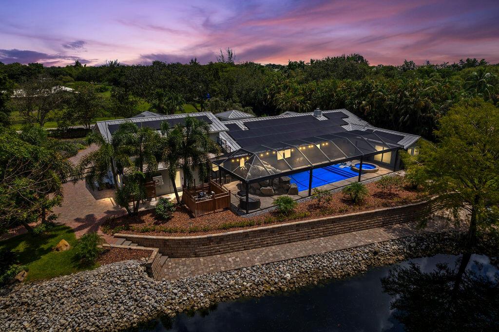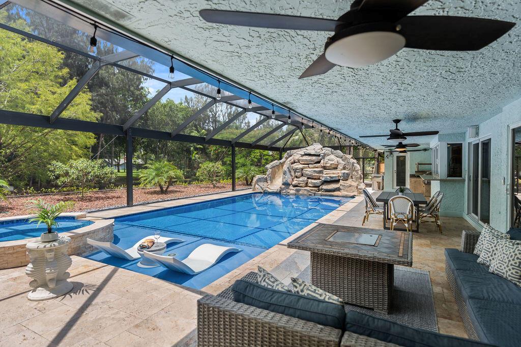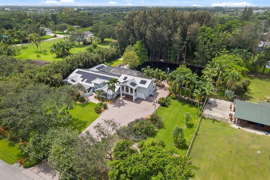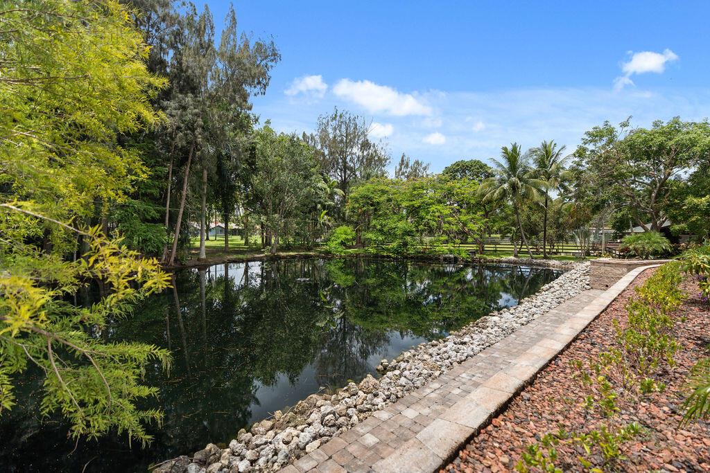 If you are looking for Shangri-La, look no further! Situated on 2.5 Acres of a Tropical Oasis, this home and property truly have it all! The 1/2 Acre filtered pond with fountain is surrounded by beautiful enormous pine trees offering a park like setting with lighted paver walk ways and gorgeous sitting area.There is also a 3 stall barn for horses with feed and adjacent air conditioned tack room/office as well as chicken/hen coops and room for ring and paddock! Features include, Metal Roof, Solar Panels, Newly resurfaced Resort Style Saltwater Pool with new heater, slide and Hot Tub! Outdoor Kitchen, gas fireplace, Complete Impact Glass Windows, Gourmet kitchen with large island, Newer Bosch Induction stove top, Newer Refrigerators, New Bosch dishwasher,