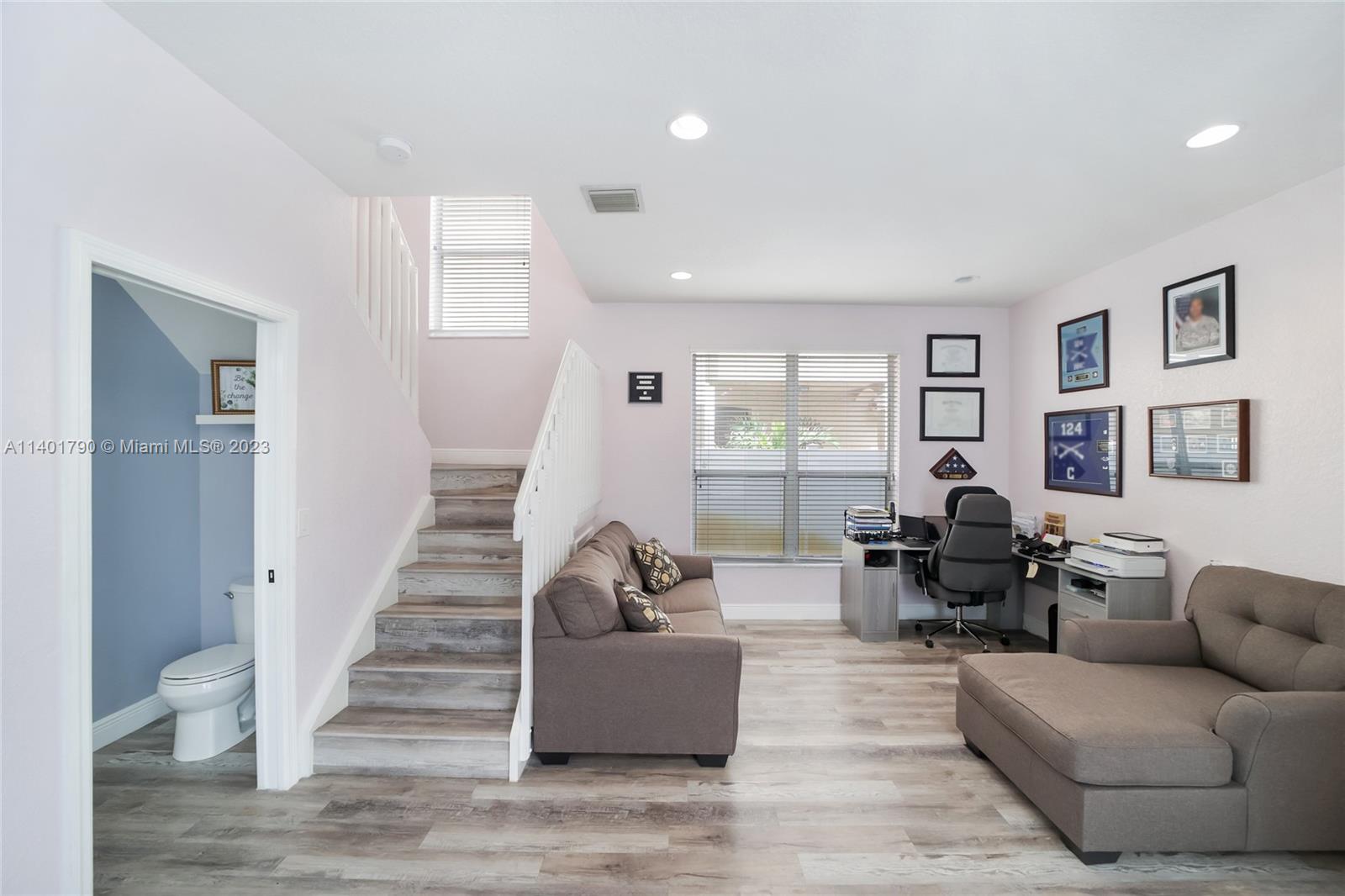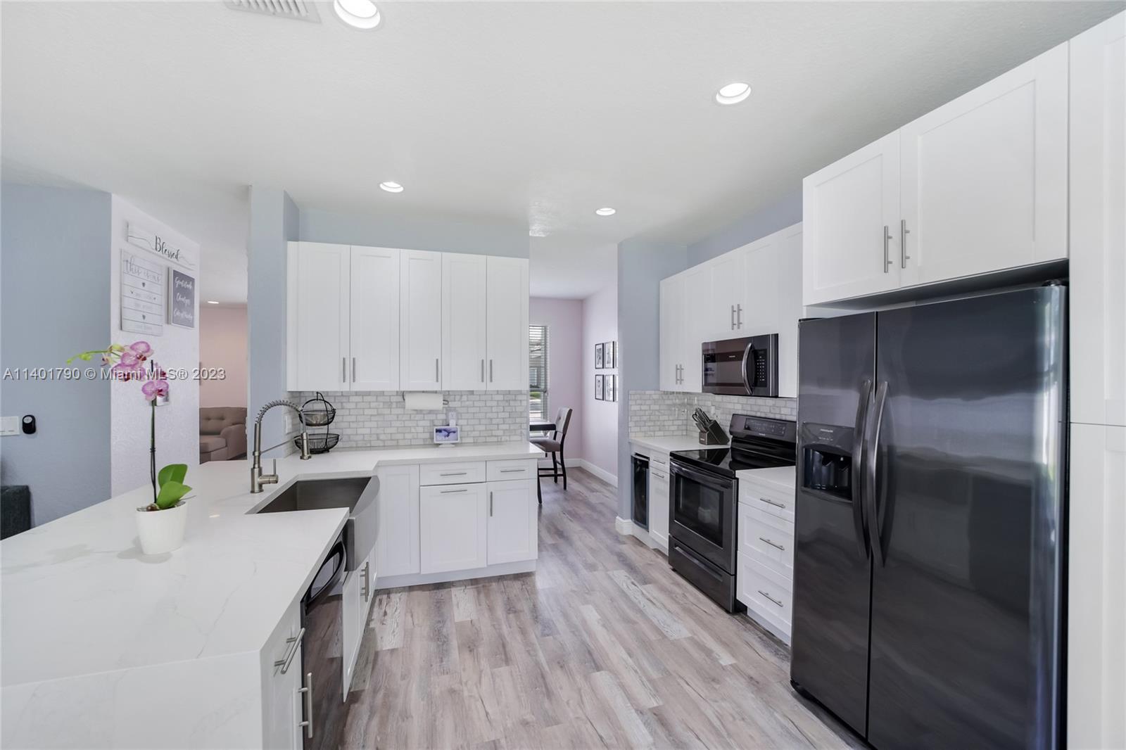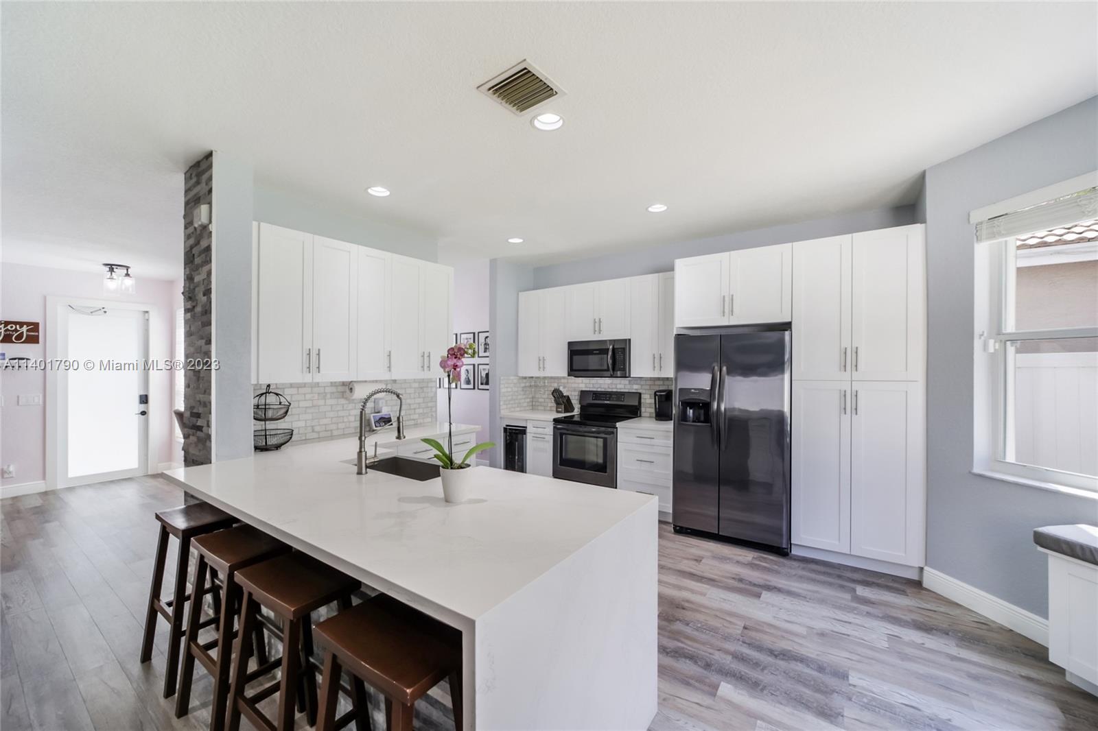 This extraordinarily beautiful two-story home located in the desirable gated community of Silver Shores is nestled in the heart of Miramar. The 3 bedroom and 2.5 bath residence mesmerizes with gorgeous Mediterranean architecture, an openly flowing floor plan, plenty of natural light, beautiful wood floors, and a spacious living room. Entertainment friendly, the upgraded open concept gourmet kitchen features stainless-steel appliances, quartz counters, and a farmhouse sink. All bedrooms are generously sized with dedicated custom built closets, while the primary bedroom dazzles with a spa-inspired en suite boasting a soaking tub, dual sinks, and a separate shower. Other features: Two car garage, laundry area in garage, fenced-in backyard with patio, and solar panels to power the entire home.