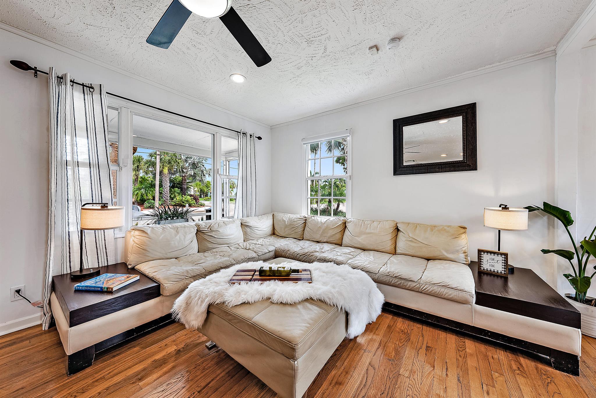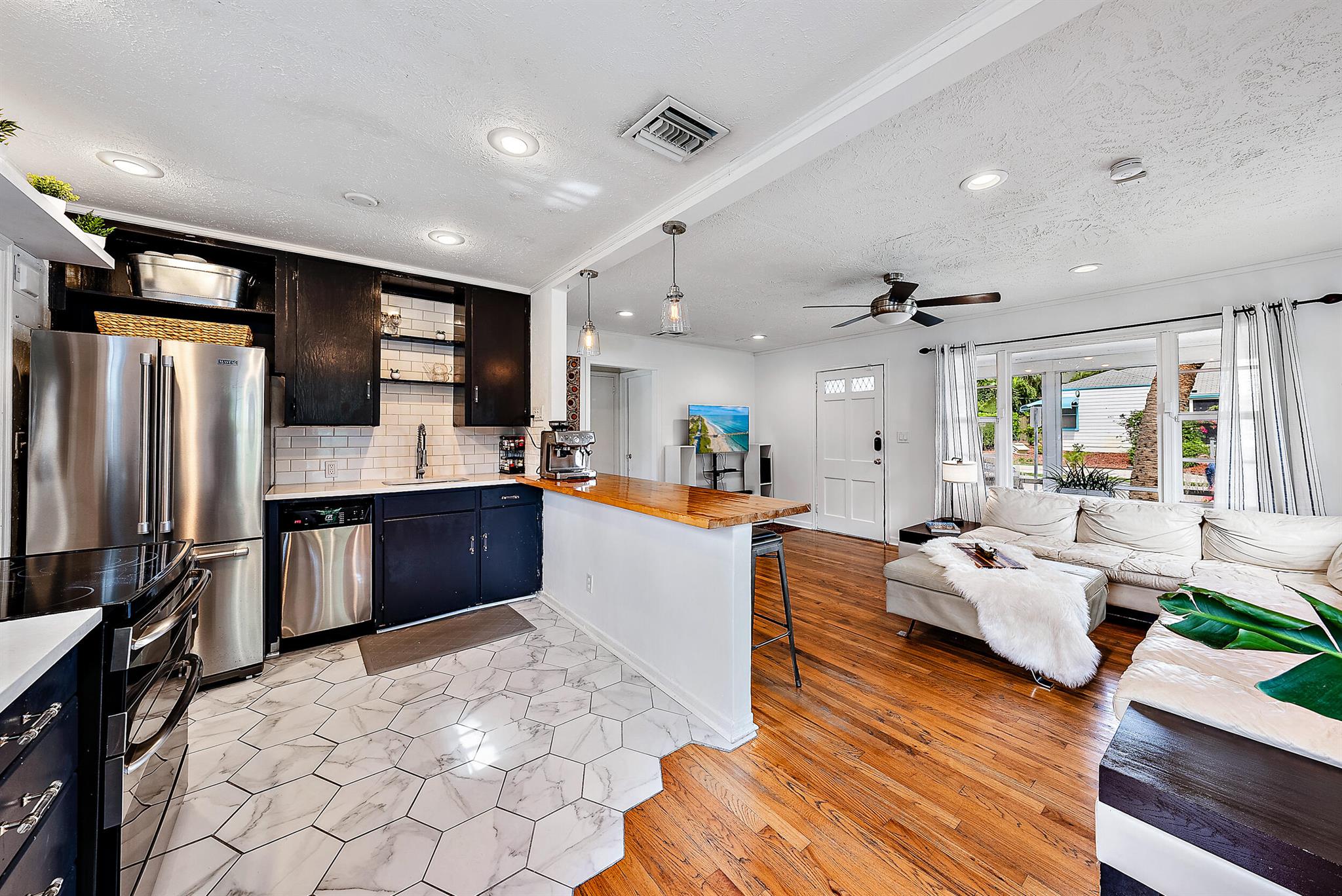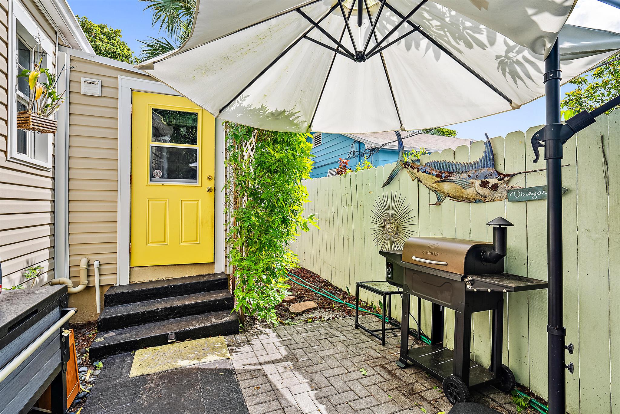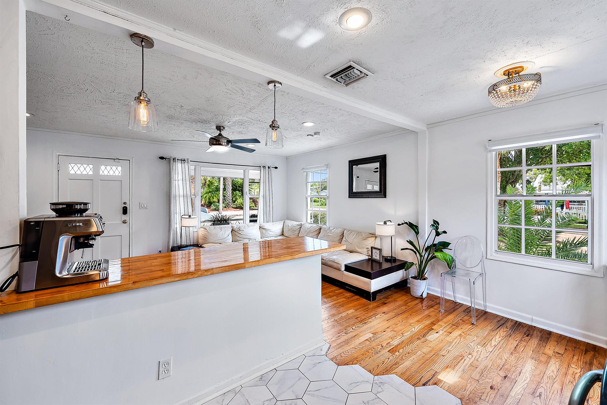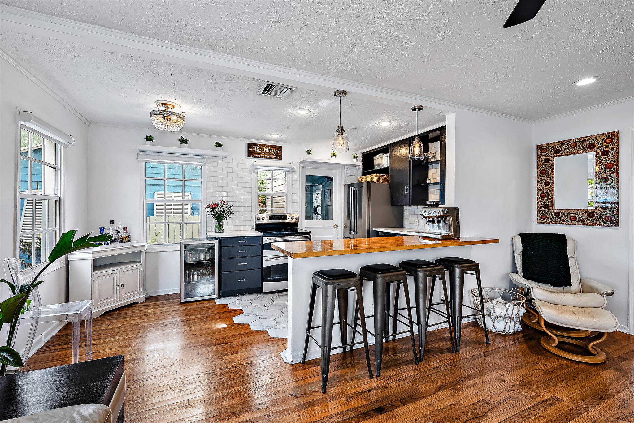 This charming home located in Pineapple Park is a rare find. Brand New AC 2023 and roof (November 2022). The home has an open floor plan with two bedrooms one bathroom. The kitchen is recently updated with pendant lighting, wine fridge, quartz & large butcher block island. Tons of original Old Florida charm with Dade Co. pine hardwood floors and beautiful tropical landscaping. The fenced in back yard is expansive and private, perfect for entertaining.This location is less than a mile from Rosemary Square and PBI airport. Its a short walk to Grandview Market, numerous restaurants, Howard Park, and all that Rosemary Square has to offer. Zoned for Palm Beach Elementary School District.