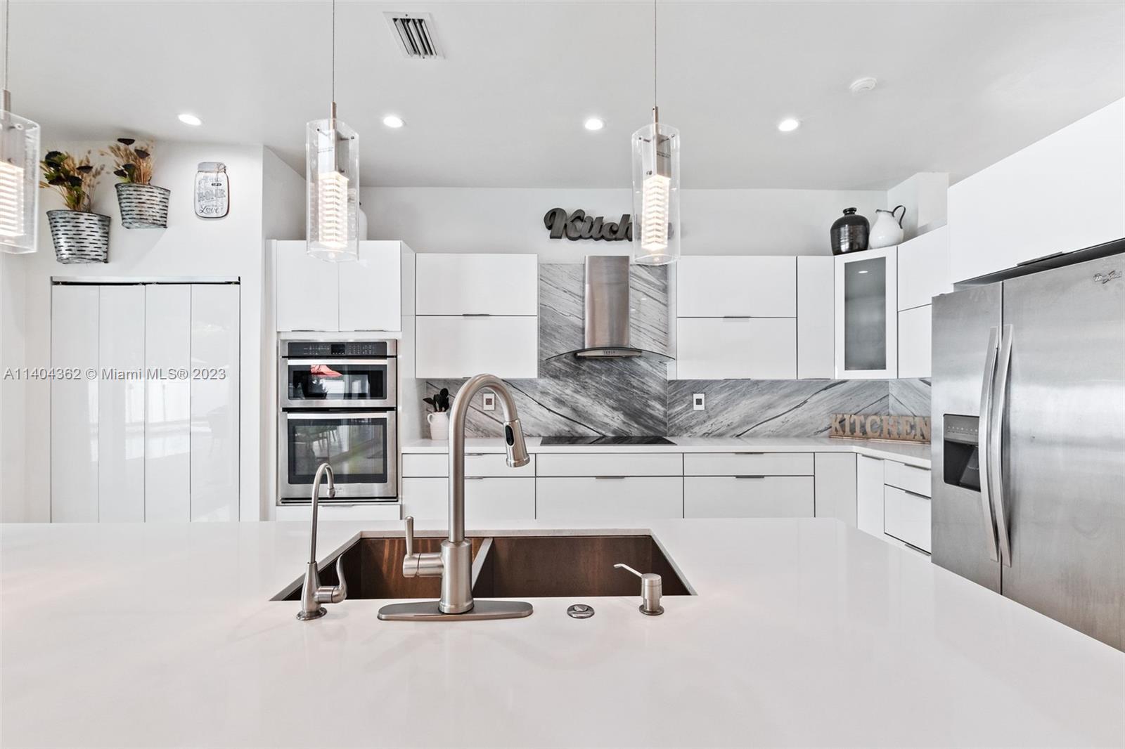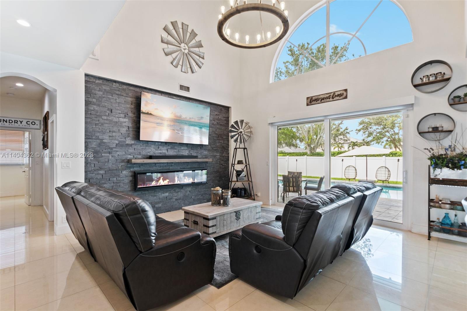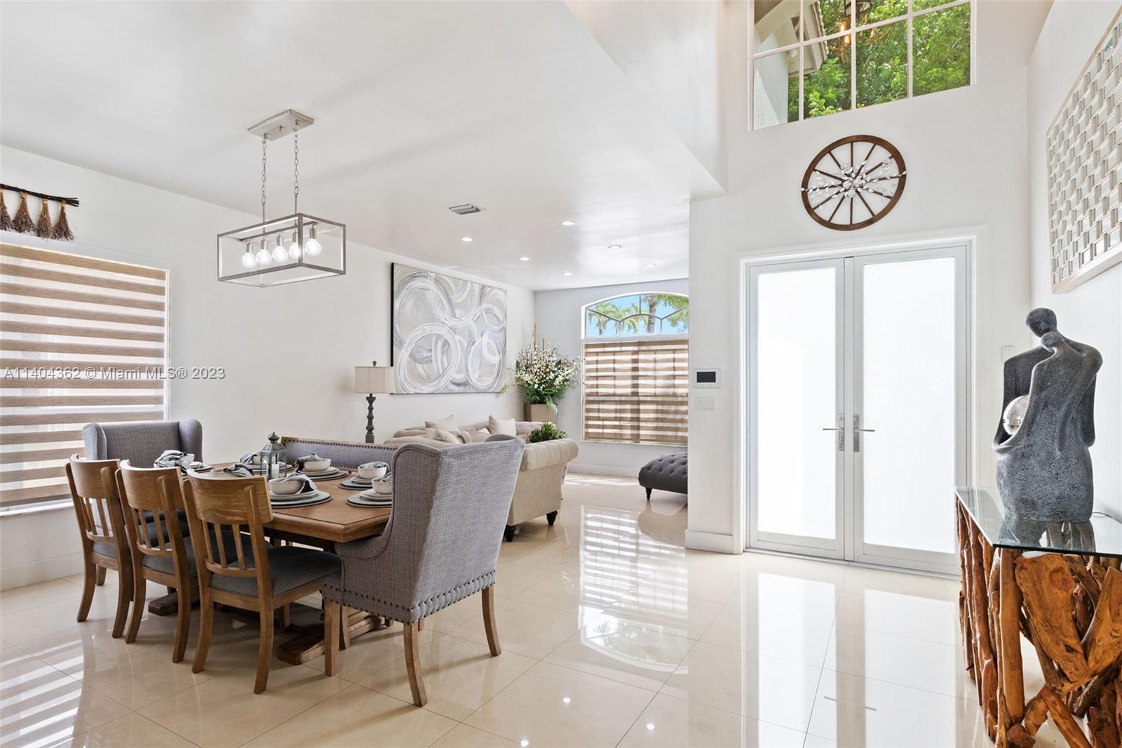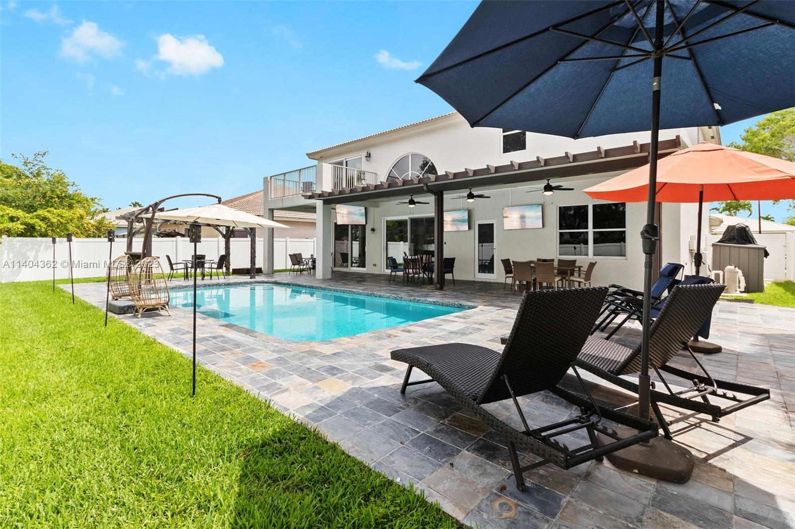 Spectacular 2 story home in Exclusive, Gated Pembroke Shores community. It features 5 bedrooms, 3 updated bathrooms, updated kitchen and beautiful ceramic tiles and wood floors. Up the elegant stairs boost 4 bedrooms, 2 Bathrooms and cosy, relaxing patio off Master Bedroom. There are built in closets and updated Master Bathroom with separate shower and tub. Downstairs shows off its ceramic floors throughout; a full Bedroom, a full cabana bathroom and Laundry Room. Then there are the formal living and dining rooms; the modern, white, updated kitchen that opens up to the family room with the view of the pool and the spacious backyard with the extended, covered patio for entertaining. The home is elegantly finished with stylish Chandeliers and spot lighting.