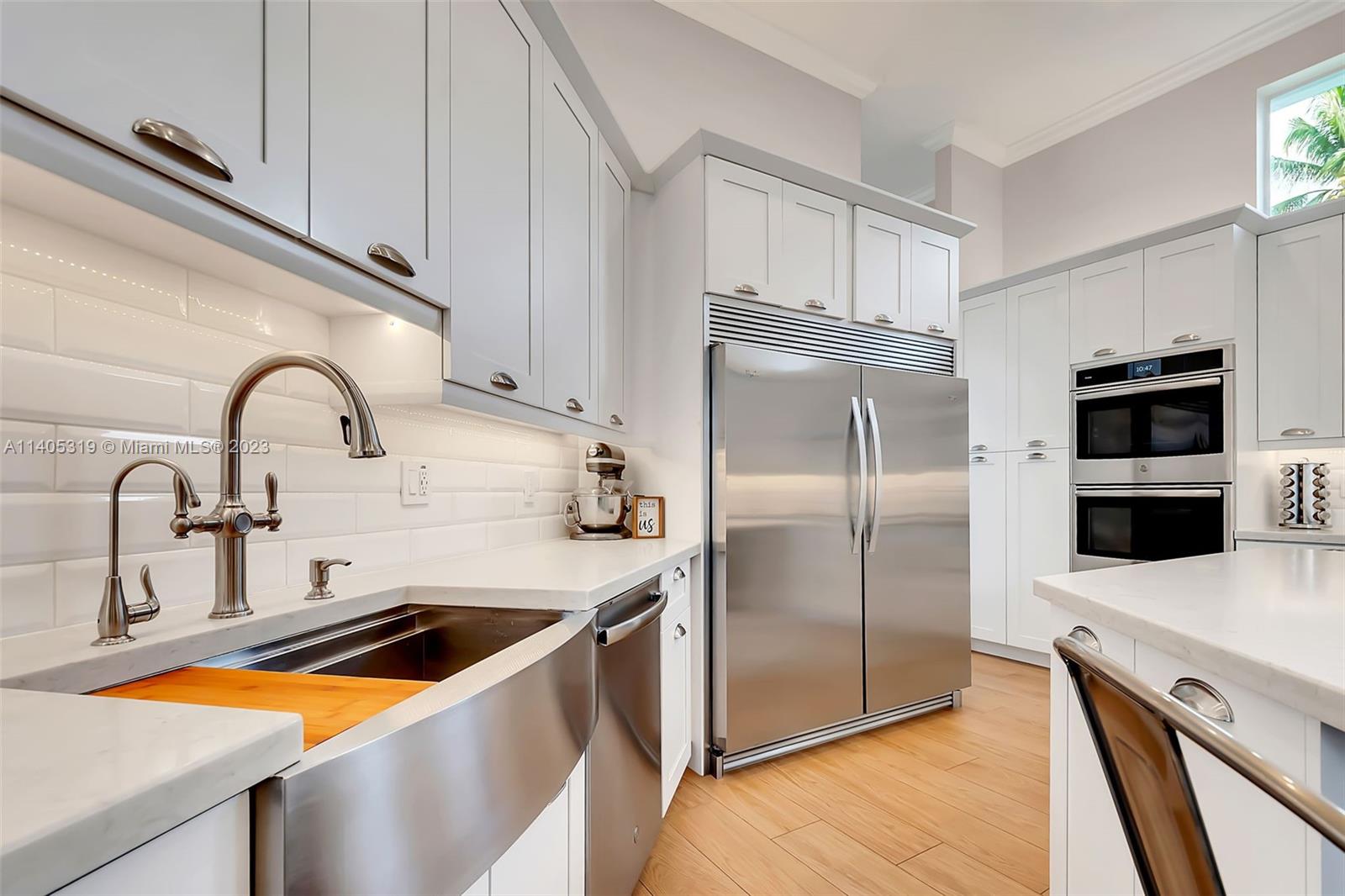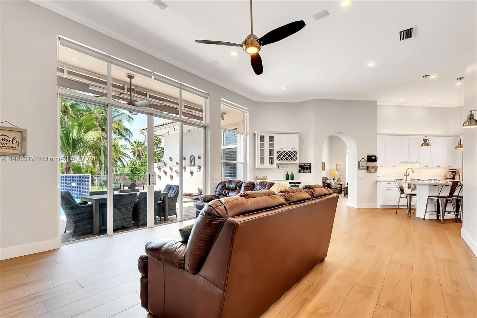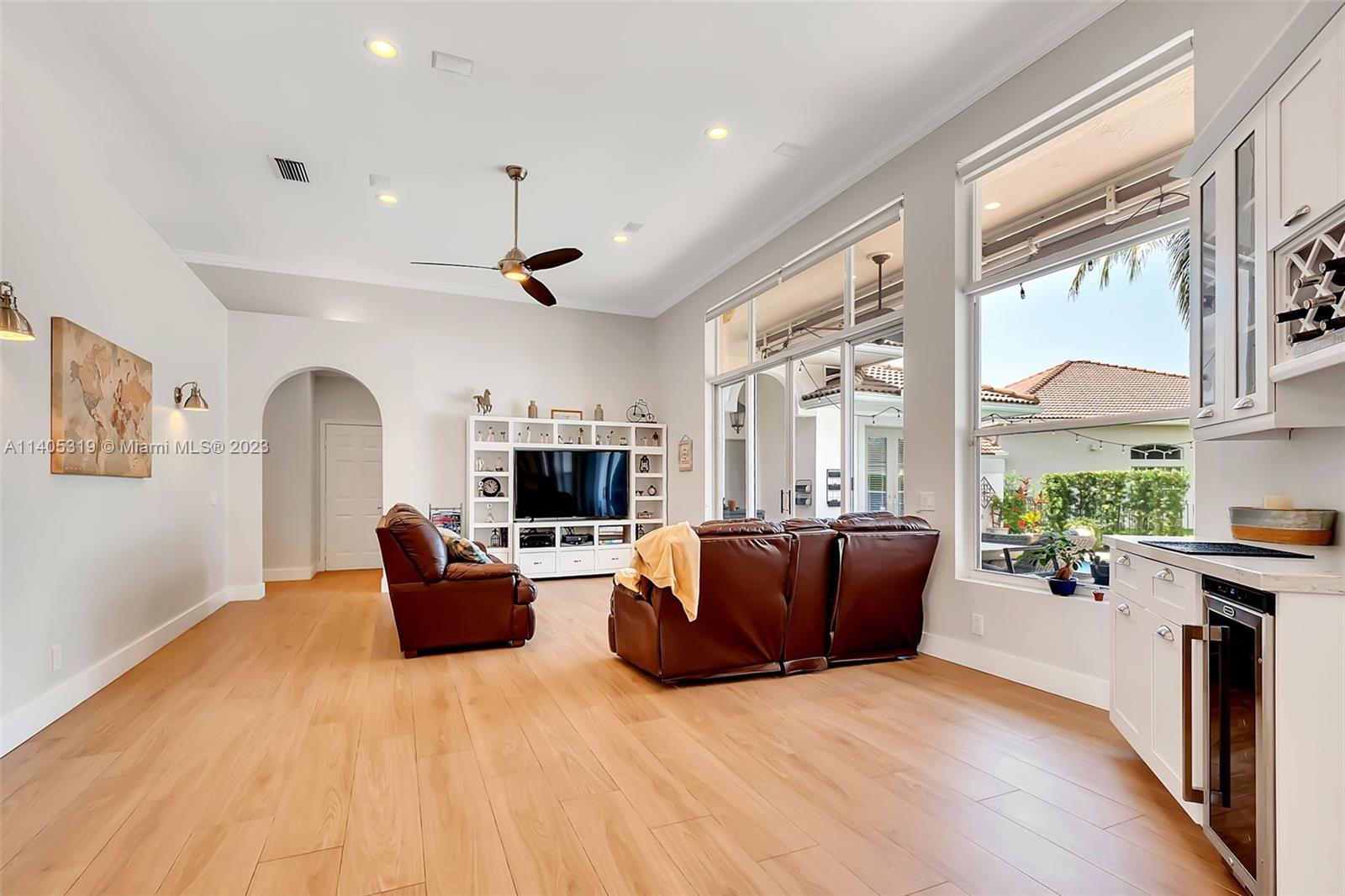 Discover luxury living in this beautiful "courtyard model" home nestled in a cul-de-sac in the prestigious Weston Hills golf community. The home has a main house with 3 beds/3 baths and an additional 4th room and bathroom located in the guest house. The pool was resurfaced in 2020 and has a serene waterfall. Elegant wood-looking floor tiles adorn the entire home. The designer kitchen boasts white quartz countertops, white wood cabinets, a smart double oven, a 60" refrigerator, an electric stove top with an outside venting range hood, a bar with a wine cooler, and an oversized island—great for entertaining. The master bedroom features a pool-view sitting area. Plantation shutters and remodeled bathrooms add to the allure. Near a community park just a short walk away. Weston A+ Schools.