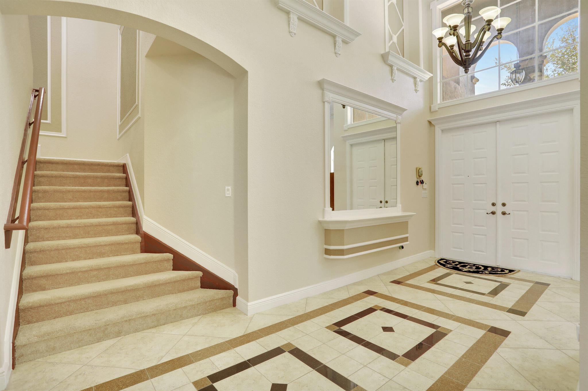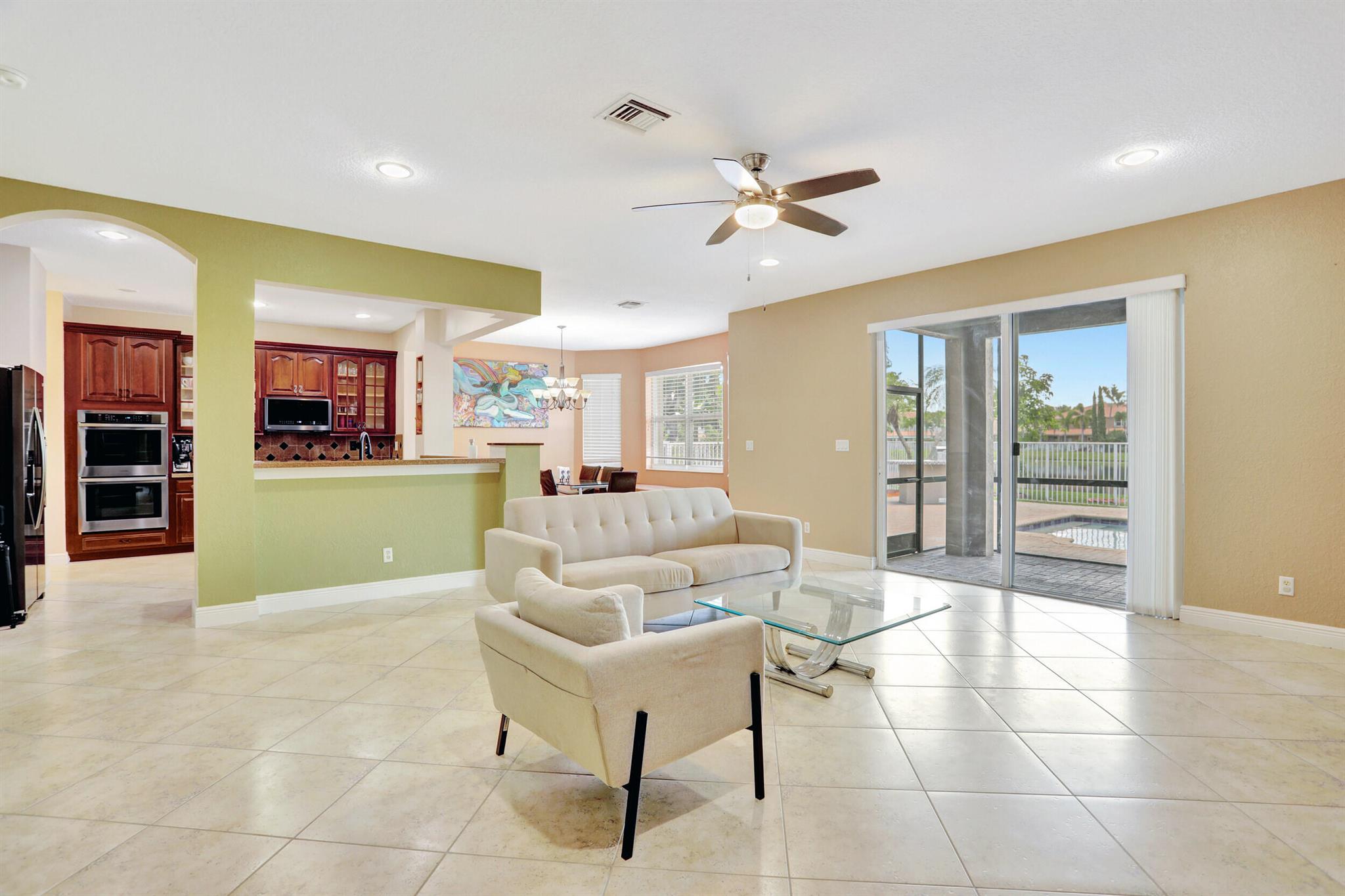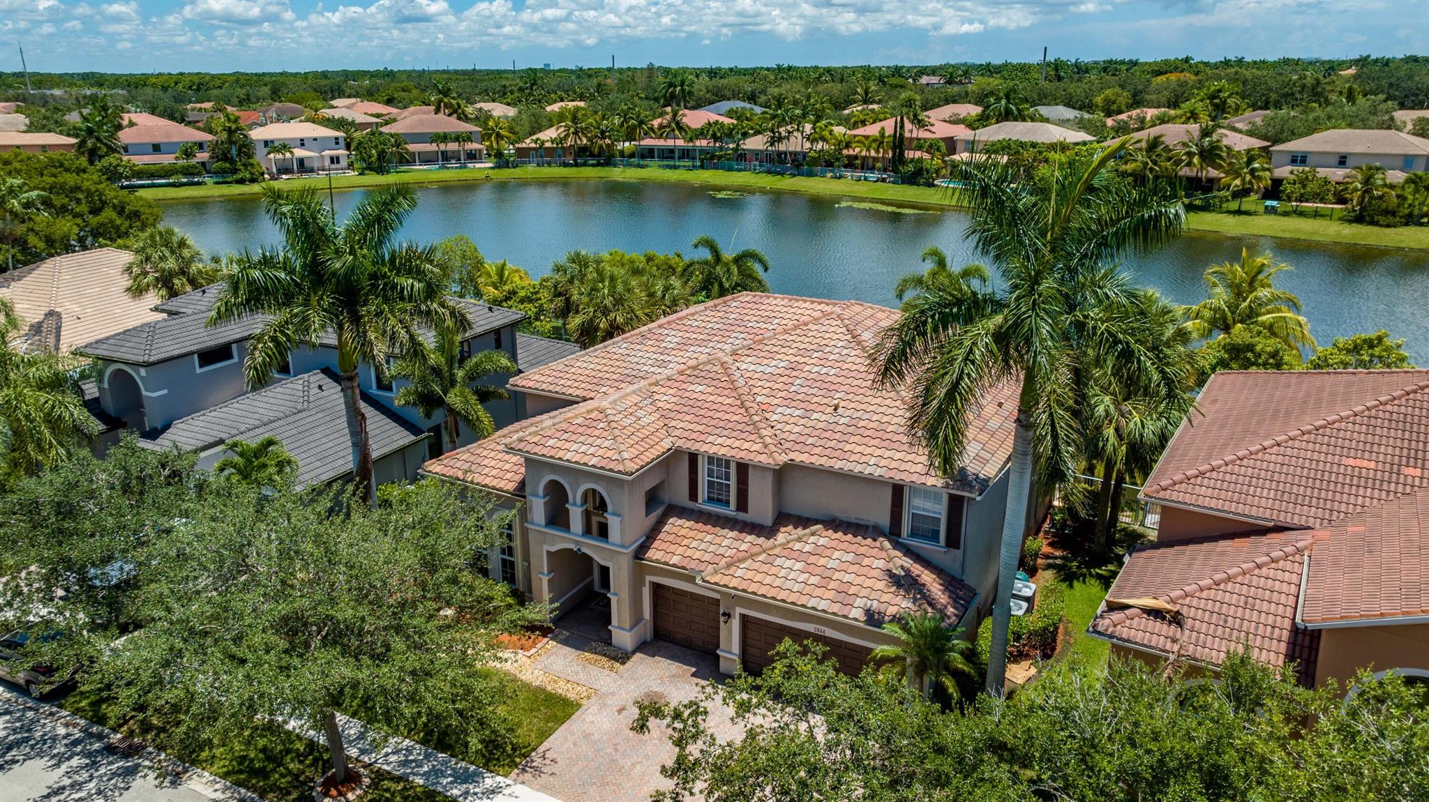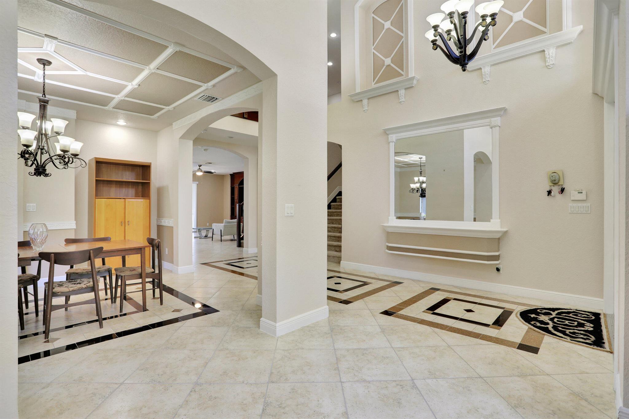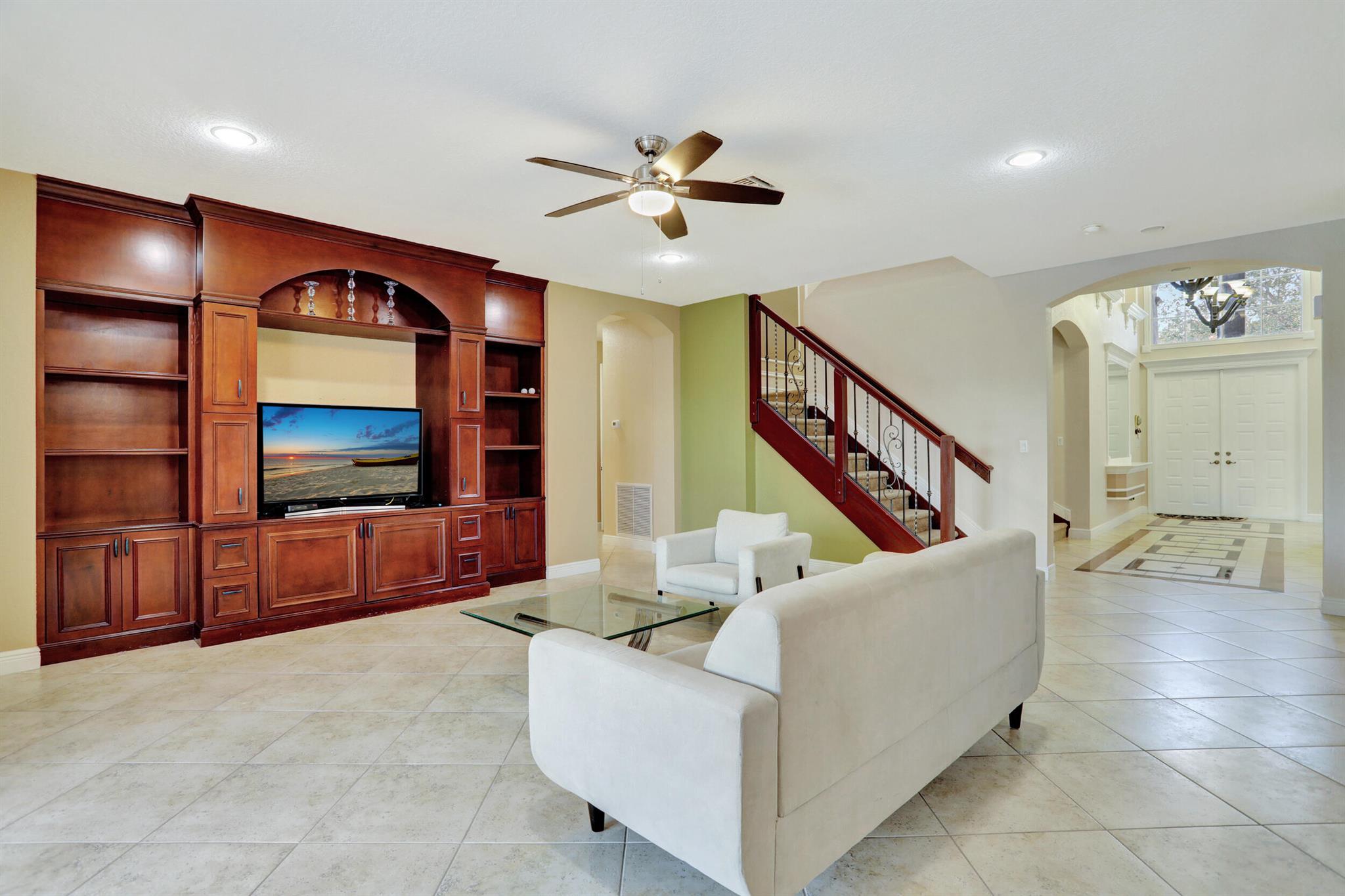 Take this opportunity on this amazing property when you enter you will find the open feeling layout along with the voluminous ceilings and porcelain tile throughout. The renovated kitchen w all new black stainless appliances opens to the breakfast and family area with built in large window bench that over looks the patio and lake. Family room with built in shelves, formal dining room & living room. Home has 5 BR + Loft w built in office area w/desk and built in bookshelves..The master (on 2nd fl) has a huge sitting area with two walking California style closets, a redone Master bathroom with tub/jacuzzi, There is a BR on first floor w it's on suite full bath, walk in closet and sliding glass door that opens to patio & lake. Upstairs is Jack & Jill type BRs (one w/built in shelves, and a