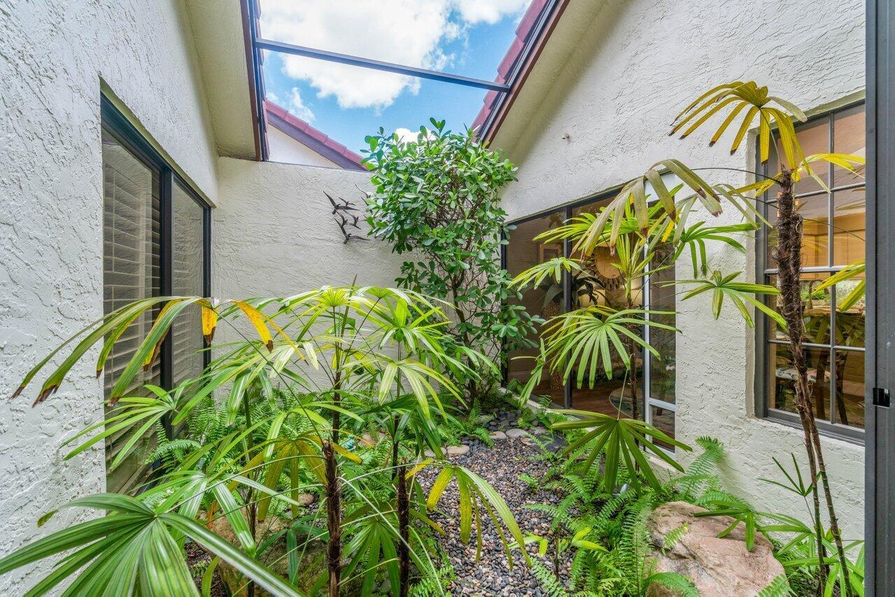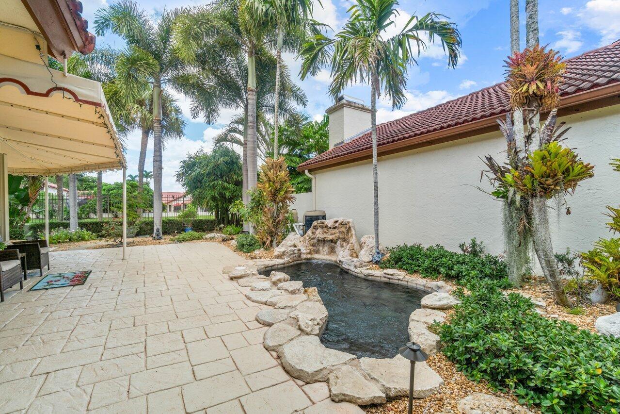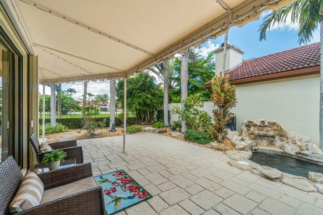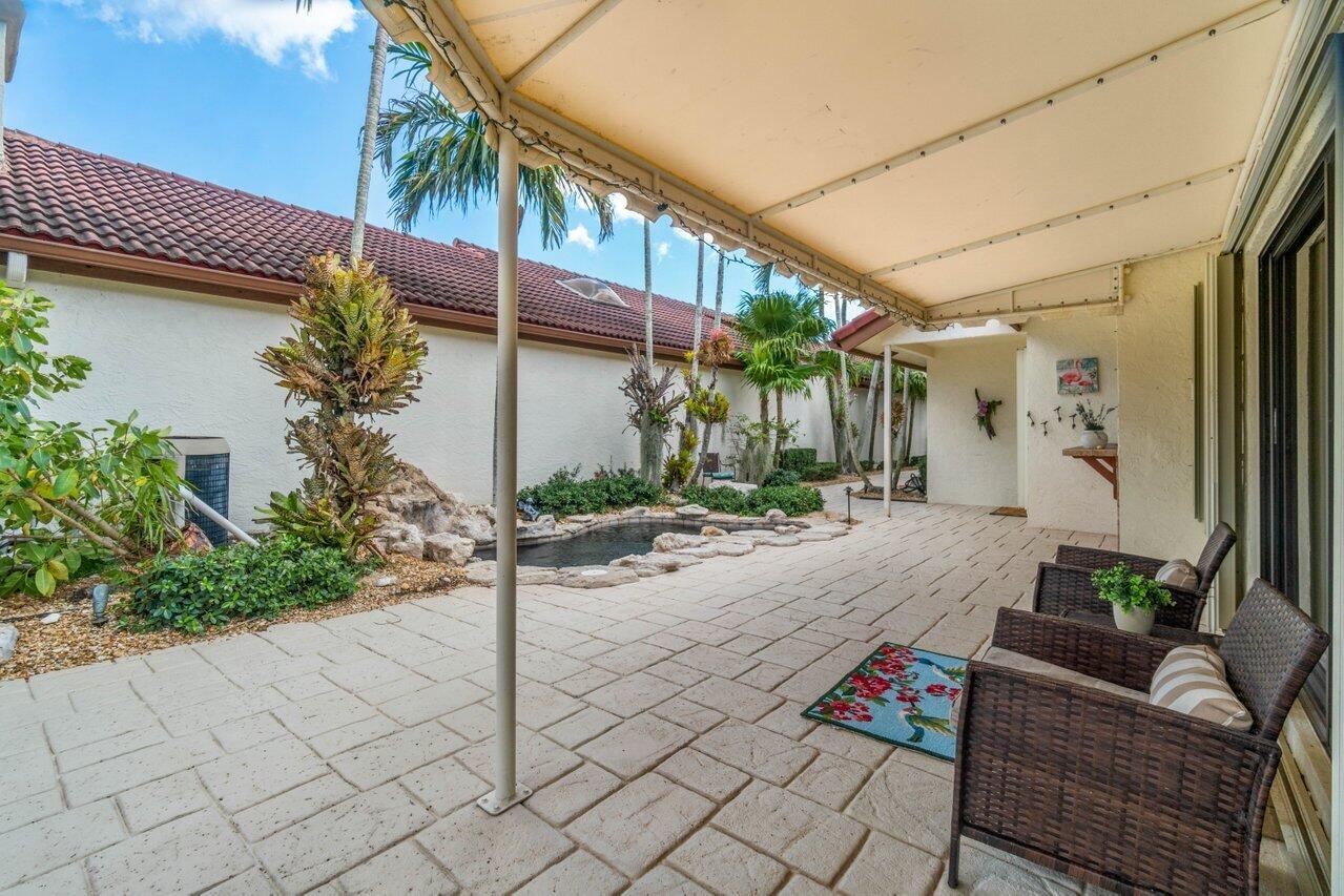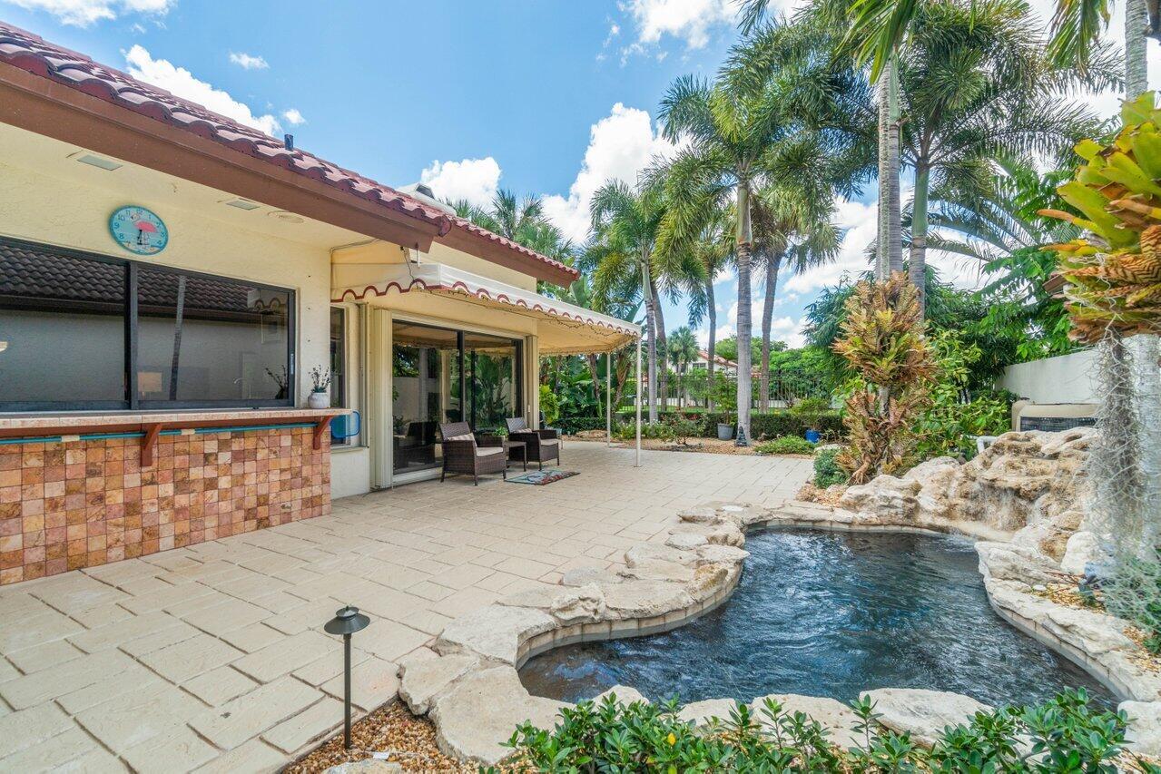 A must see! Beautiful lakefront Antigua model offers two bedrooms plus flexible den/office space. Tropical private oversized backyard oasis perfect for outdoor entertaining, dining alfresco or relaxing in your tropical waterfall jetted splash/plunge pool. Bright open floorplan with vaulted ceilings, fireplace & wet bar. Bright kitchen w/skylight, cream granite countertops and stainless appliances. Primary suite offers vaulted ceilings, views of tranquil atrium, walk in closet, spacious bath w/dual sinks, separate tub & shower. Generous guest en-suite. Oversized 2CG with additional storage.