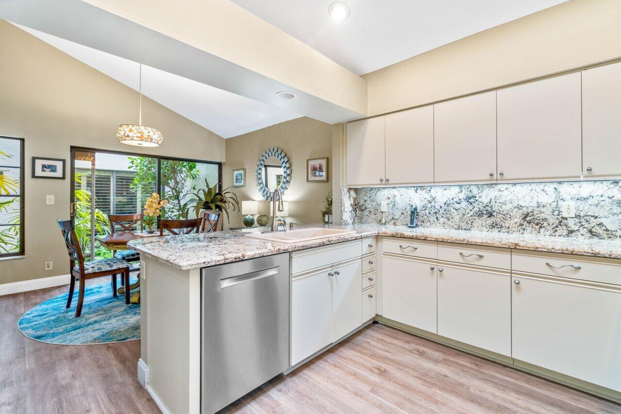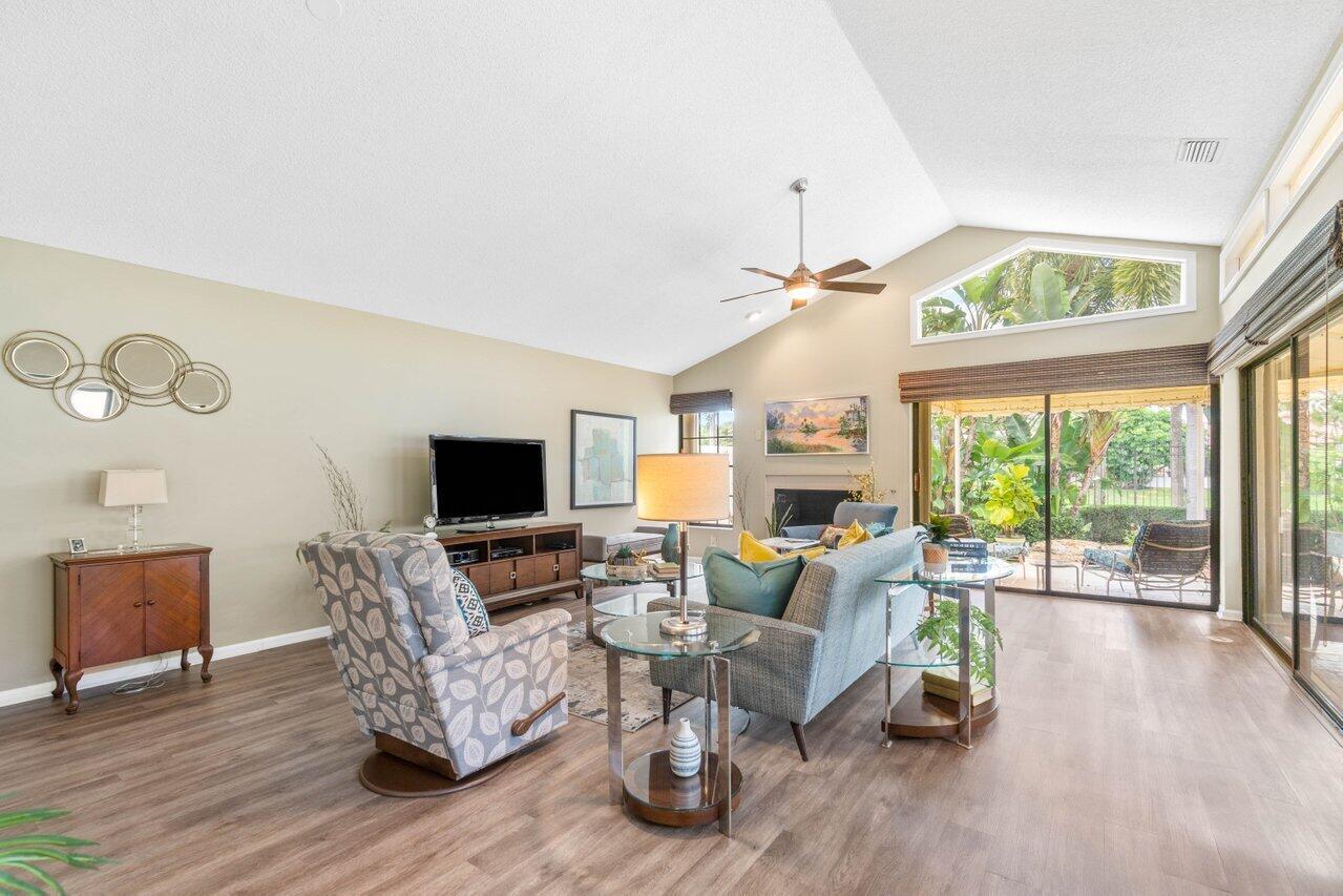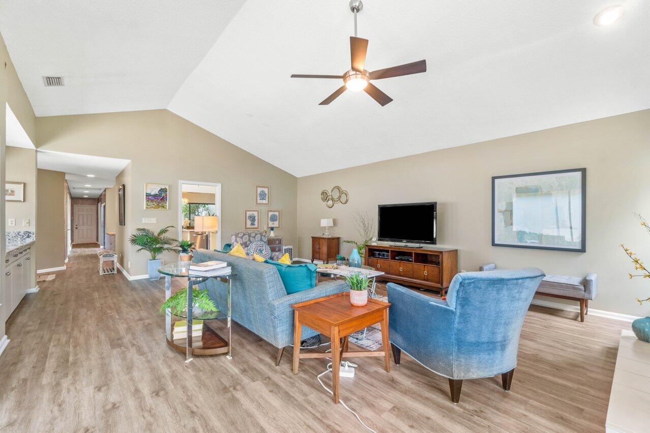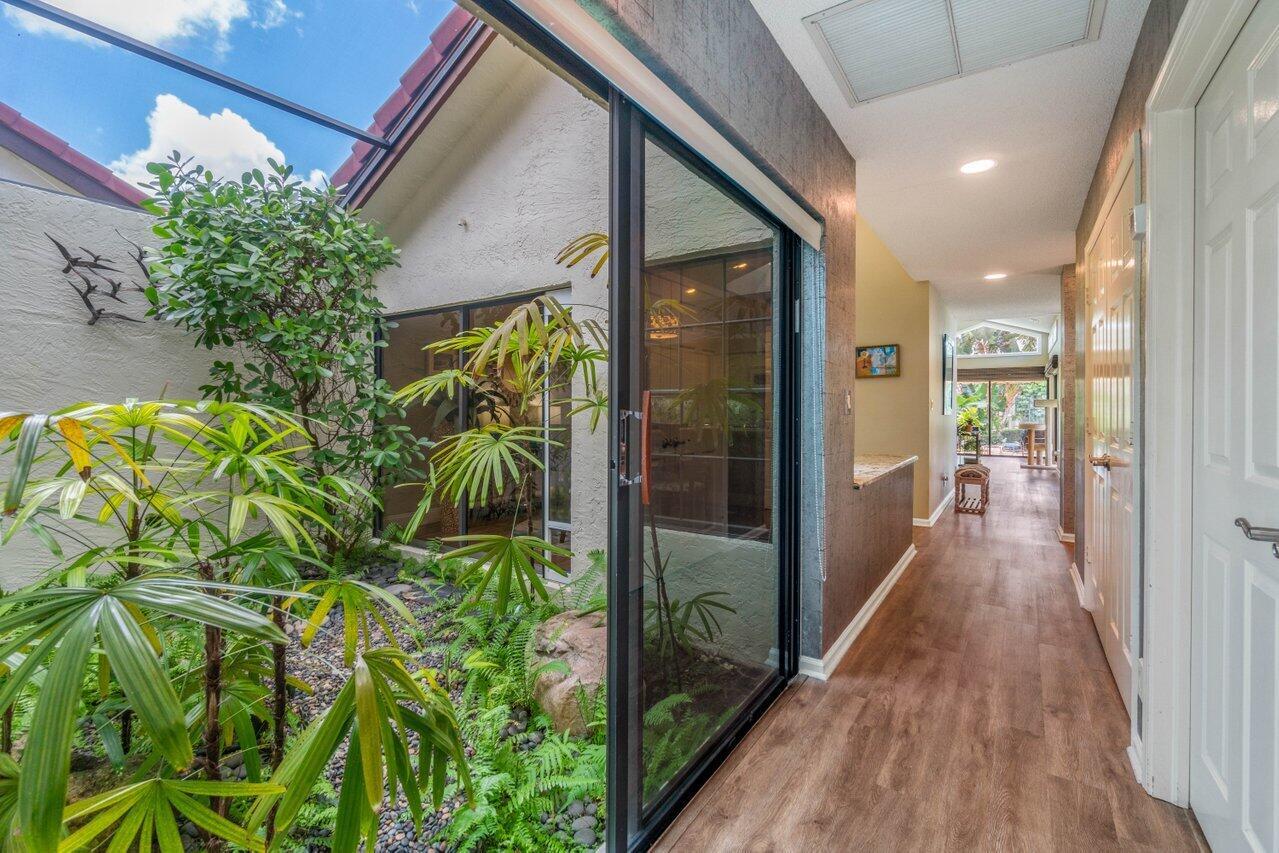 A must see! Beautiful lakefront Antigua model offers two bedrooms plus flexible den/office space. Tropical private oversized backyard oasis perfect for outdoor entertaining, dining alfresco or relaxing in your tropical waterfall jetted splash/plunge pool. Bright open floorplan with vaulted ceilings, fireplace & wet bar. Bright kitchen w/skylight, cream granite countertops and stainless appliances. Primary suite offers vaulted ceilings, views of tranquil atrium, walk in closet, spacious bath w/dual sinks, separate tub & shower. Generous guest en-suite. Oversized 2CG with additional storage.