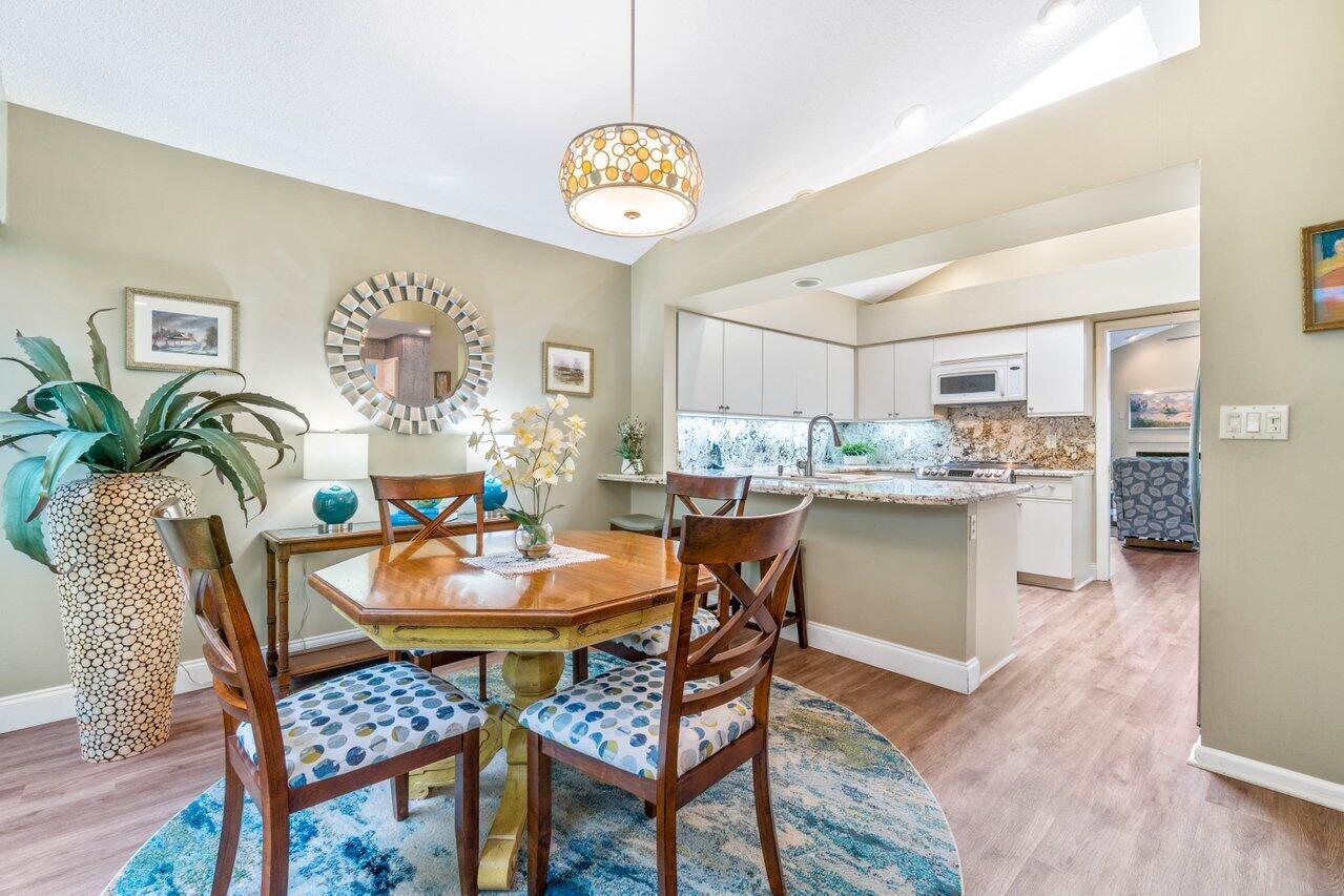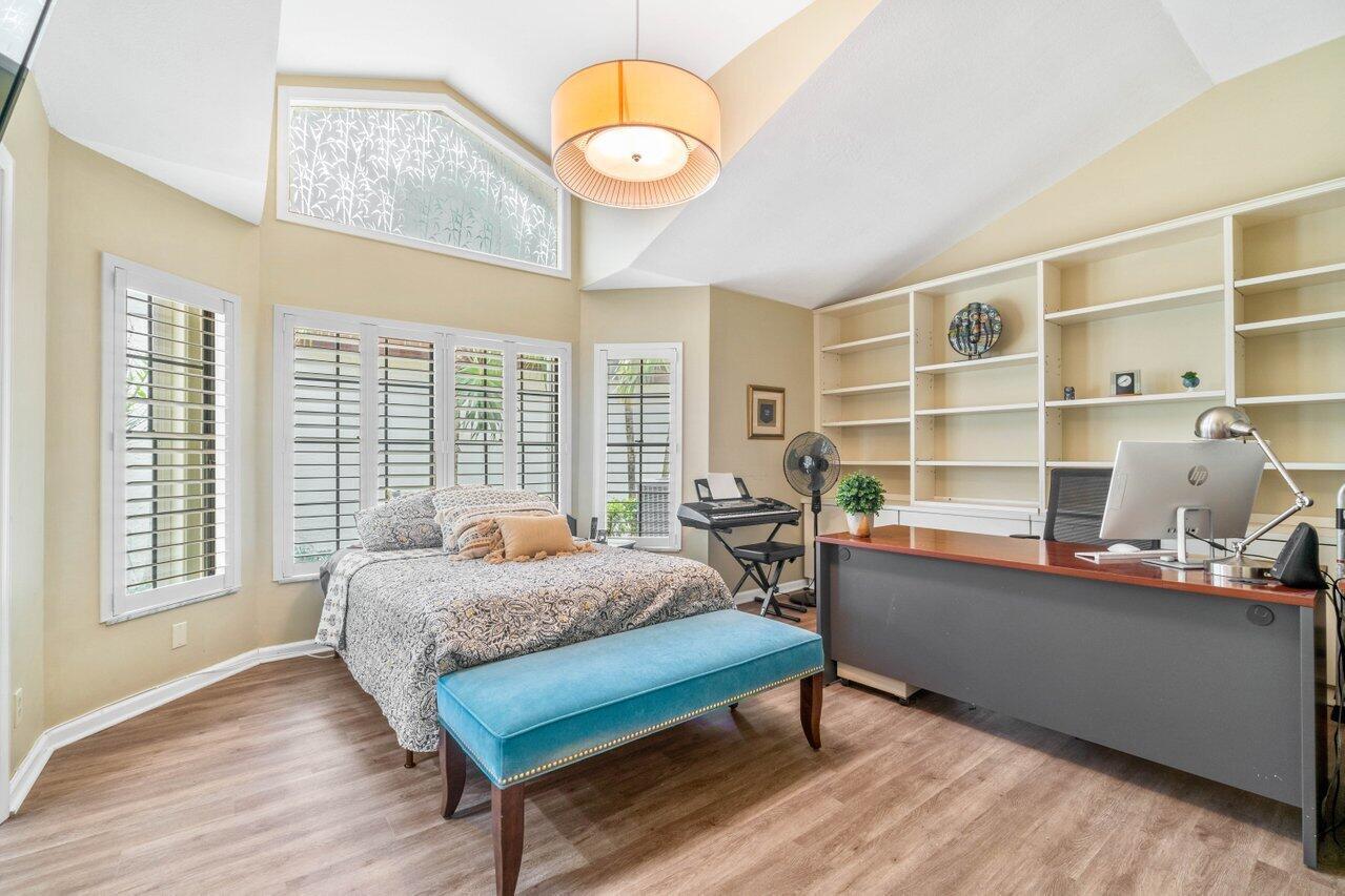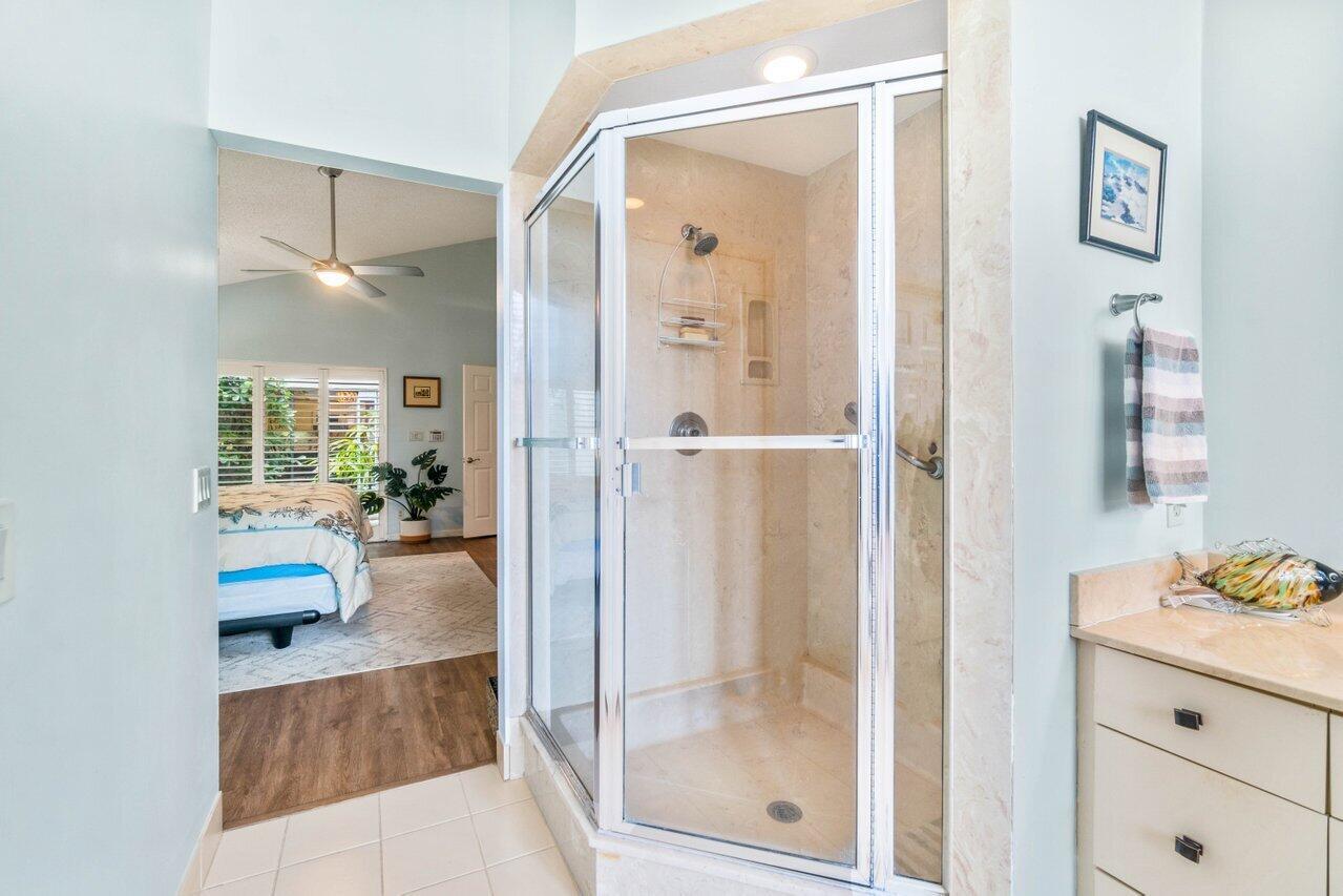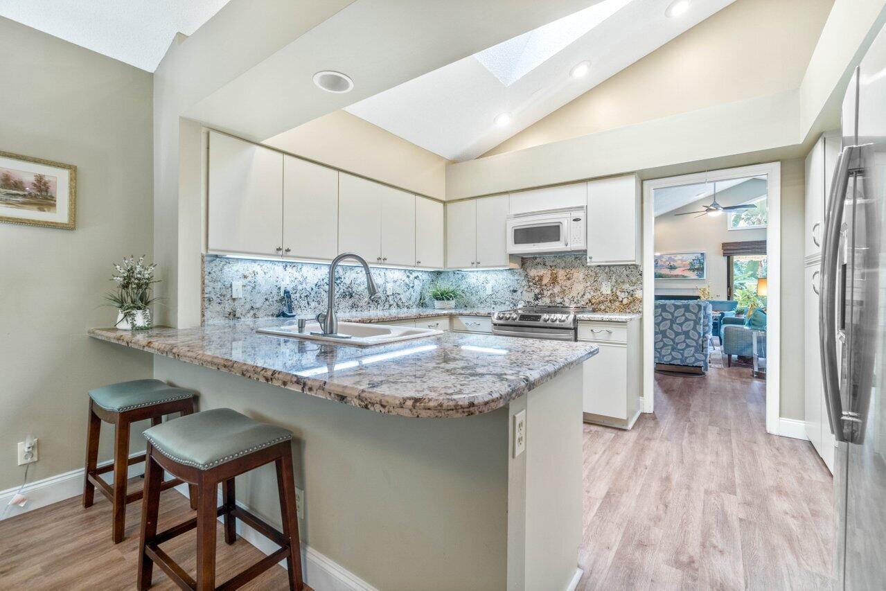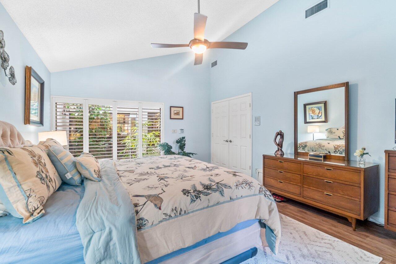 A must see! Beautiful lakefront Antigua model offers two bedrooms plus flexible den/office space. Tropical private oversized backyard oasis perfect for outdoor entertaining, dining alfresco or relaxing in your tropical waterfall jetted splash/plunge pool. Bright open floorplan with vaulted ceilings, fireplace & wet bar. Bright kitchen w/skylight, cream granite countertops and stainless appliances. Primary suite offers vaulted ceilings, views of tranquil atrium, walk in closet, spacious bath w/dual sinks, separate tub & shower. Generous guest en-suite. Oversized 2CG with additional storage.