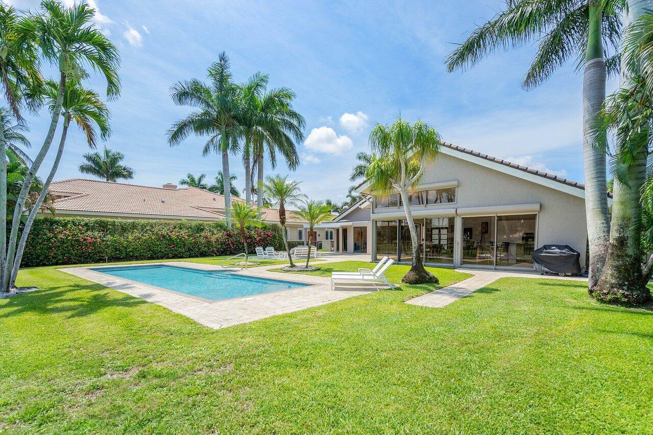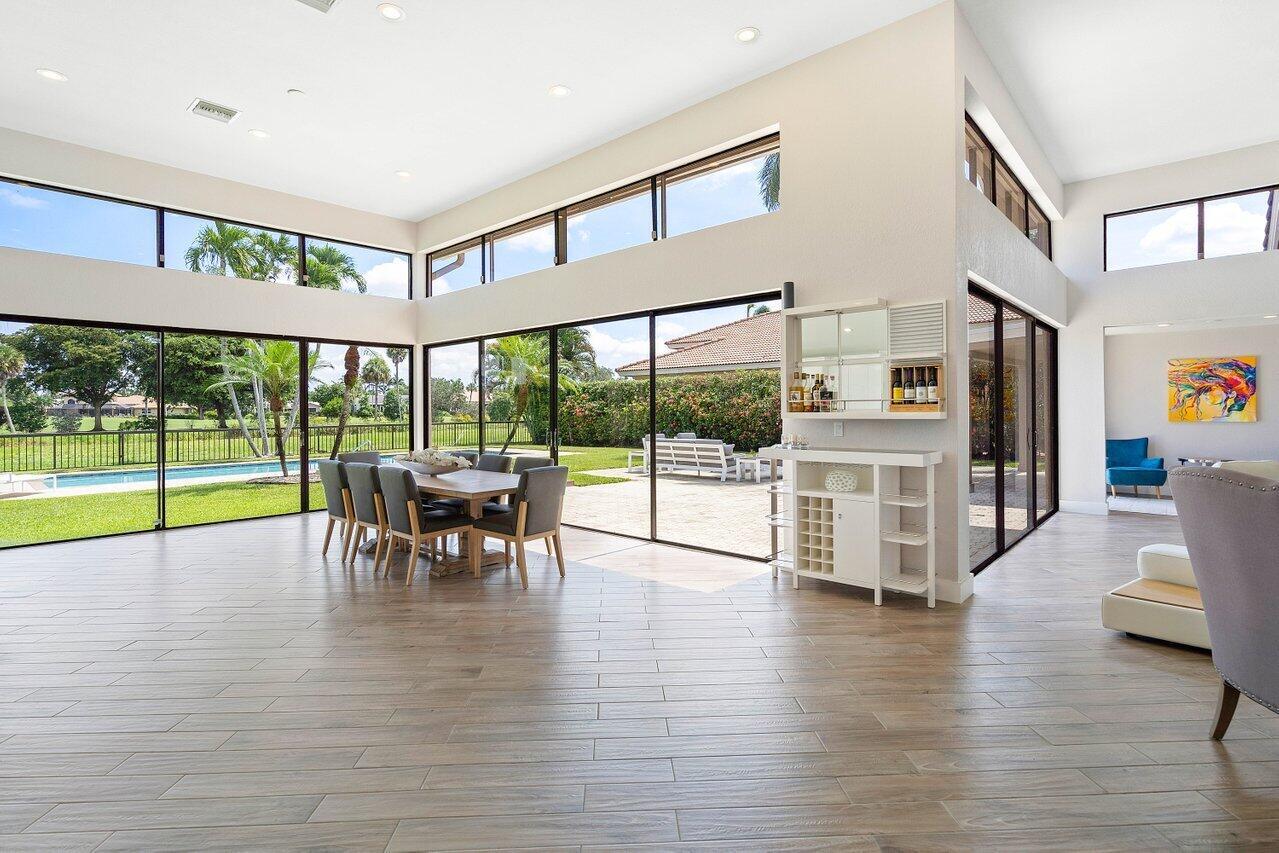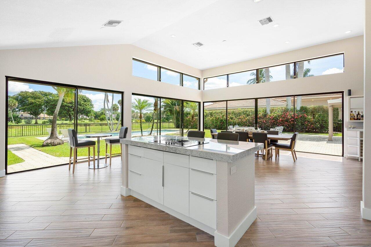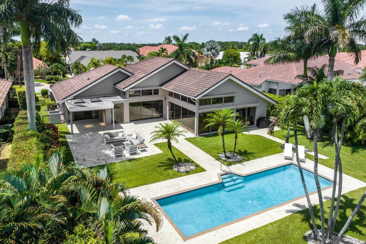 Immerse yourself in modern luxury! Beautifully renovated, open concept, high ceilings with stunning views in the exclusive Bocaire Country Club. All one level - no steps! Four bedrooms PLUS an office, this spacious home is perfect for entertaining or relaxing. Huge private back patio overlooking newly resurfaced pool, lush gardens, canal & golf course. Chefs kitchen with gorgeous Island. Don't miss it! Bocaire is a boutique mandatory membership Country Club with only 239 homes on one circle...no divided sections. It is an inclusive, friendly and active community. Parents, children and grandchildren included in the membership. Renowned championship golf course, competitive and social golf, tennis & pickle ball programs, resort-like aquatics center, 24 hour fitness center