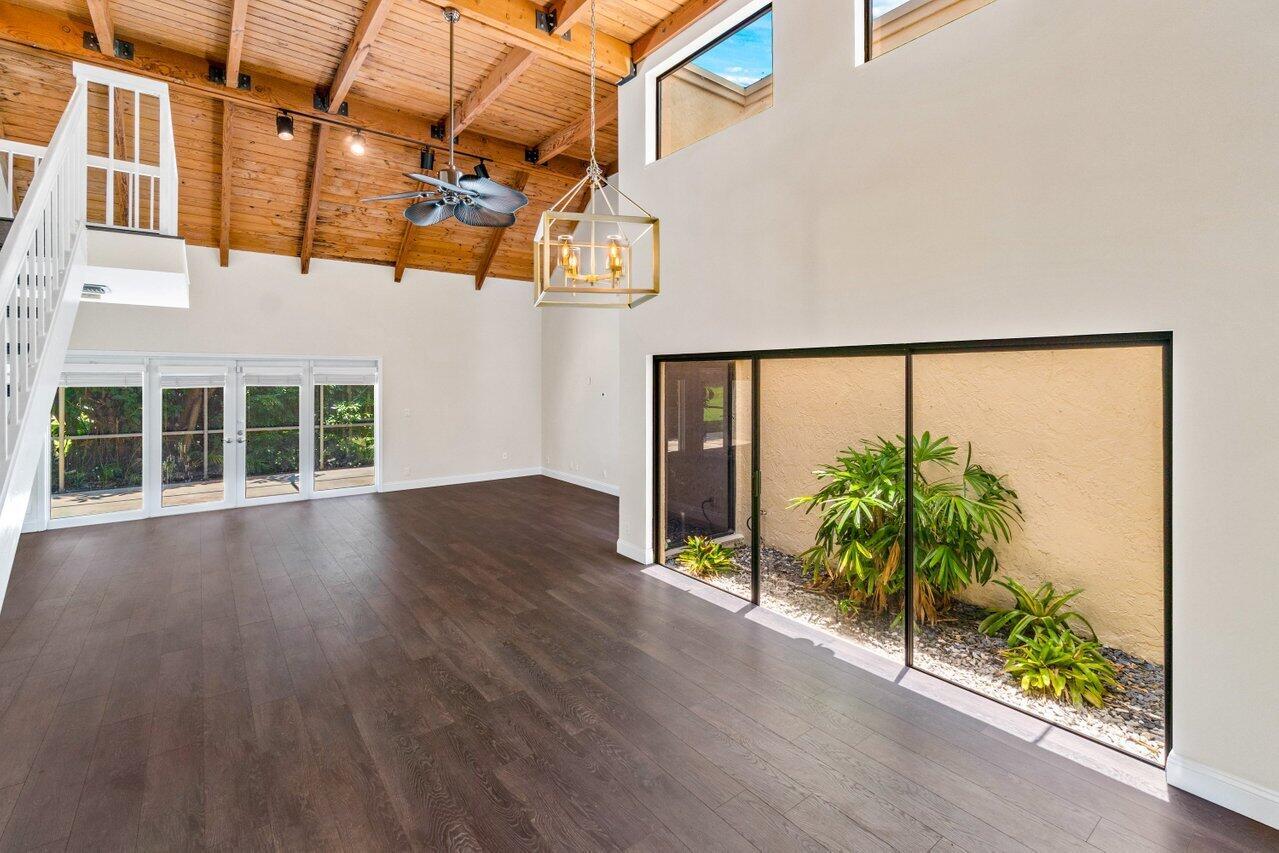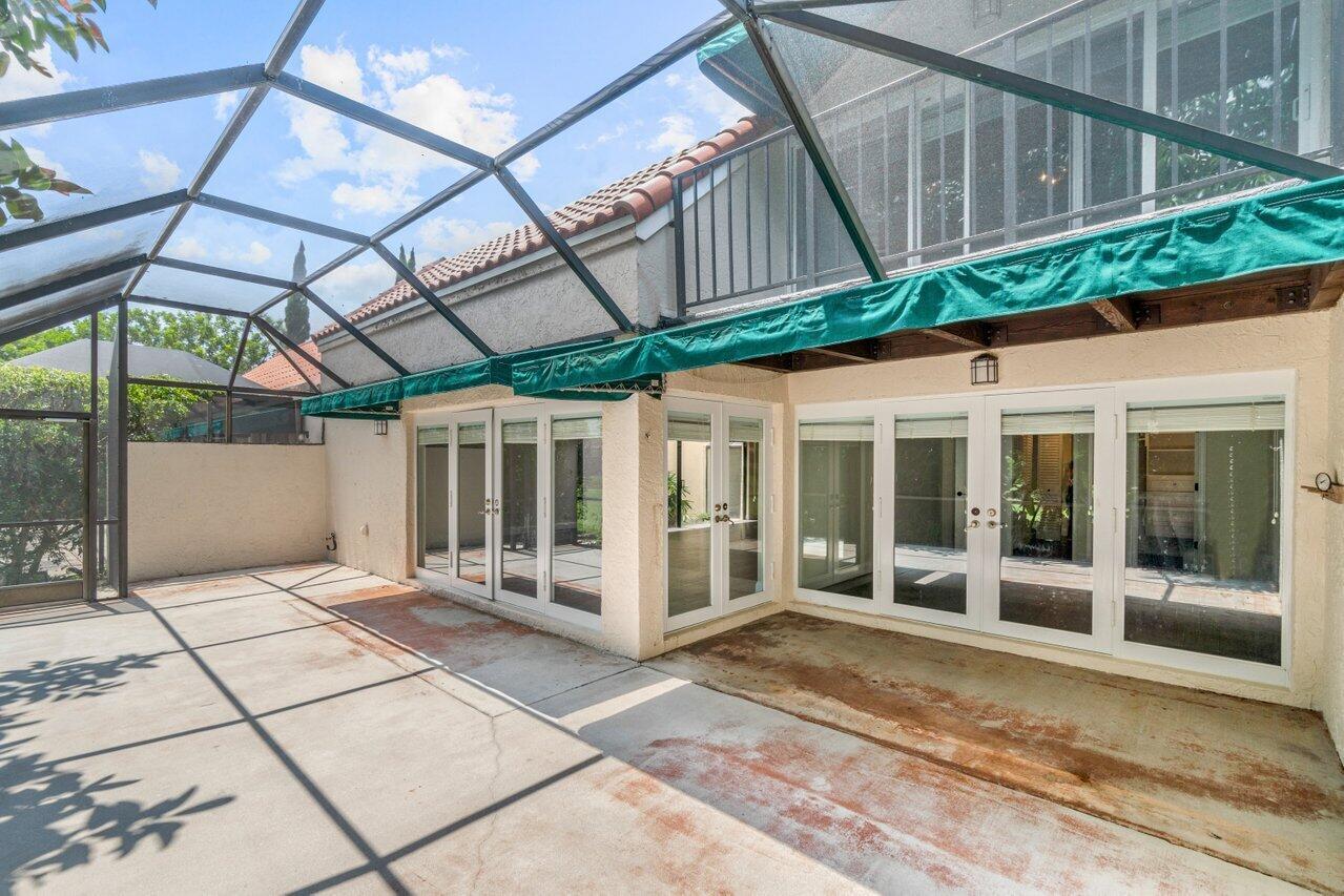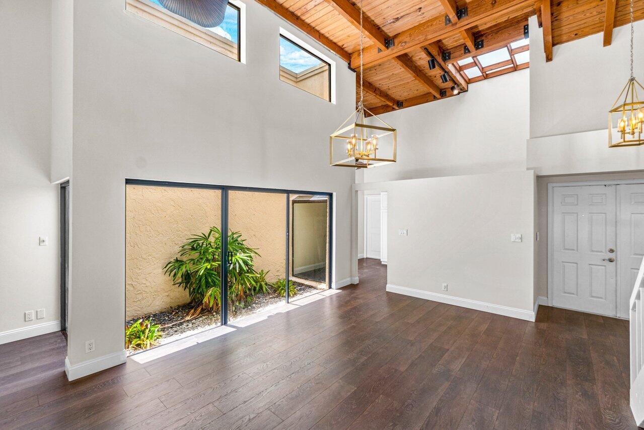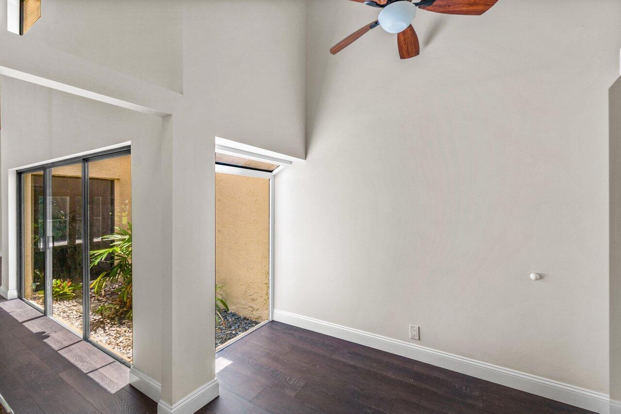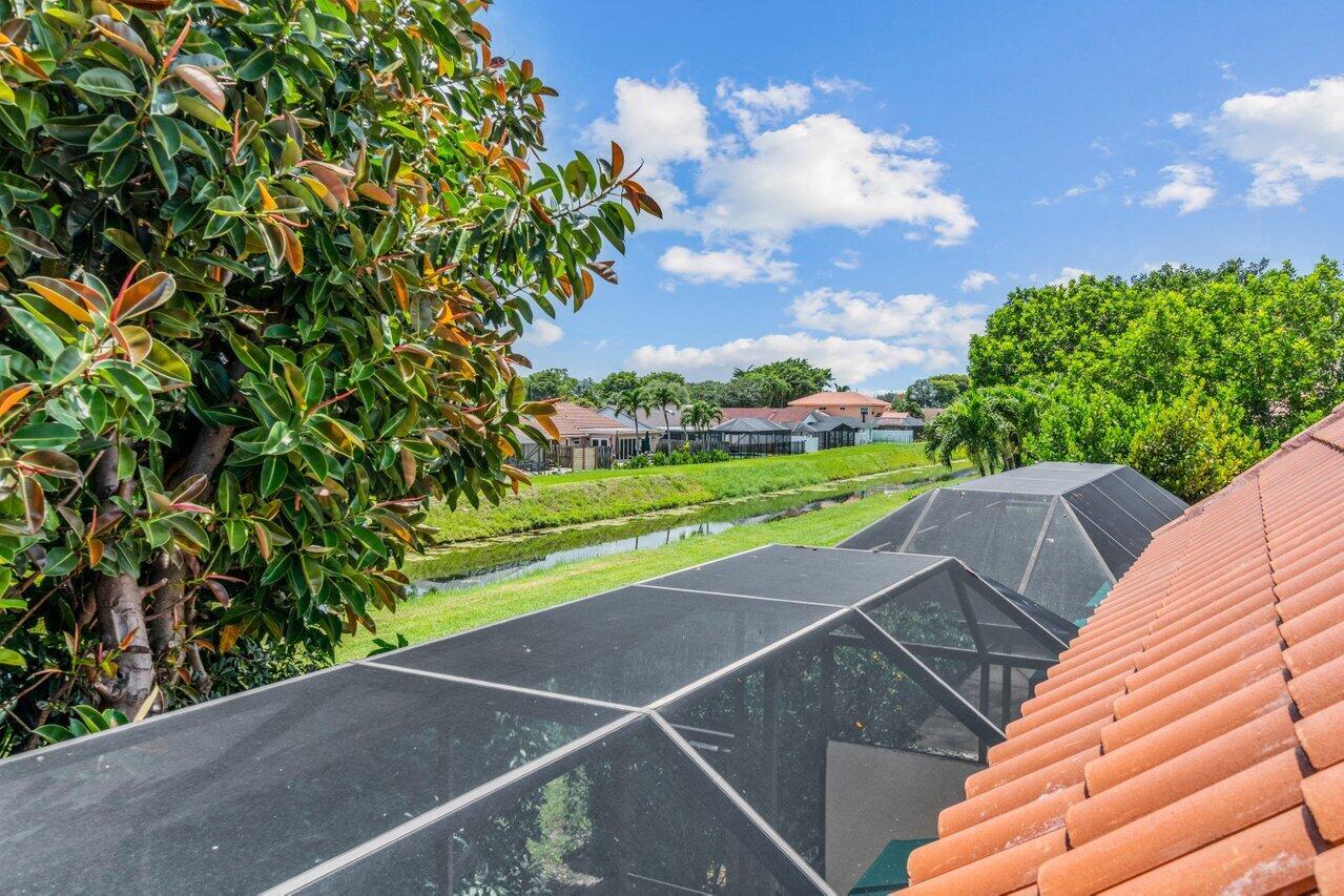 Spacious open 3/2 townhome with a 1-car garage and Brand-New Roof in central Boca Raton. Flooded with natural light & showcasing exposed wooden beams with high ceilings in the main living area, and a private primary suite on the upper floor. The primary bath is completely renovated w/ a freestanding tub & separate shower, a large dual sink vanity & huge custom built out closet. New impact sliders in the primary bedroom that opens to a private balcony with no rear neighbors. Downstairs are two additional bedrooms with custom built out closets that share a full bathroom. A large, screened patio can be viewed & accessed by multiple doors & backs up to a canal making it very private. Walk to the new A+ rated Verde K-8 school and minutes from Town Center Mall, fine dining, and shopping.
