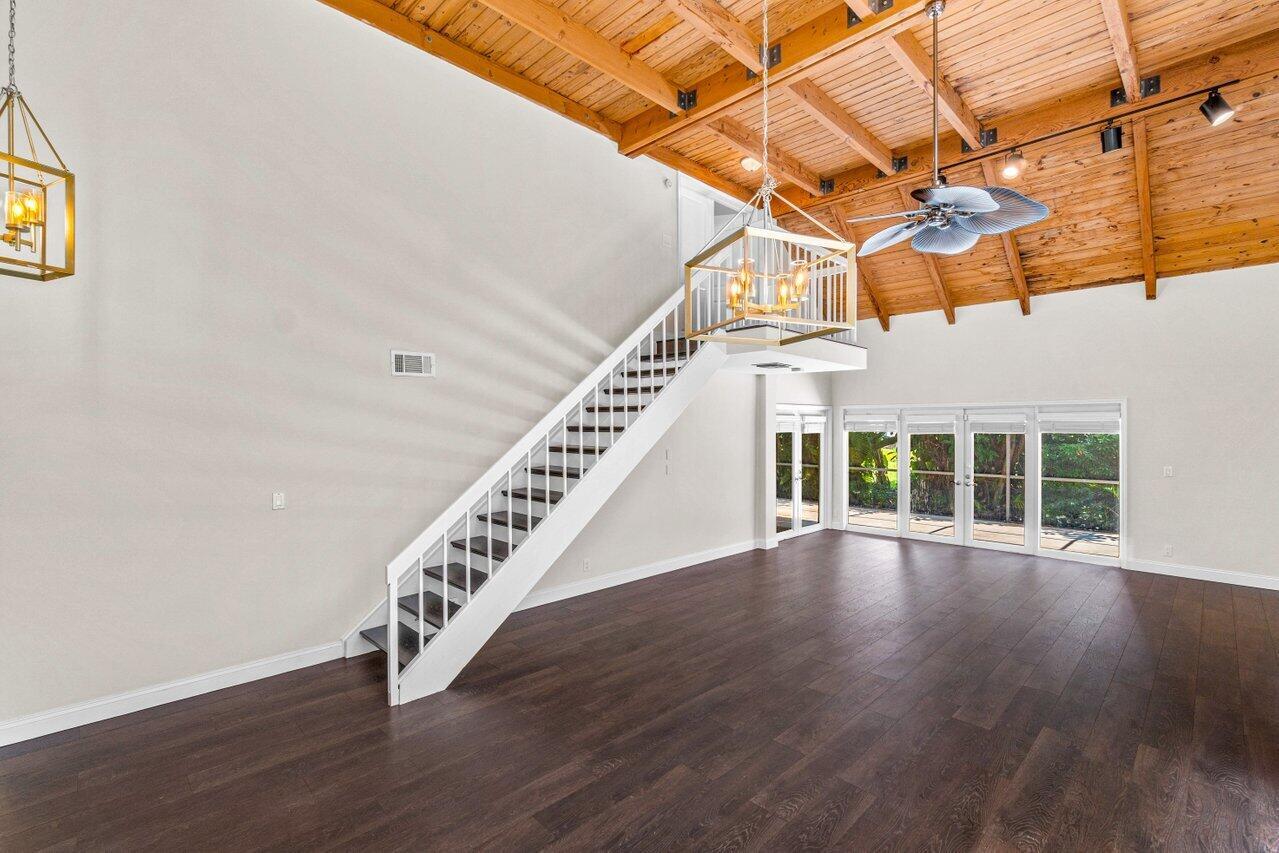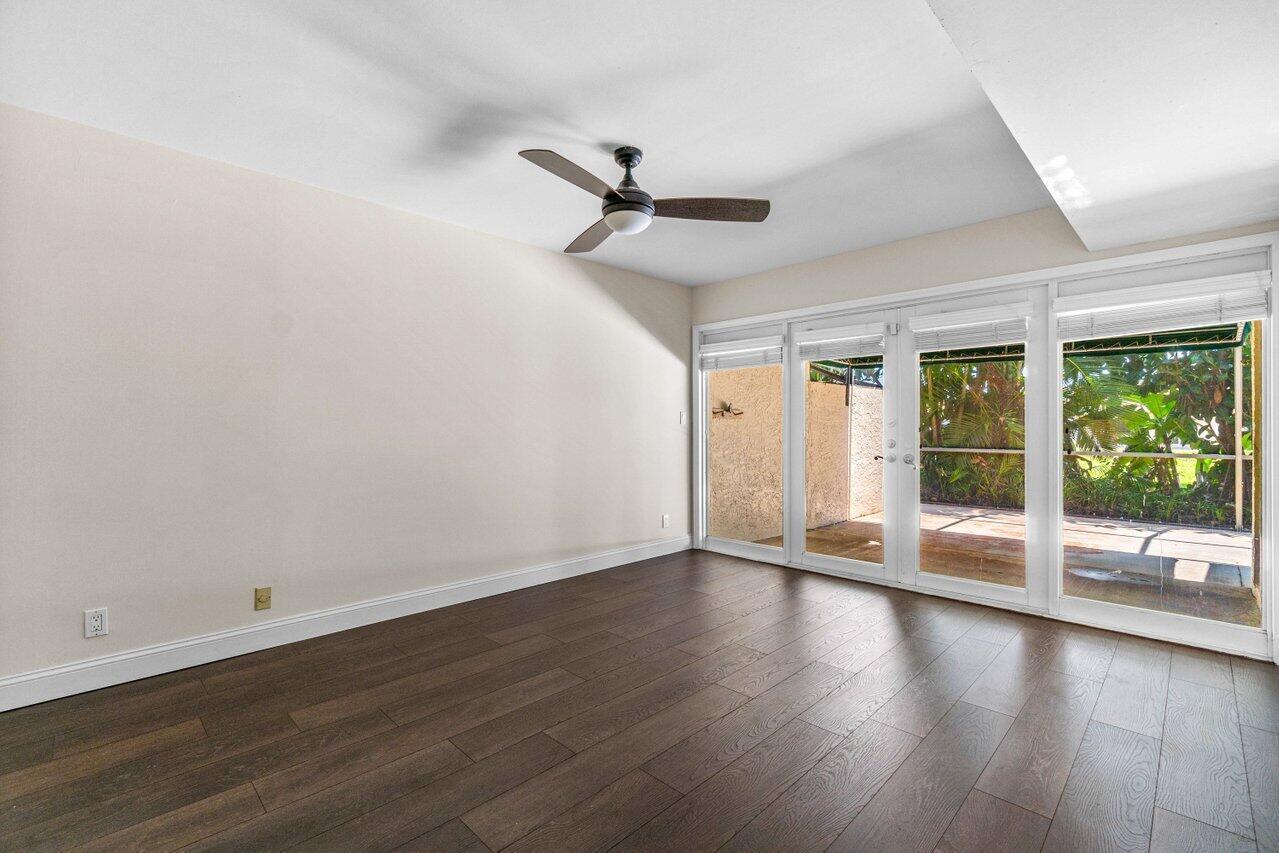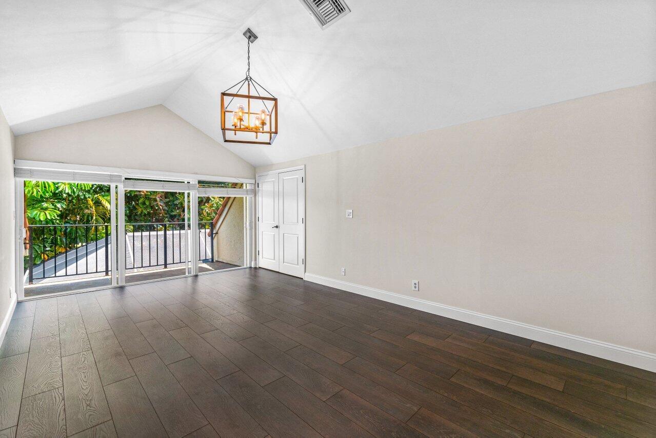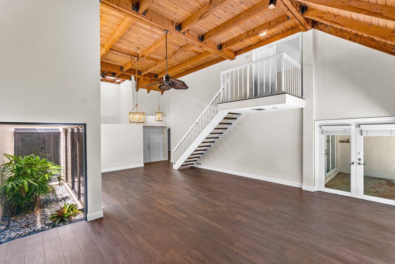 Spacious open 3/2 townhome with a 1-car garage and Brand-New Roof in central Boca Raton. Flooded with natural light & showcasing exposed wooden beams with high ceilings in the main living area, and a private primary suite on the upper floor. The primary bath is completely renovated w/ a freestanding tub & separate shower, a large dual sink vanity & huge custom built out closet. New impact sliders in the primary bedroom that opens to a private balcony with no rear neighbors. Downstairs are two additional bedrooms with custom built out closets that share a full bathroom. A large, screened patio can be viewed & accessed by multiple doors & backs up to a canal making it very private. Walk to the new A+ rated Verde K-8 school and minutes from Town Center Mall, fine dining, and shopping.