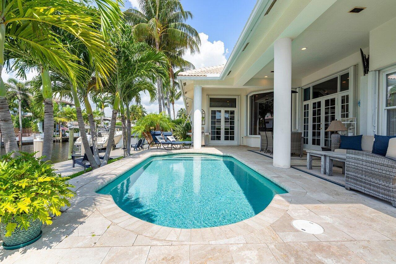 Custom Ranch 4-bedroom patio pool home on 85 feet of waterfront in much-sought Boca Harbour. Its elegantly appointed chef's kitchen features quartzite counter-tops, food prep island, snack bar, S-Steel appliances, plus a cozy breakfast nook. Travertine marble flooring compliments the spacious living areas with soaring 12-foot-high ceilings and crown molding. Bathrooms are updated with contemporary cabinetry and quartz vanity tops. Enjoy the best of outdoor Florida living with the highly desired southern exposure, providing year-around sunshine on the pool, patio, and waterside deck, all overlooking tranquil water views. Exterior attributes include: 3-car garage, 13,000 boat lift, new composite dock decking and lavish landscaping. 10 minutes to trendy Delray Ave, the beach or Mizner Park.