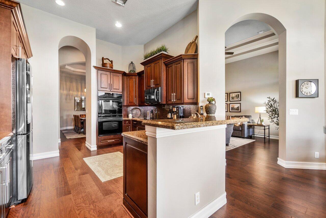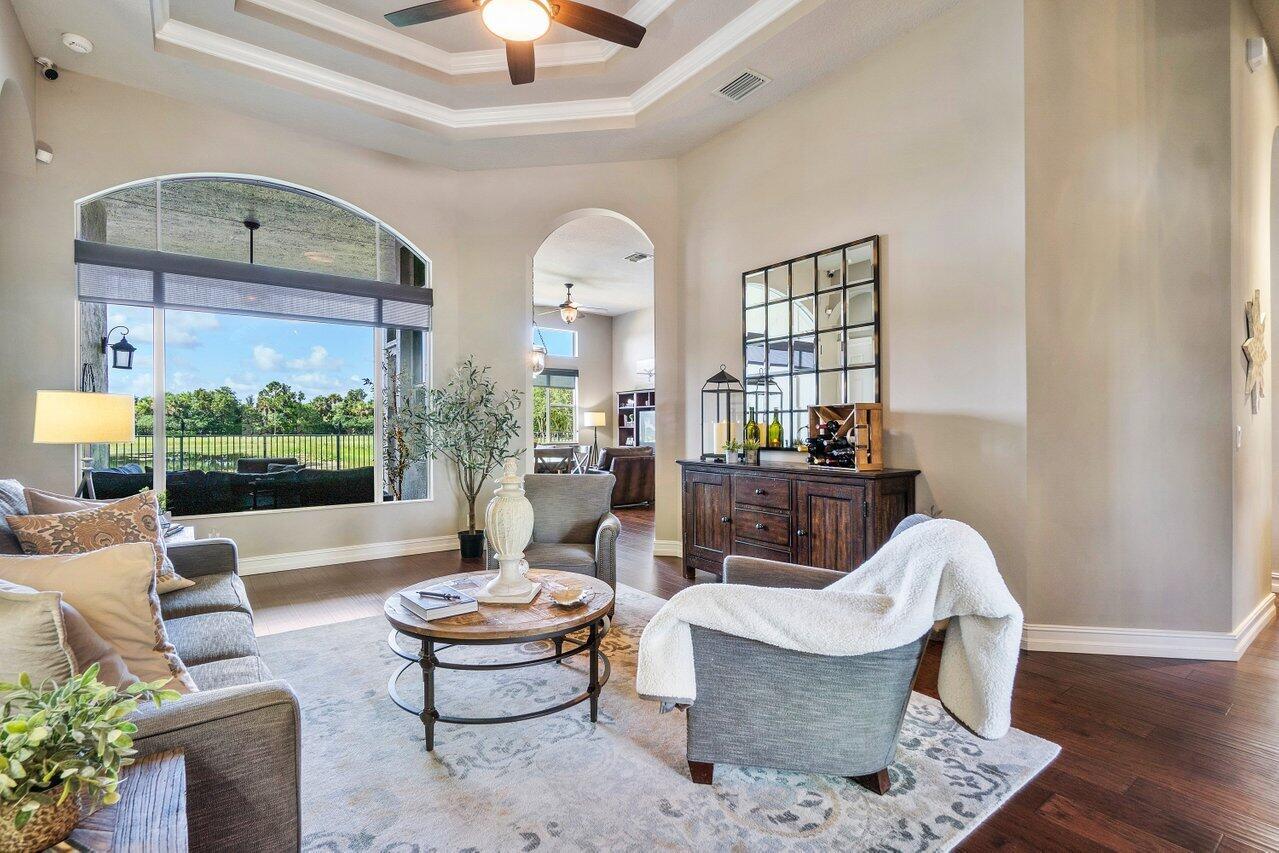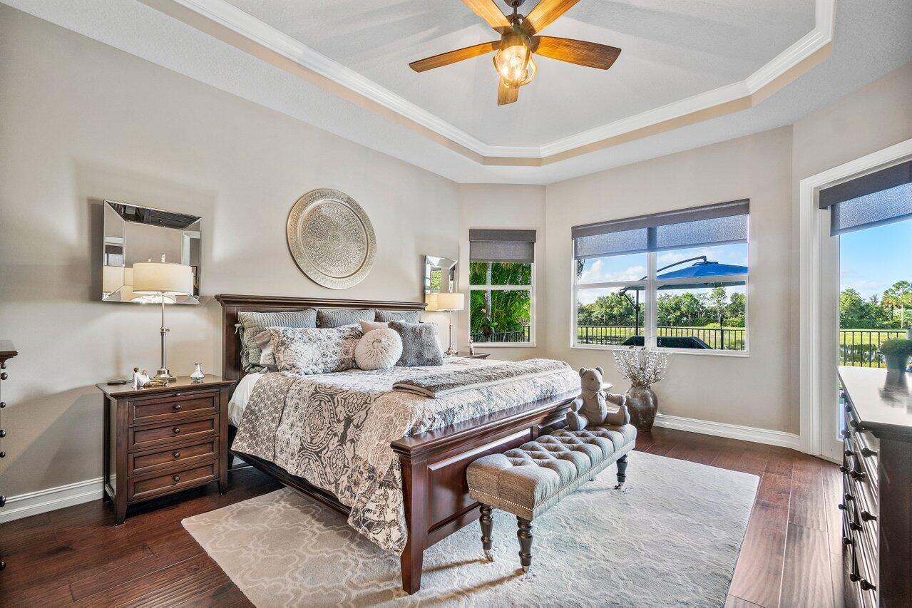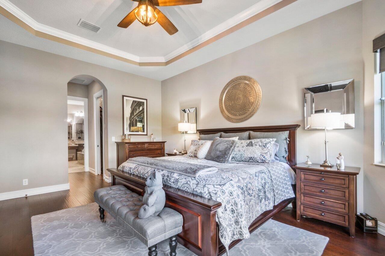 This IMMACULATE and welcoming home has remarkable custom features! Gorgeous wood flooring, decorative tray ceilings, crown molding, custom lighting, window treatments, volume ceilings, custom closets and an amazing cul-de-sac lot! Professionally landscaped for beauty and privacy. Fully fenced backyard, private pool with sun ledge, lake view, covered & open patio areas. 4-bedroom + office with a split floor plan, formal rooms & great room. Office overlooks lush landscaping. Elegant kitchen with 48'' cabinets, granite, backsplash, stainless steel appliances, double sink, double oven, cooktop & pull-out shelves. Open to a bright family room and spacious breakfast nook. This is the perfect gathering area. French doors (impact glass) lead out to the lanai and pool. See supplement for more!