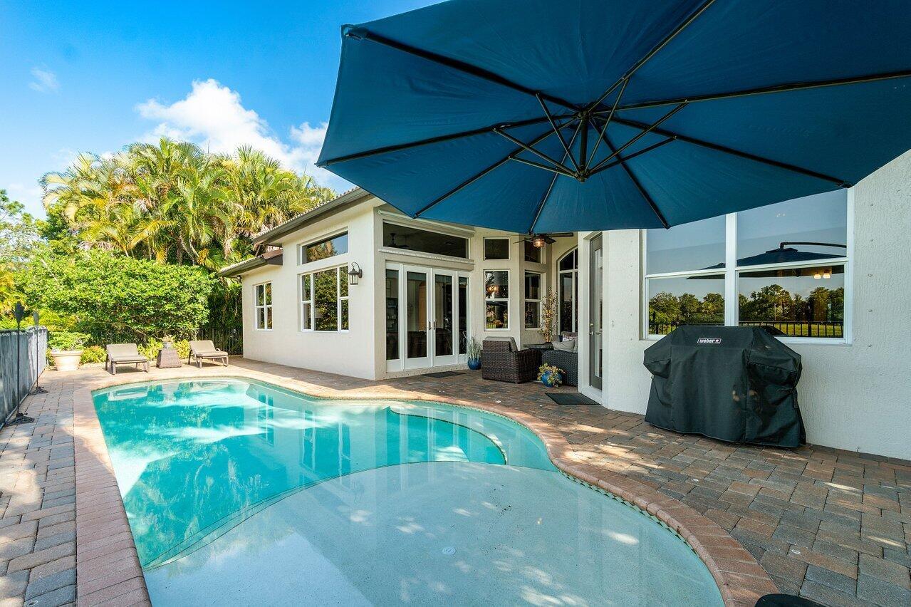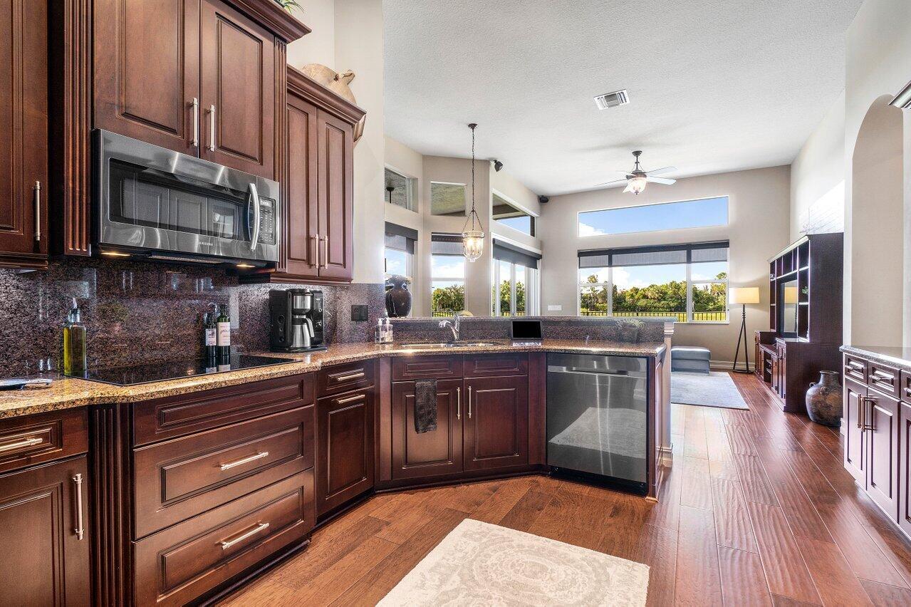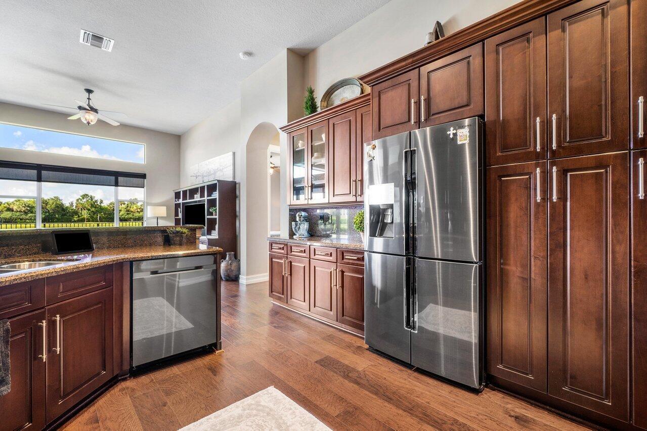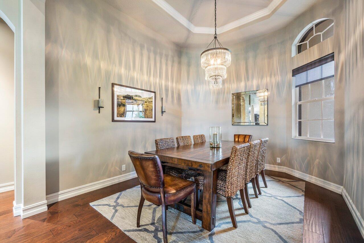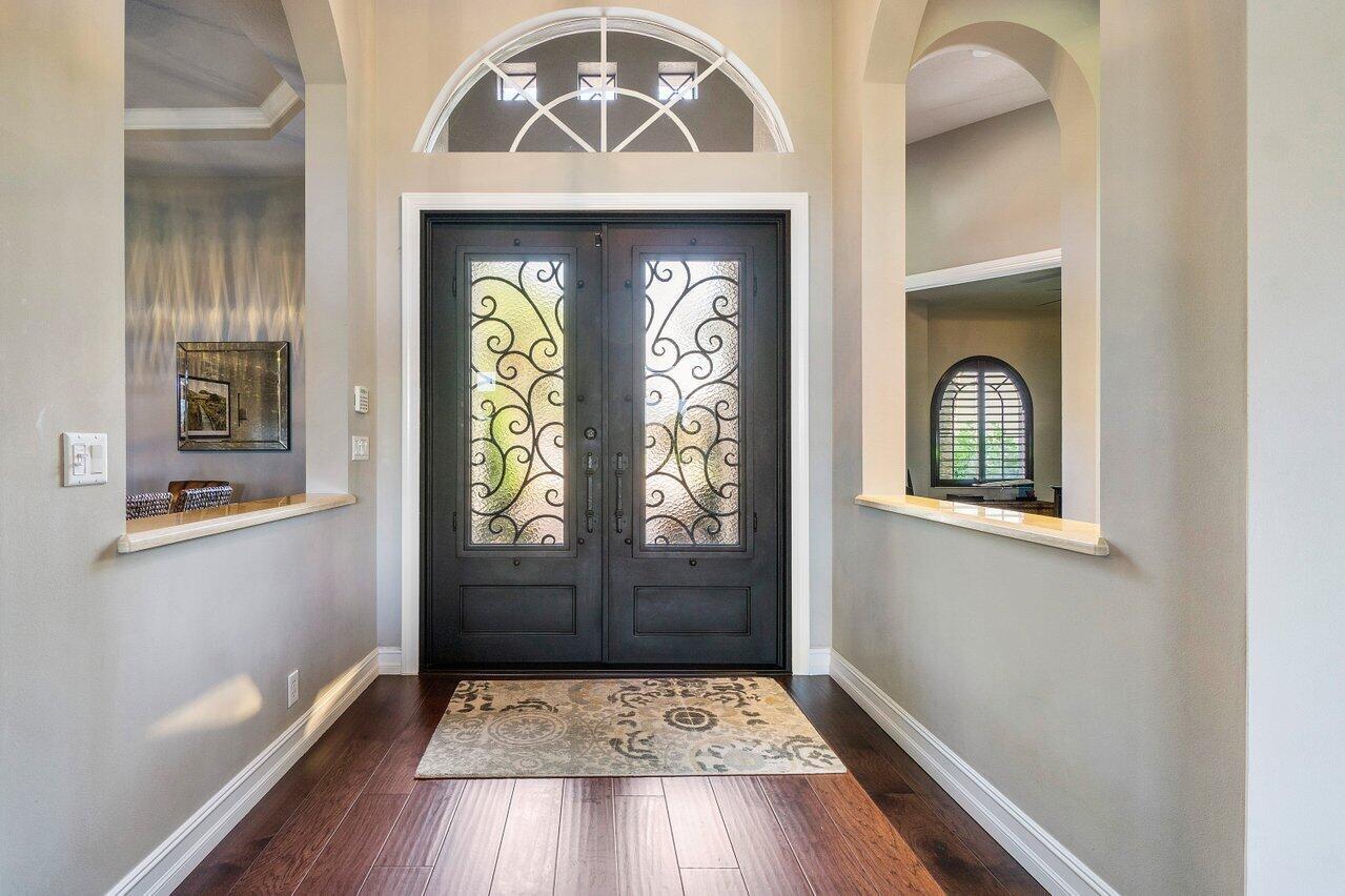 This IMMACULATE and welcoming home has remarkable custom features! Gorgeous wood flooring, decorative tray ceilings, crown molding, custom lighting, window treatments, volume ceilings, custom closets and an amazing cul-de-sac lot! Professionally landscaped for beauty and privacy. Fully fenced backyard, private pool with sun ledge, lake view, covered & open patio areas. 4-bedroom + office with a split floor plan, formal rooms & great room. Office overlooks lush landscaping. Elegant kitchen with 48'' cabinets, granite, backsplash, stainless steel appliances, double sink, double oven, cooktop & pull-out shelves. Open to a bright family room and spacious breakfast nook. This is the perfect gathering area. French doors (impact glass) lead out to the lanai and pool. See supplement for more!