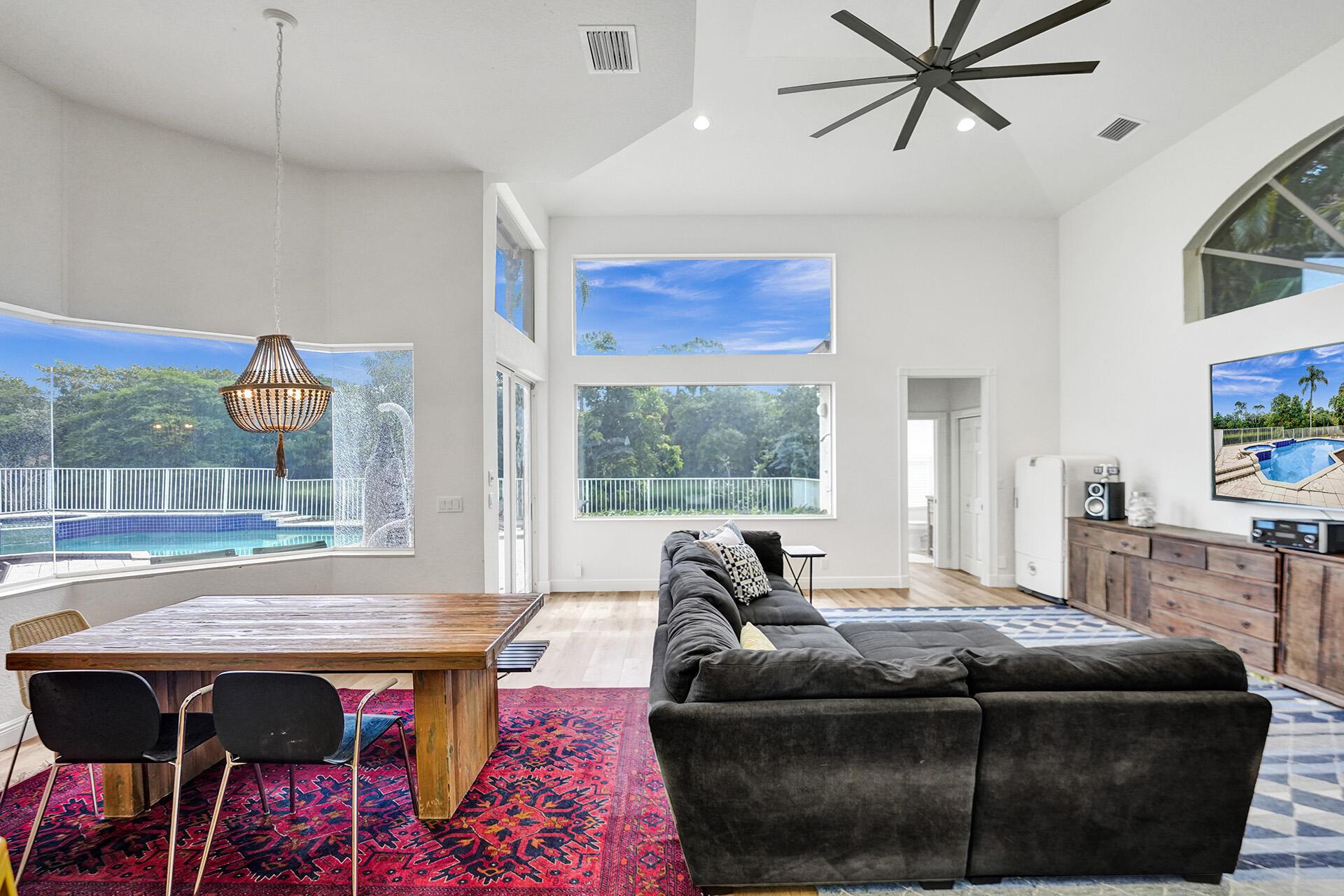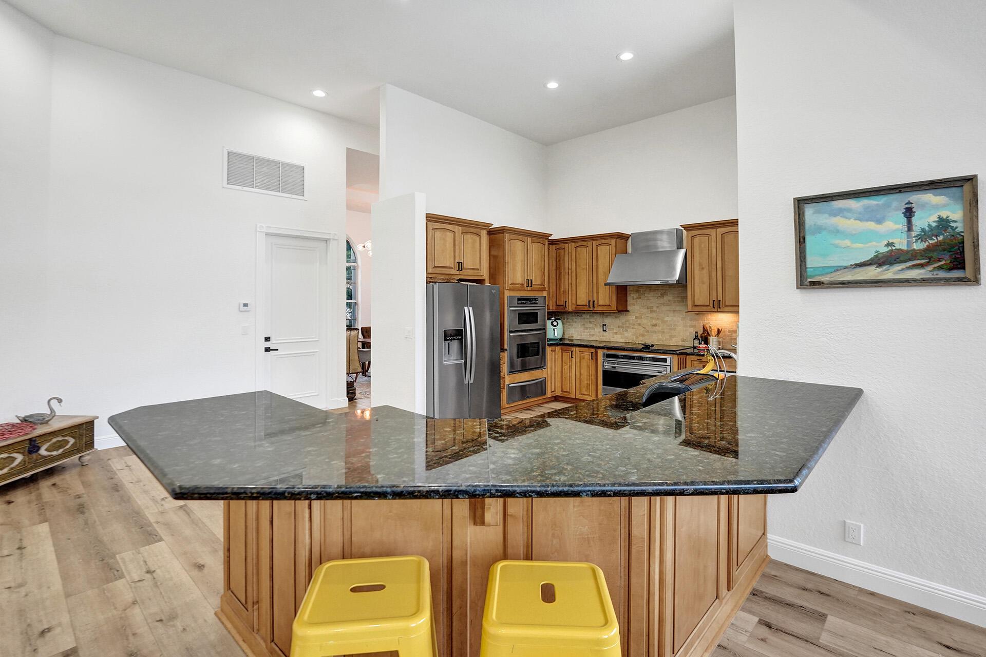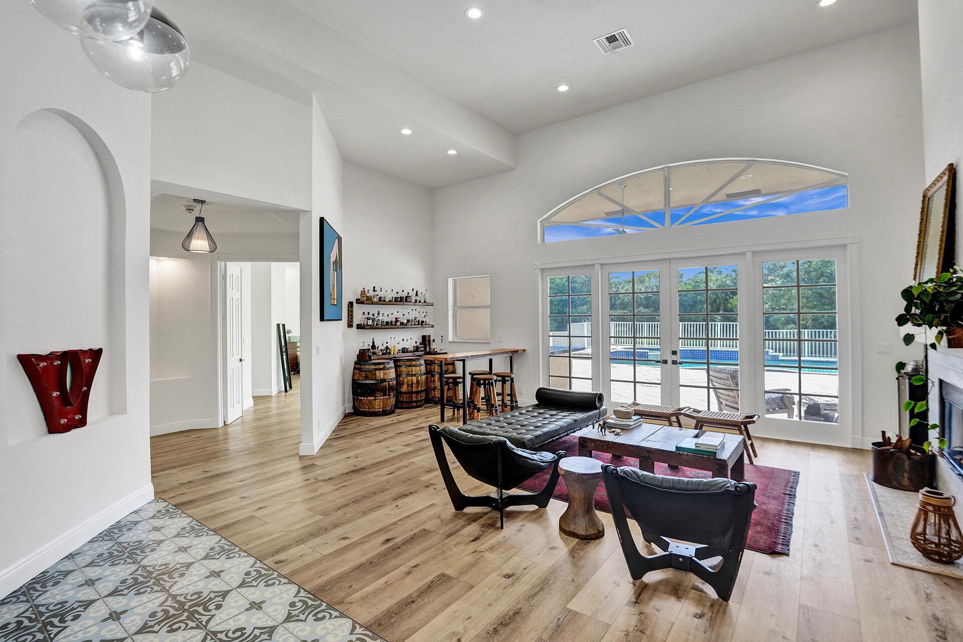 Outstanding home in Parkside! Welcome to your calm oasis, situated on a beautiful lake lot this one story, 4 bedroom 2 bathroom 2 half baths open concept updated home combines style & comfort! Front entry opens to high volume ceilings with loads of light & double French doors. High ceilings continue into kitchen/family room area overlooking pool with lake views. All new high end vinyl flooring throughout, impact glass in primary bedroom & bath, both HVAC units are newer, all new high hats & light fixtures. Huge backyard complete with pool/spa and mature mango, avocado, pomegranate, and fig trees. Additional features include: remodeled common bathroom, both 1/2 bathrooms remodeled, newer refrigerator, new oven, new pool pump. All nestled on a quiet tree lined street in a cozy neighborhood