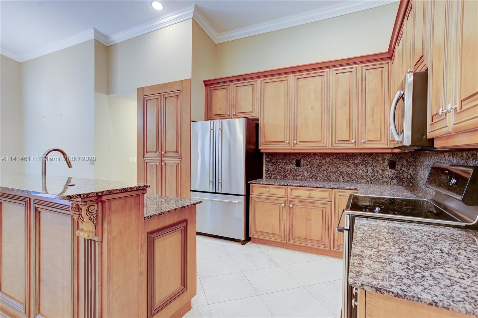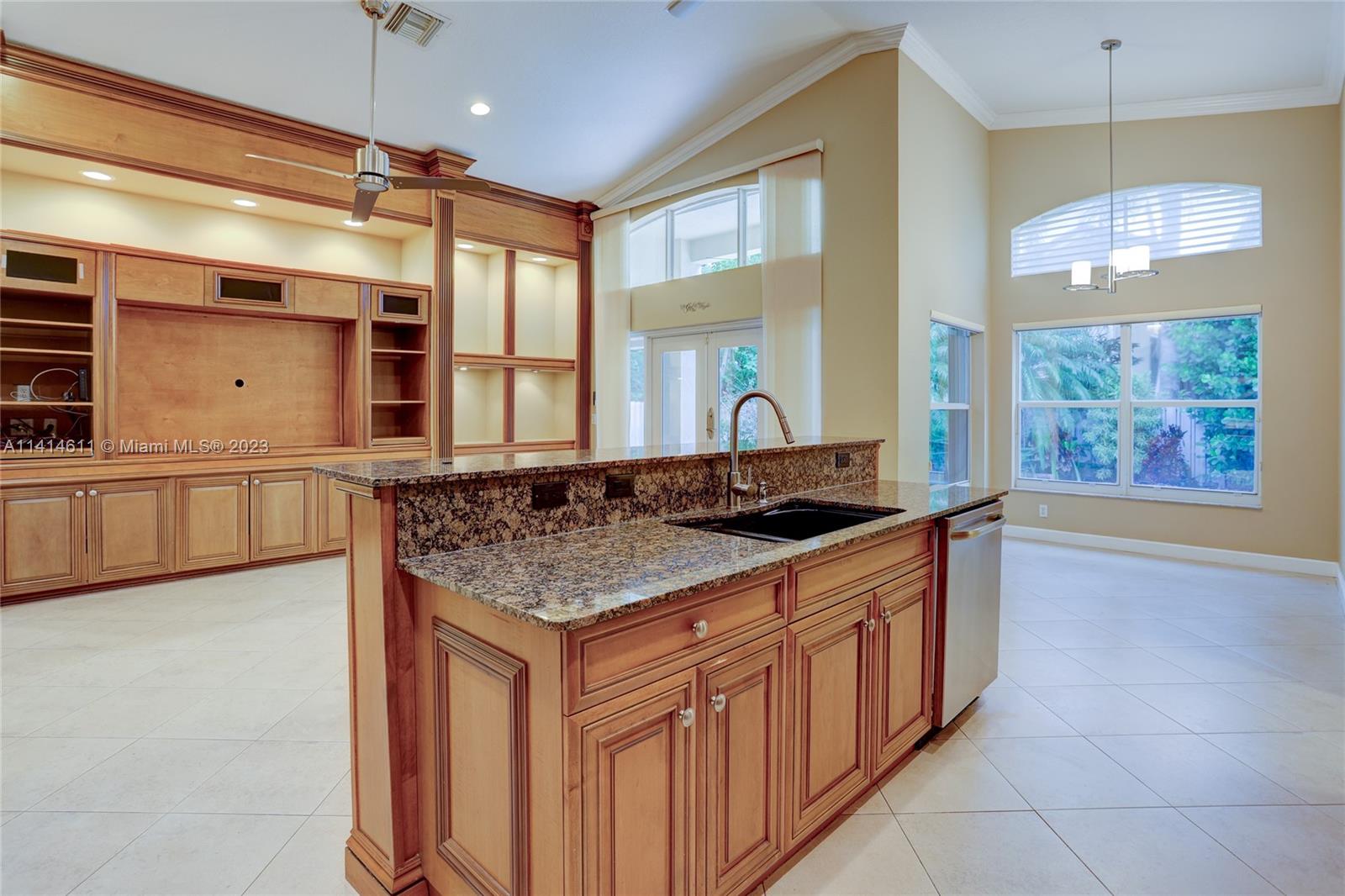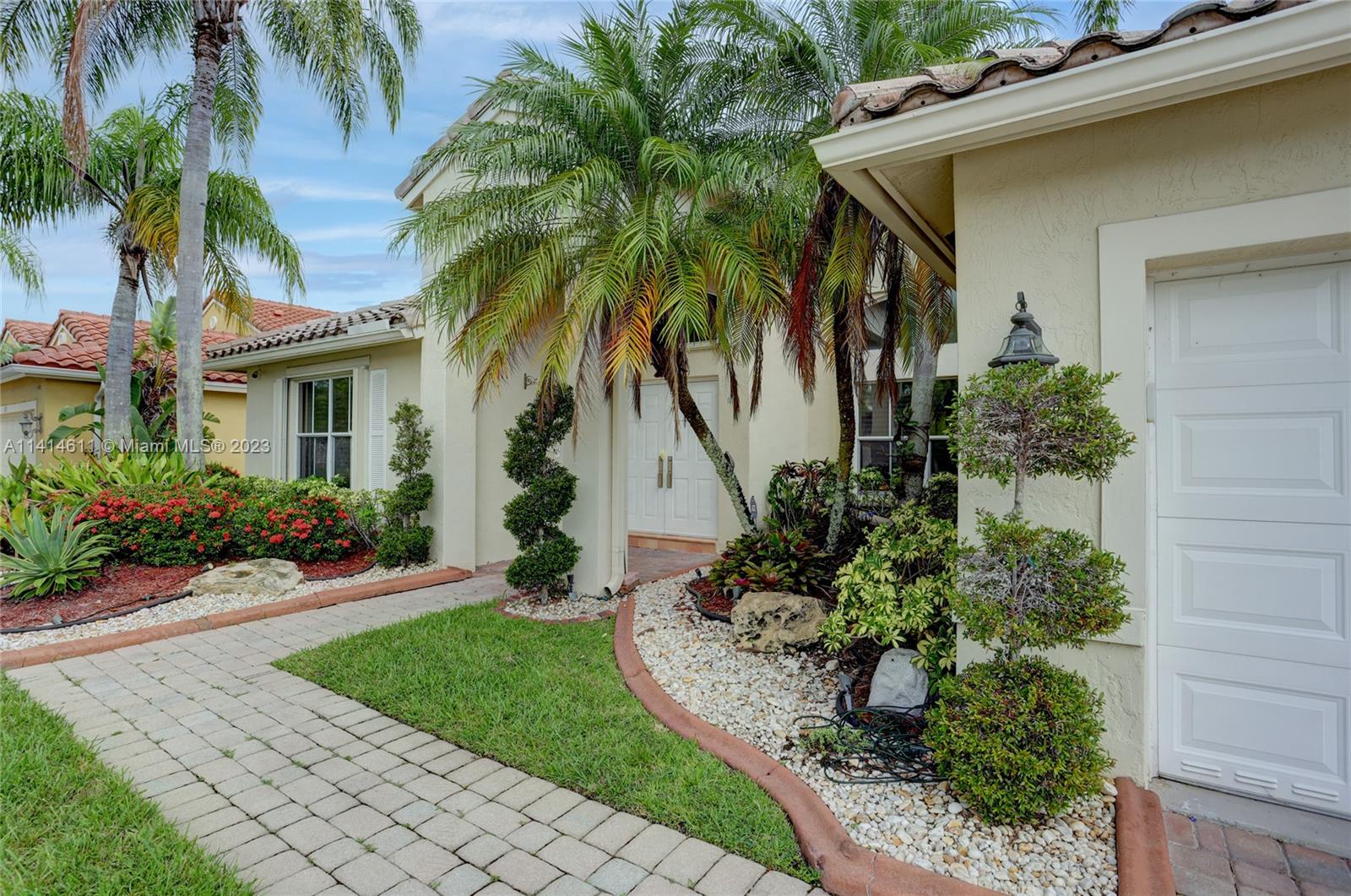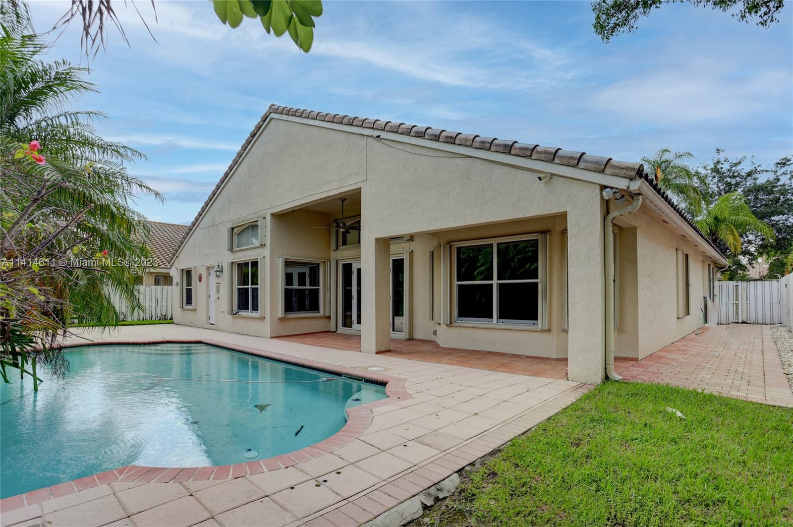 Stunning pool home in the sought after gated community of Encantada in West Pembroke Pines! This home features a split floor plan with 4 ample bedrooms & an oversized den/5th bedroom. Tile floorings throughout with soaring ceilings & crown molding. Formal living & dining area with eat-in kitchen counter. Gourmet island kitchen with real wood cabinetry, granite countertops, pull outs & pantry. Stainless steel appliances, newer AC (5 yrs old approx) & 2 water heaters (1 tankless). Gorgeous built-in wall unit & convenient built-in workstation for students or those working from home. Built-in closets throughout including the garage. Outdoor, enjoy the pristine heated pool & large patio fully enclosed with a privacy fence & beautiful landscaping. Accordion shutters throughout. Great schools!