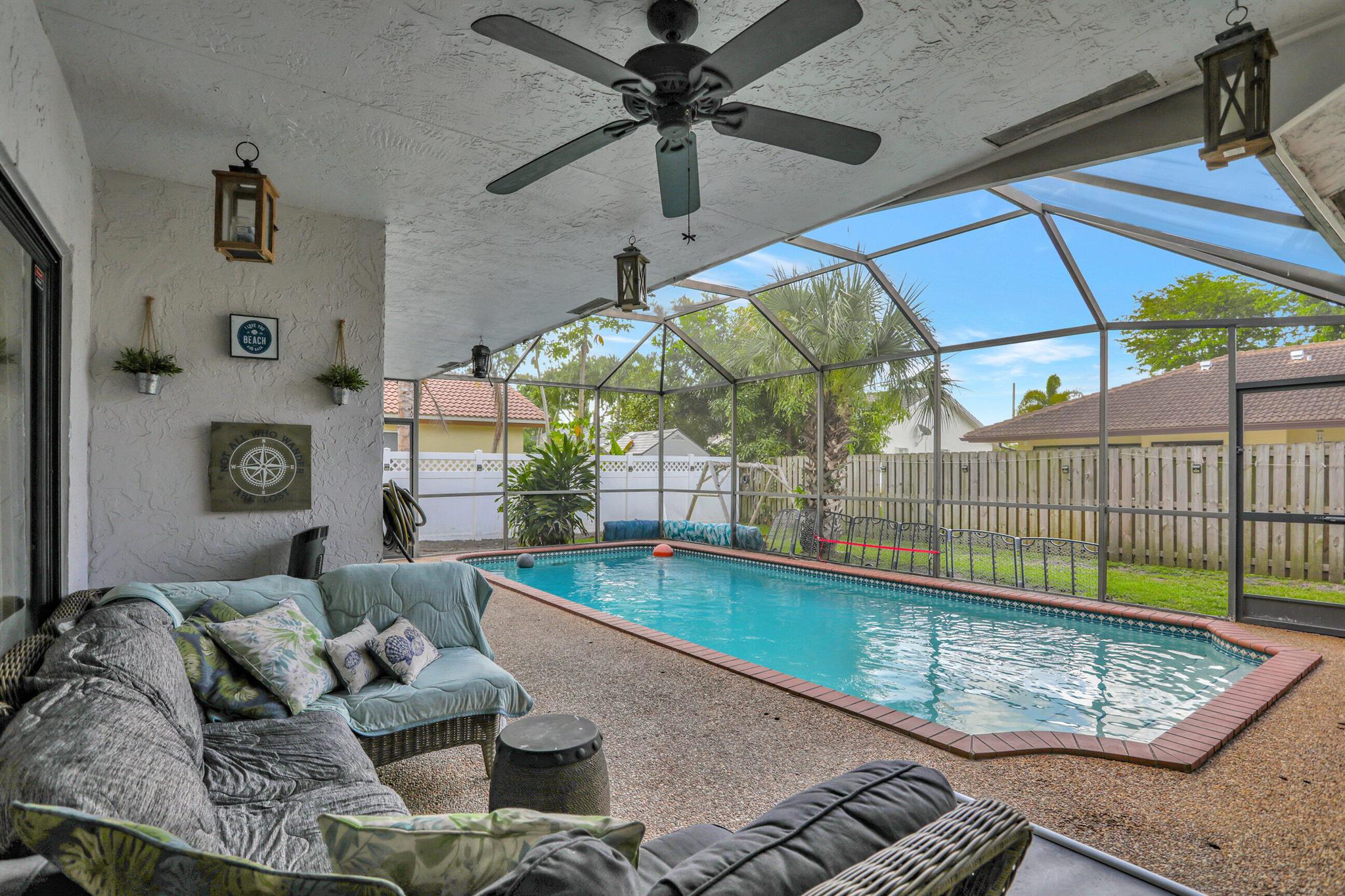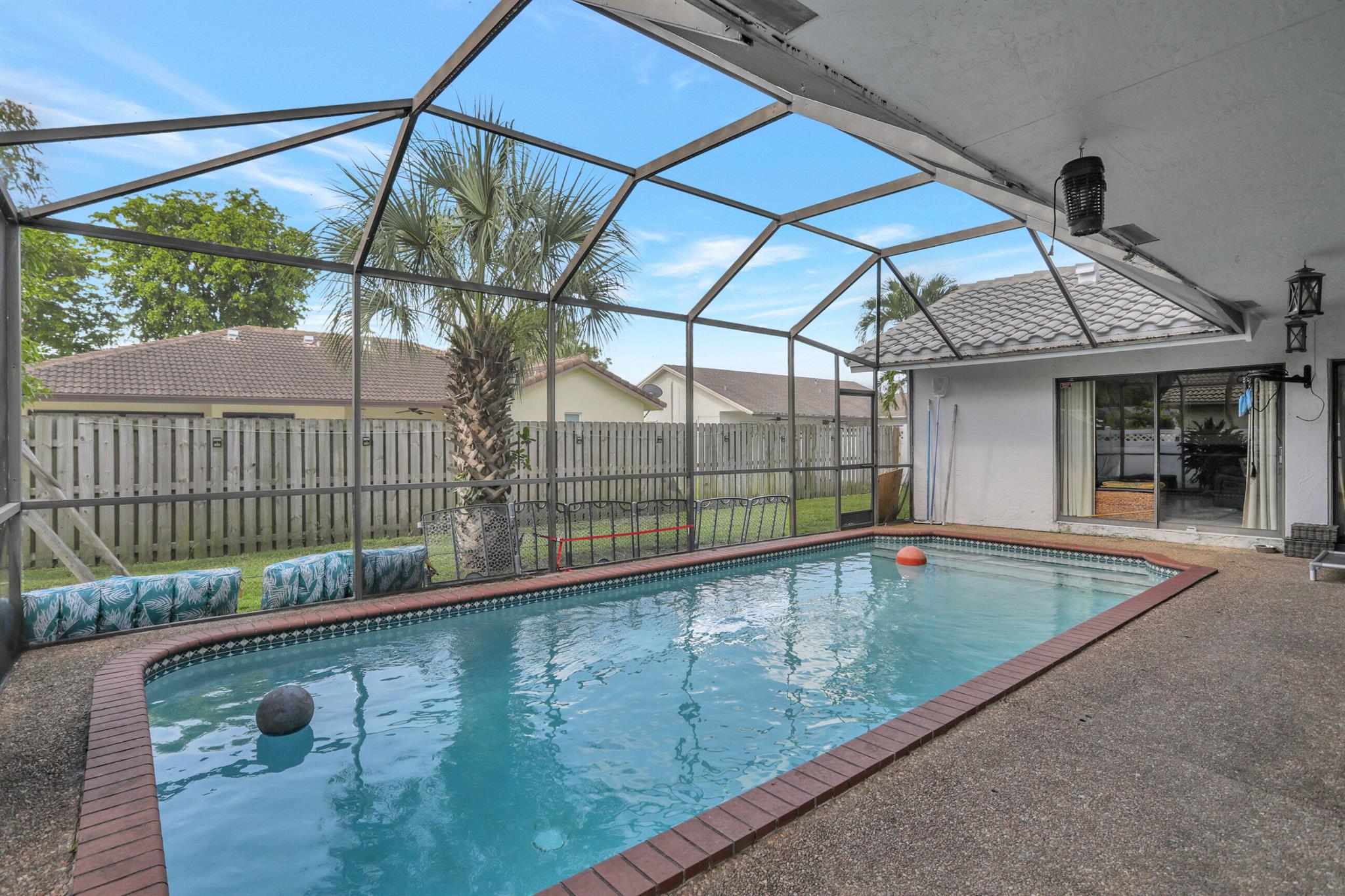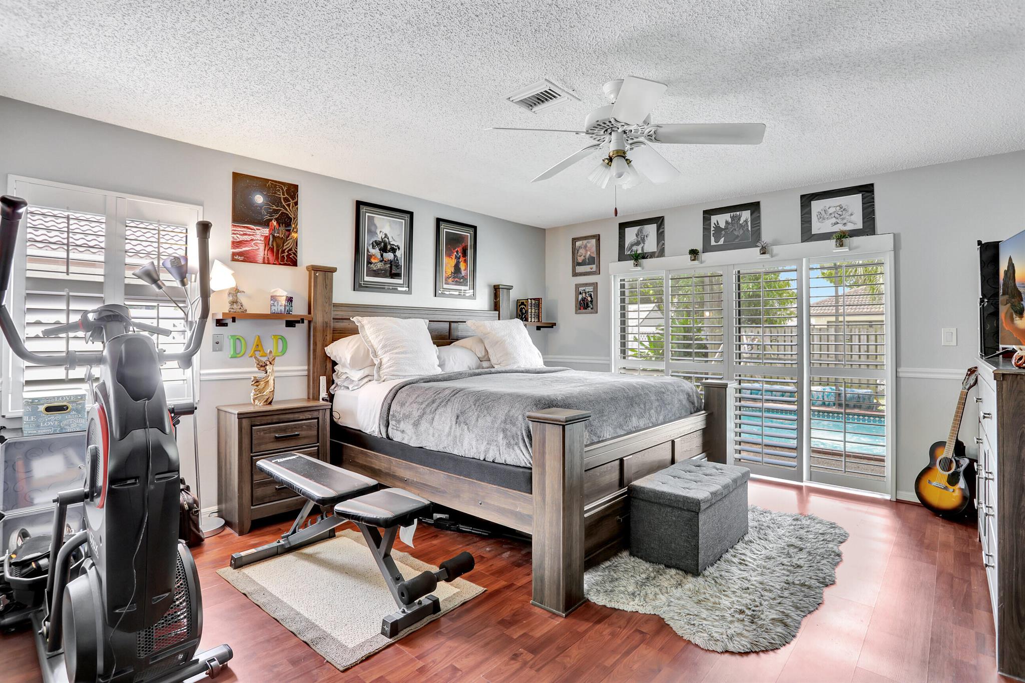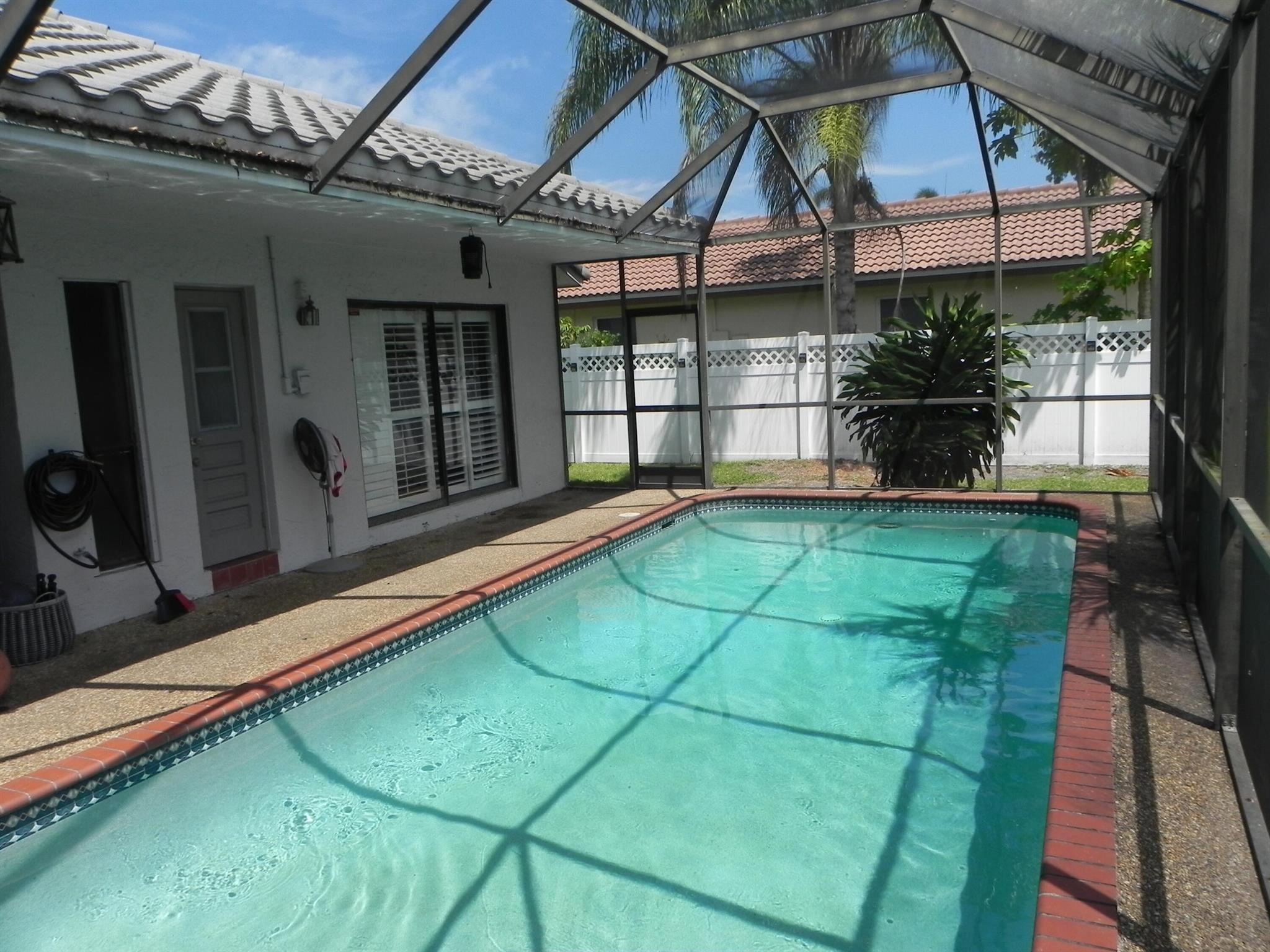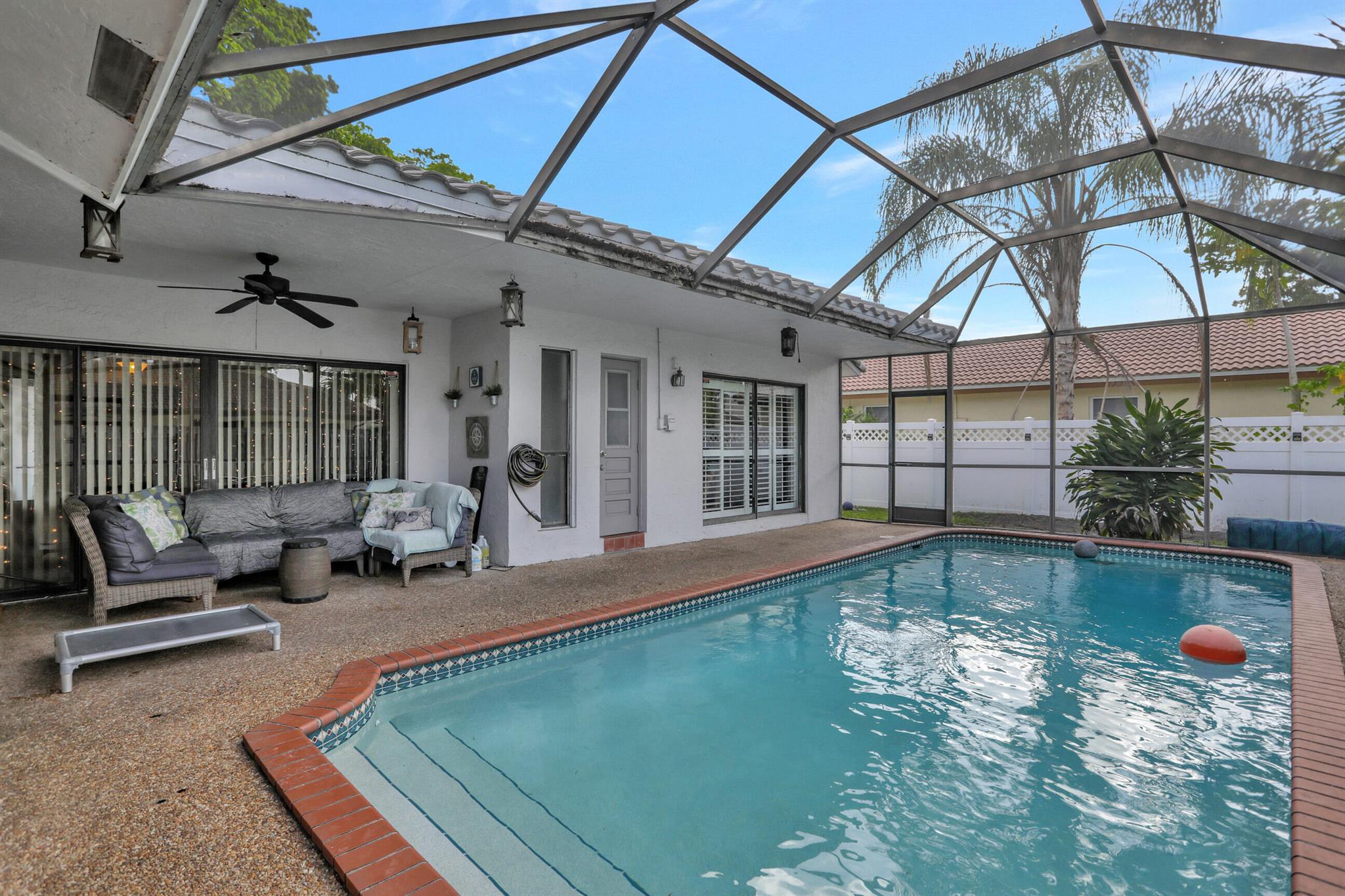This wonderful home is nestled on a quiet street in a heavily desired community where mature shade trees line the streets. Features include vaulted ceilings, large neutral tile, laminate in the bedrooms, a large ensuite master with plantation shutters, double sink vanity, step down shower, and cabana door to the pool area. The kitchen opens up to the family room with bar seating and includes white shaker cabinets, granite counters, undermount sink, newer Whirlpool washer, dryer and refrigerator. The roof is approx. 6 years old, and the AC is 4. The pool has Southern exposure, it has a salt system and a new pump motor. The backyard is completely fenced, a smart irrigation system was installed along with new gutters w/ screens. The garage fridge does not convey.