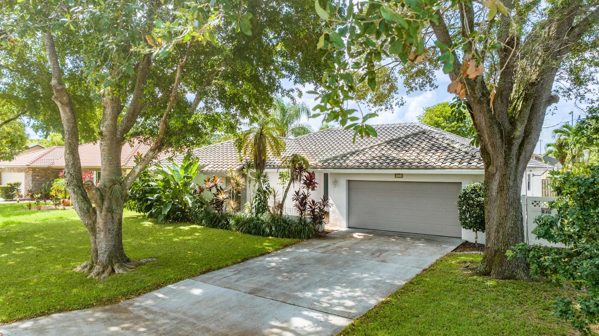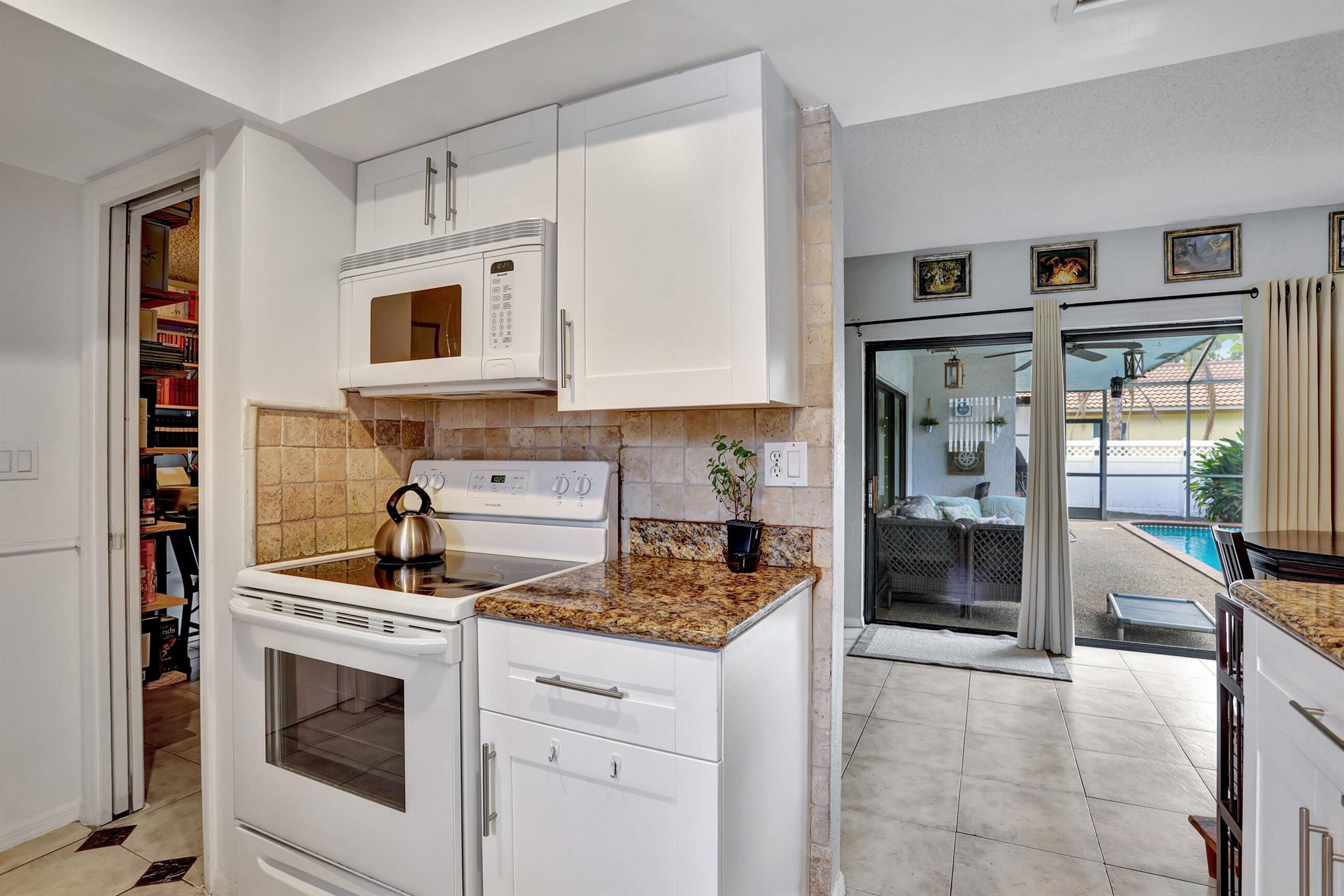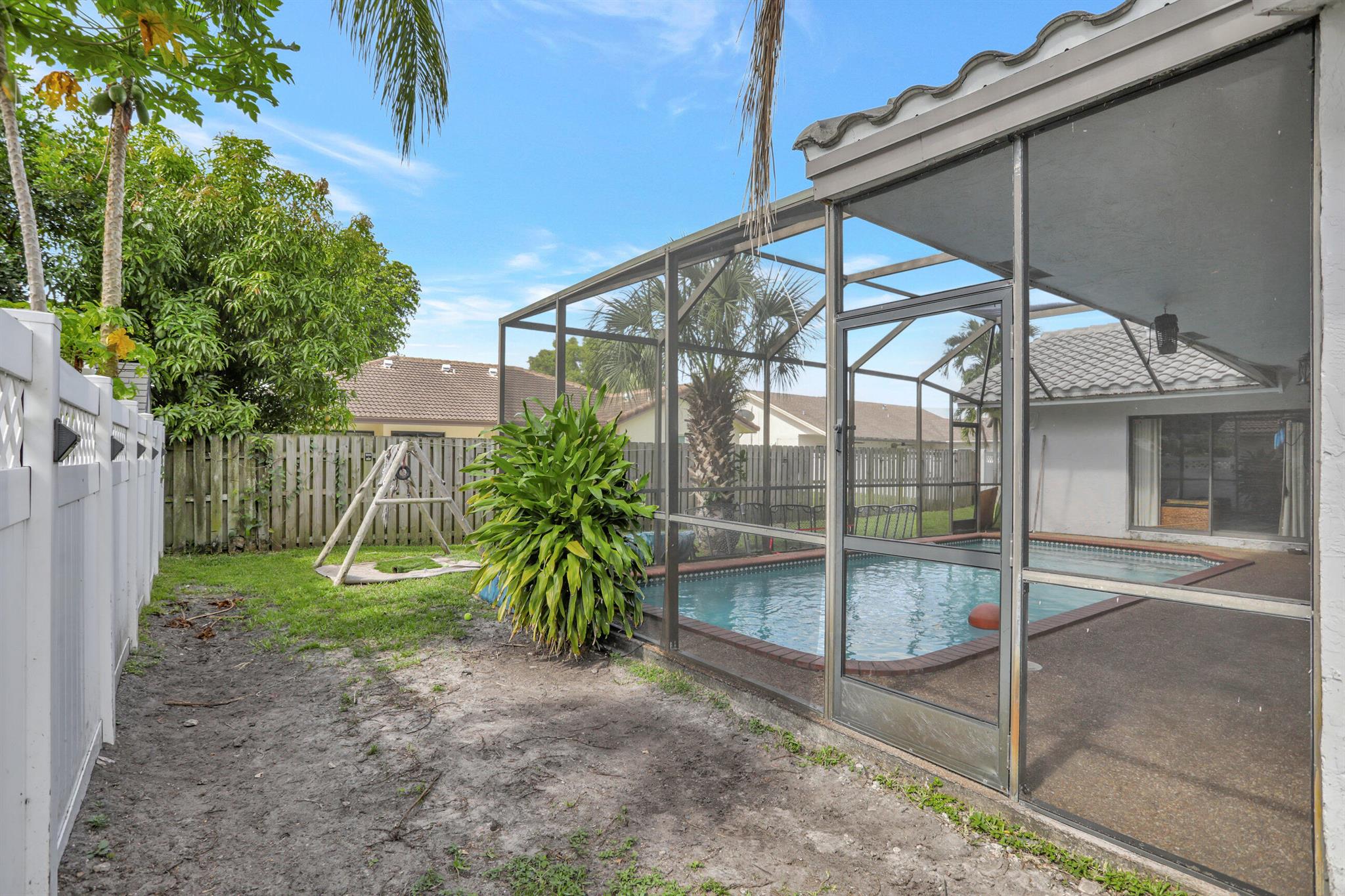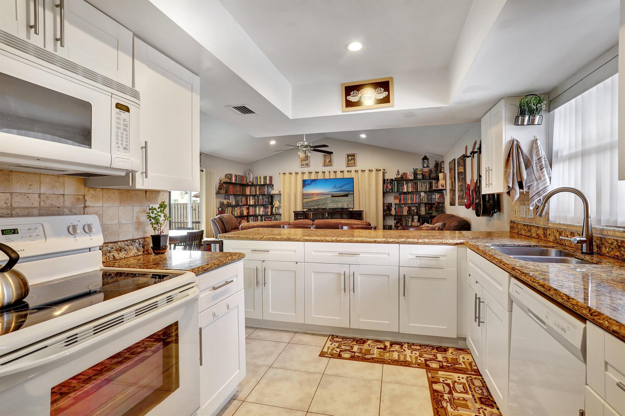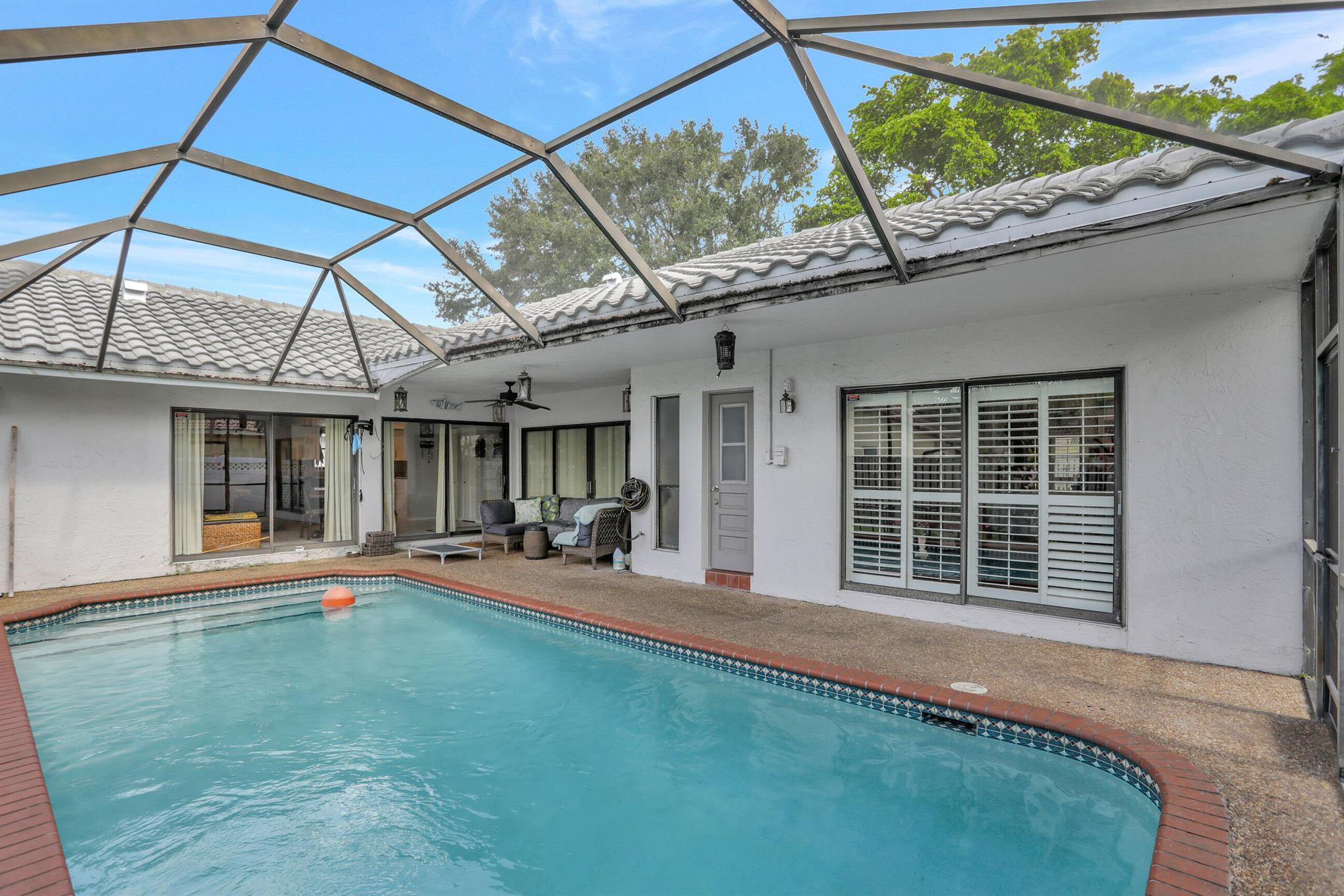 This wonderful home is nestled on a quiet street in a heavily desired community where mature shade trees line the streets. Features include vaulted ceilings, large neutral tile, laminate in the bedrooms, a large ensuite master with plantation shutters, double sink vanity, step down shower, and cabana door to the pool area. The kitchen opens up to the family room with bar seating and includes white shaker cabinets, granite counters, undermount sink, newer Whirlpool washer, dryer and refrigerator. The roof is approx. 6 years old, and the AC is 4. The pool has Southern exposure, it has a salt system and a new pump motor. The backyard is completely fenced, a smart irrigation system was installed along with new gutters w/ screens. The garage fridge does not convey.