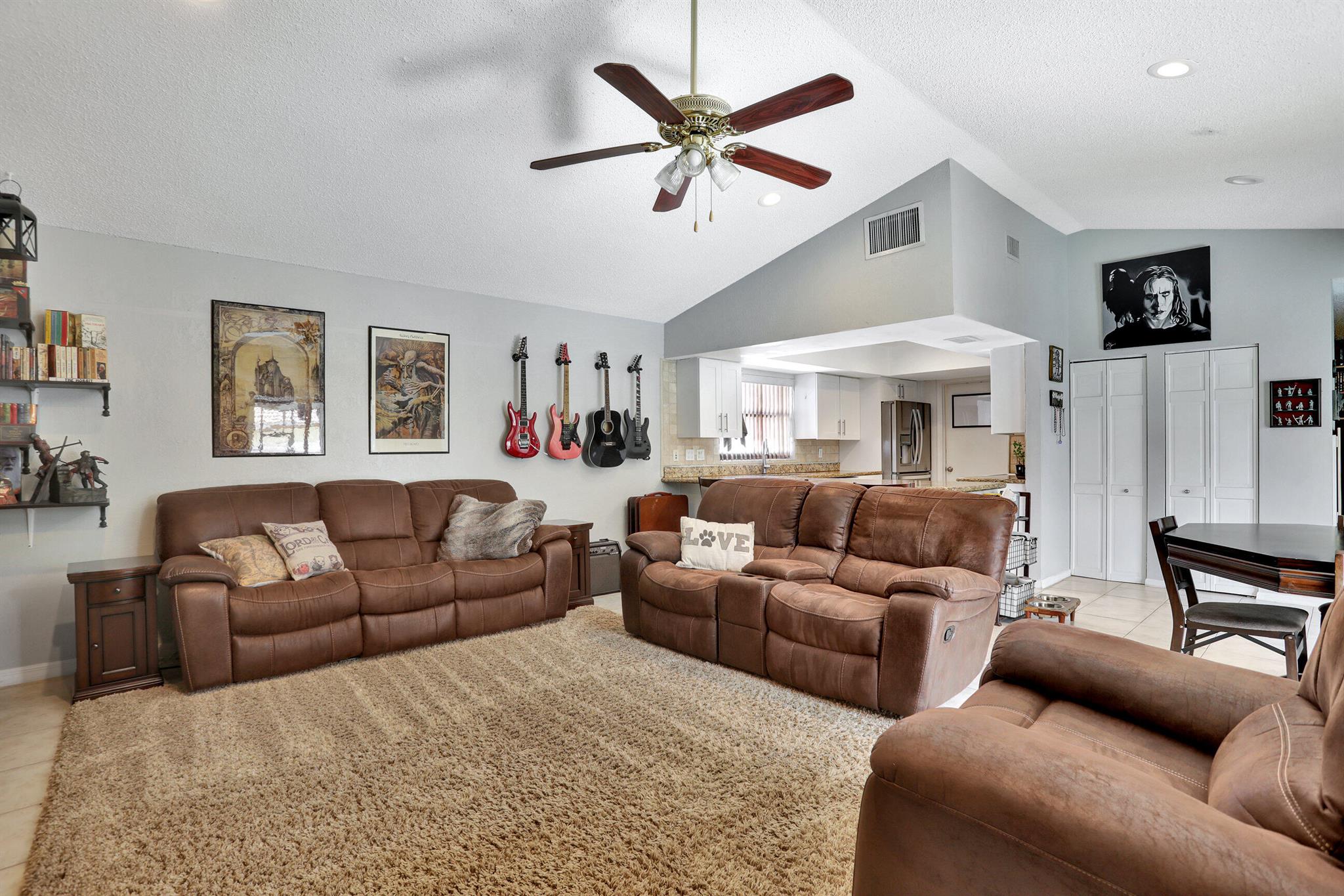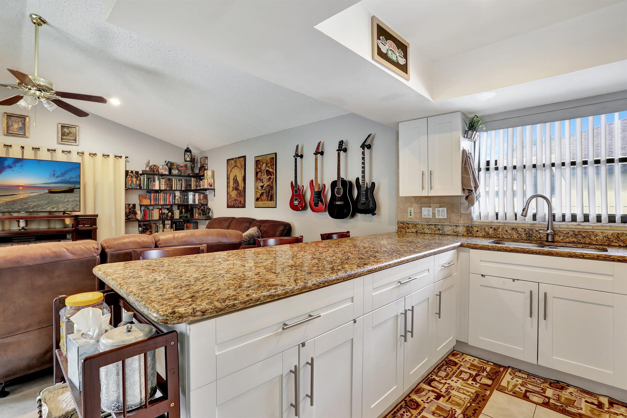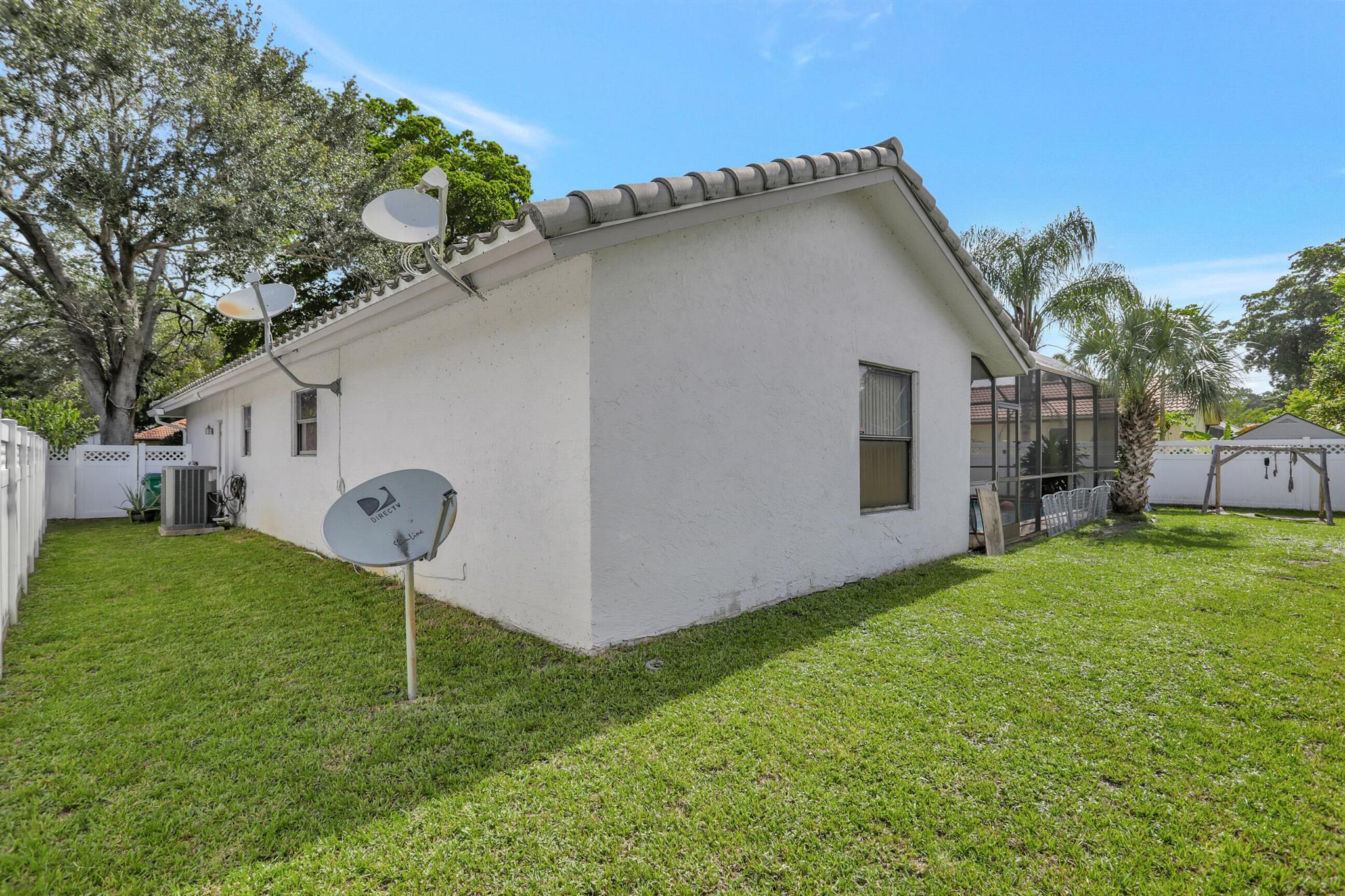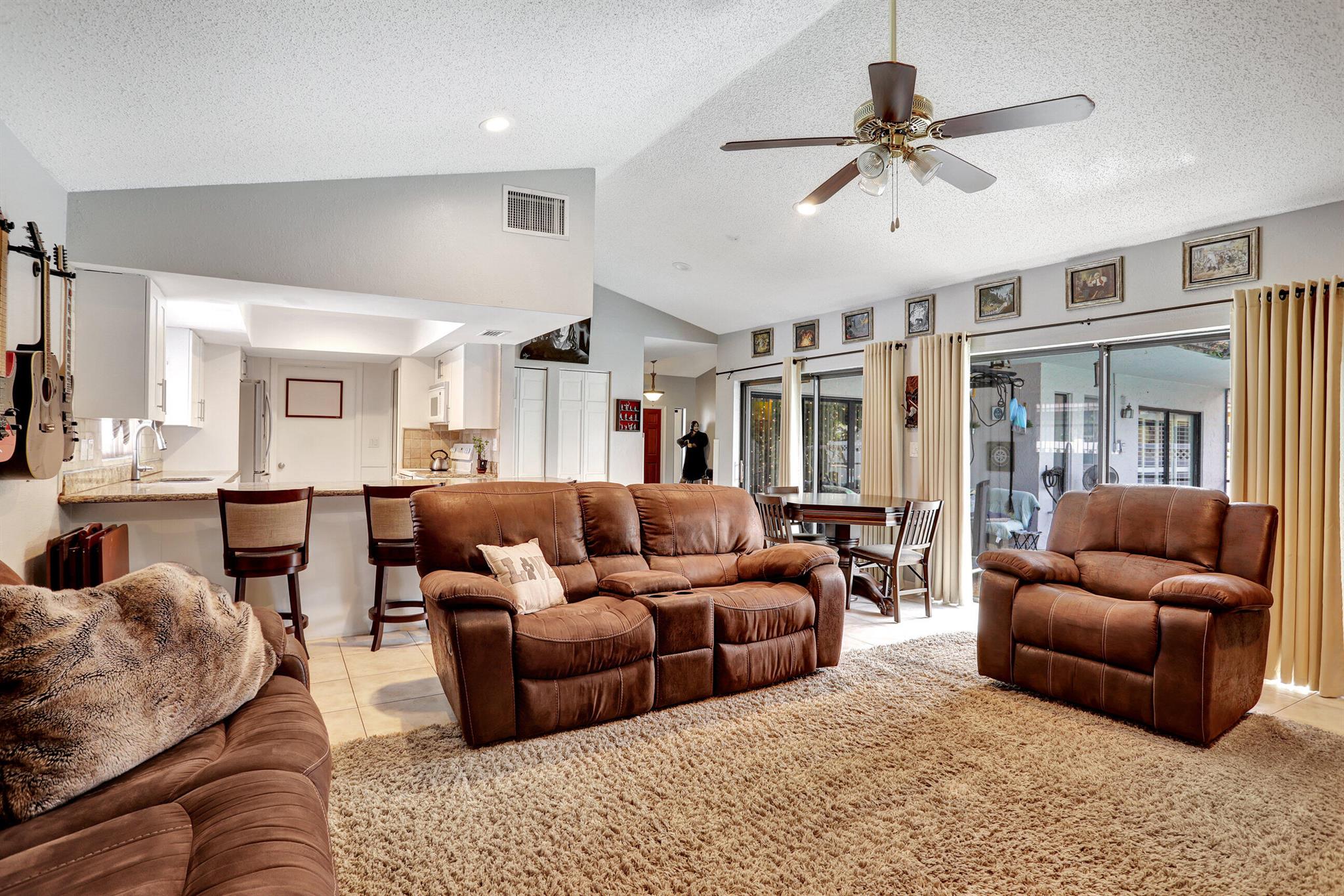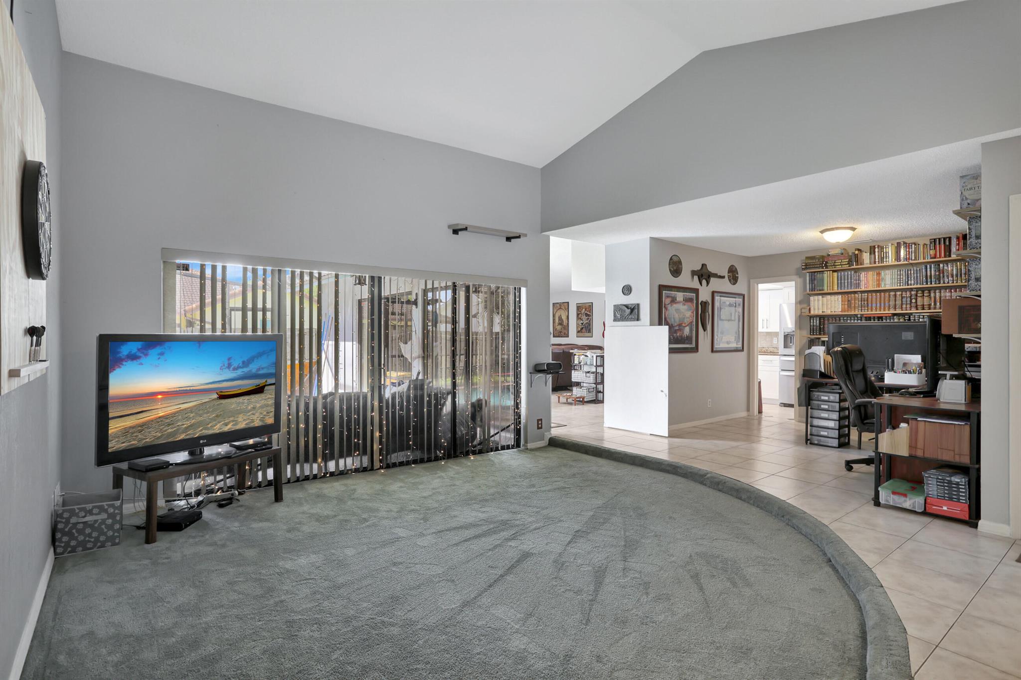 This wonderful home is nestled on a quiet street in a heavily desired community where mature shade trees line the streets. Features include vaulted ceilings, large neutral tile, laminate in the bedrooms, a large ensuite master with plantation shutters, double sink vanity, step down shower, and cabana door to the pool area. The kitchen opens up to the family room with bar seating and includes white shaker cabinets, granite counters, undermount sink, newer Whirlpool washer, dryer and refrigerator. The roof is approx. 6 years old, and the AC is 4. The pool has Southern exposure, it has a salt system and a new pump motor. The backyard is completely fenced, a smart irrigation system was installed along with new gutters w/ screens. The garage fridge does not convey.