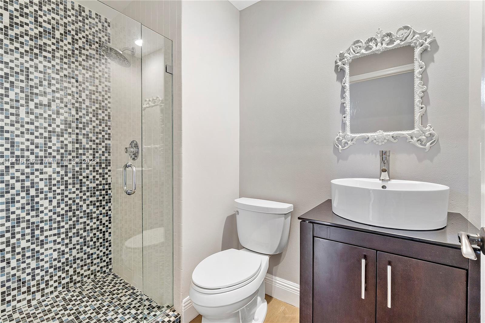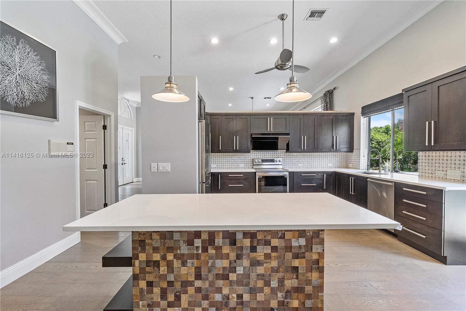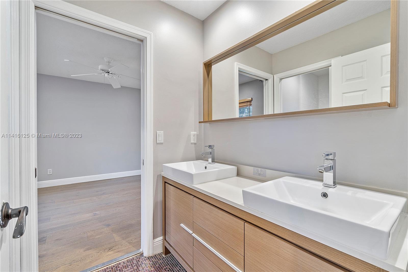 Warm modern, rarely available updated Move-in Ready! 6 bedroom, 4 bath + bonus room home with oversized pool/patio on a lushly landscaped lot in the exclusive gated community of Buena Vista/Cloisters. 3-way split floor plan with master bedroom downstairs. New roof in 2020, gutters, Fresh interior & exterior paint in 2023, newer A/C in 2017 (downstairs) and 2016 (upstairs). Upgrades include oak barn wood floors, LED high hats, white quartz countertops, stainless Samsung appliances, a dual-zone full-size wine cooler, designer fixtures, custom window treatments, and a travertine patio pool deck. Plenty of storage and closet space. 3 car garage and oversized brick paved driveway. Minutes to Boca beaches, walk/bike ride to shops and restaurants. All AAA Schools. LOW HOA! NO Carpet in House!