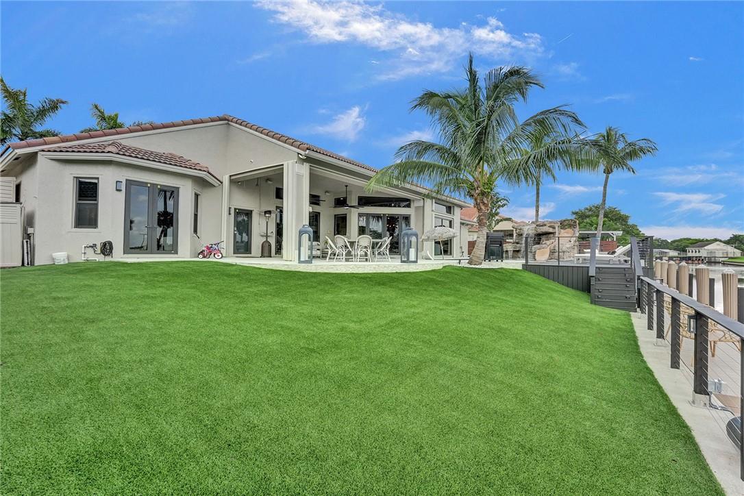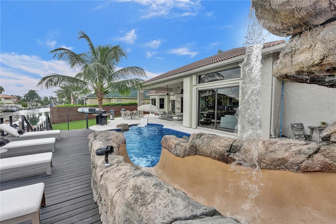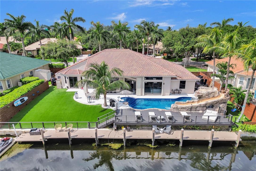 Incredible waterfront home in the gated island community Isla Del Sol 100’ of direct waterfront with ocean access & 90ft of new TREX dock and pilings. Private boat ramp for residents 3 lots away. Brand new state of the art smart-pool w. spa and slide, full turf with putting green, covered entertaining space and beautiful water views. No neighbors looking in across the canal. Tile flooring throughout, kitchen overlooks water & pool, formal dining and more. Main bedroom has French doors to patio, custom California closet and spa like bathroom. Whole house Impact windows and doors 2023, A/C 2023, whole house surround system, Full house central Vac, auto/electric blinds on all windows. Complete landscape lighting around entire home, canal lights, security cameras. 45 min boat ride to Las Olas.