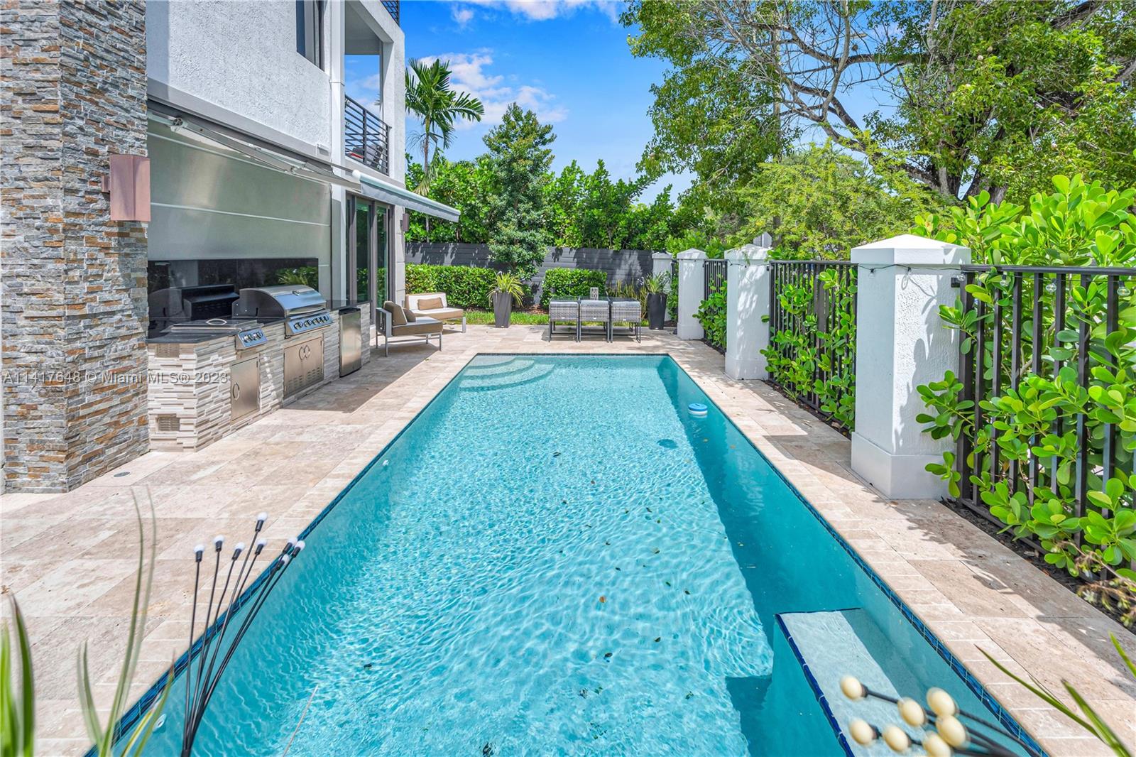 EXTRAORDINARY 3-STORY TOWNHOUSE, ALL CONCRETE CONSTRUCTION, WITH ELEVATOR ON LARGE CORNER LOT !!! Quiet and Private Corner, 3bedroom 3.5 bath + den, 2 car garage, private pool, patio, gas BBQ area/fridge with wind sensor retractable awning/light, 2nd floor covered patio overlooking pool n front balcony,3rd floor sundeck,3 cameras (Entrance, Pool, Garage), Smart Home wired, central vacuum, Natural gas lines for all Appliances/BBQ, VIKING APPLIANCES, French Door Oven, Security Safe anchored in Closet, upgraded light fixtures and window coverings, gorgeous 36X36 White Tile in living areas, wood floors in bedrooms. Chef's Kitchen-Wood cabinetry, Quartz tops. Upgraded bathrooms all with rainfall shower heads,Ferguson fixtures. Come See!! Lots of Upgrades including Garage Floor Coating.