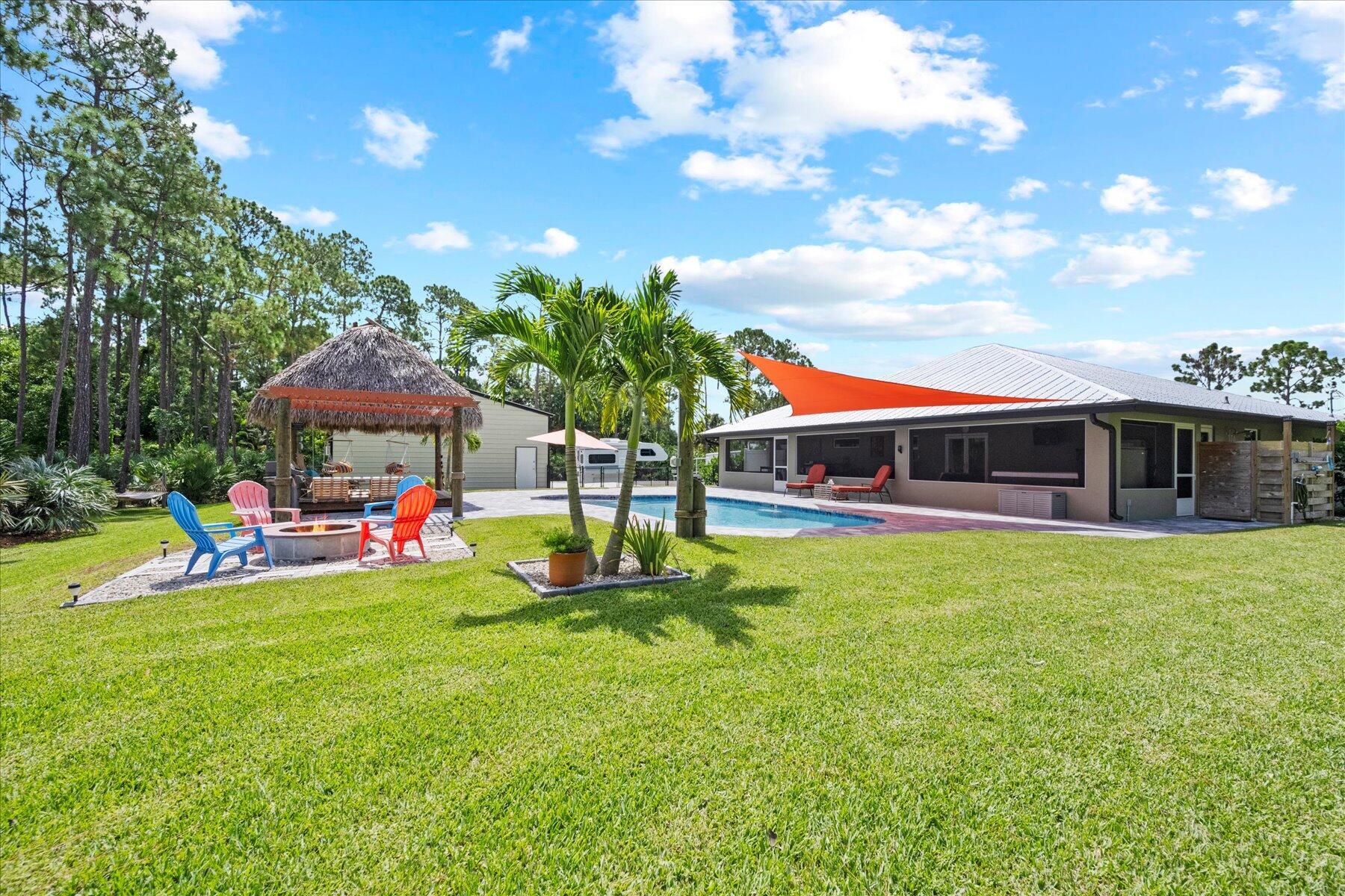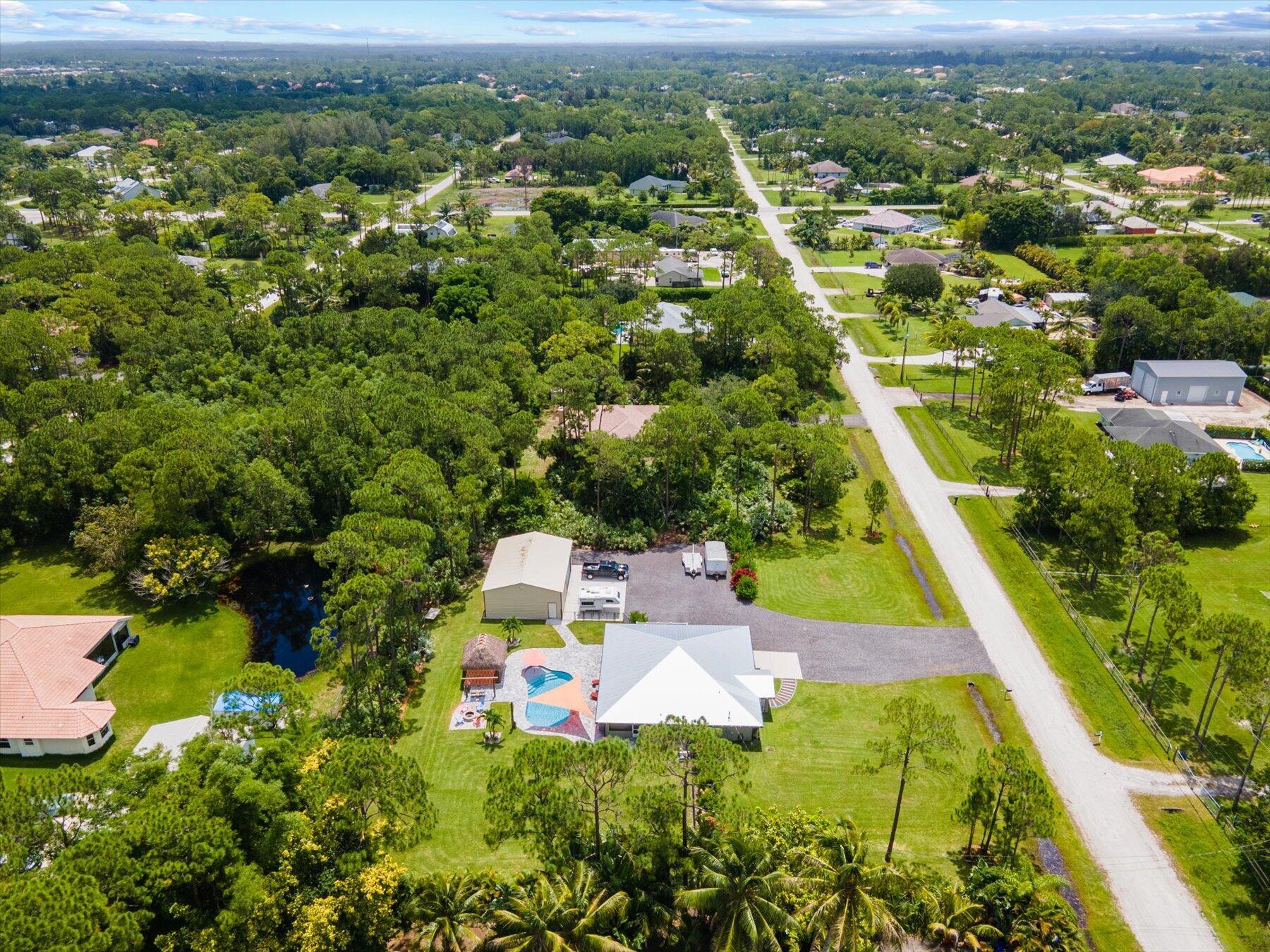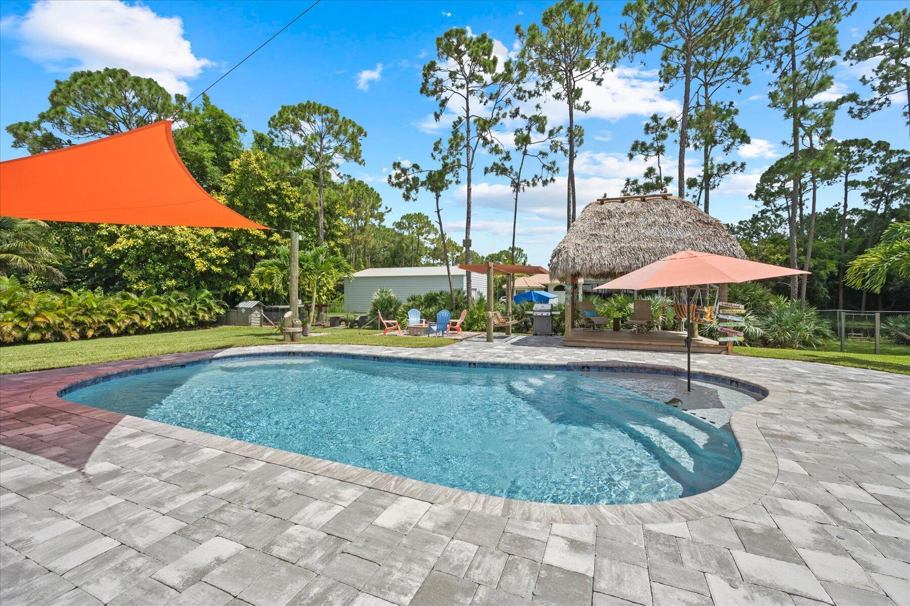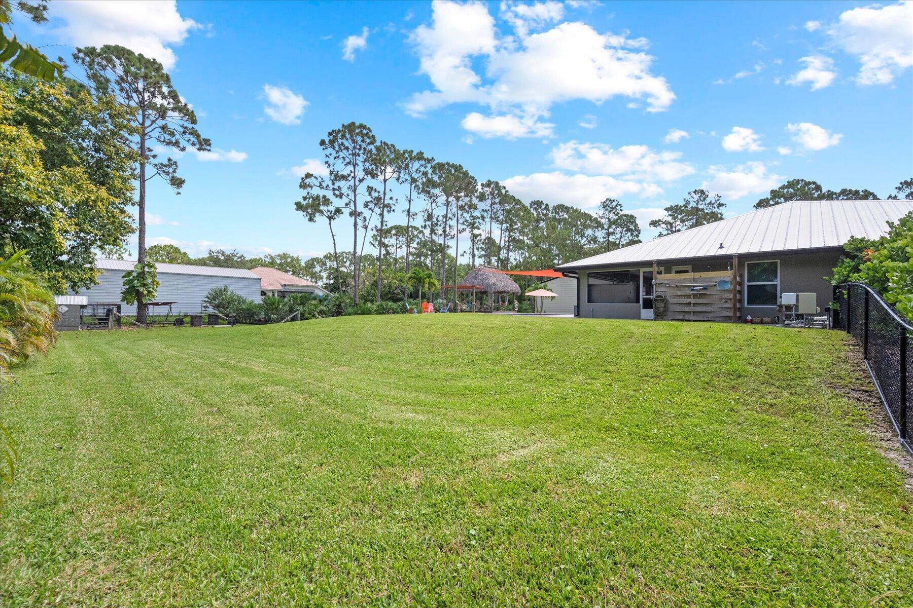 Beautifully Customized and lovingly maintained home in the heart of the acreage with no HOA! Bring your boat, RV and all your toys to this slice of paradise. This gem has 2 bedrooms, a den with built in murphy bed, 2 bathrooms, and an outdoor shower. The current owners tailored this CBS home in 2019 with stainless steel appliances, luxury flooring, handmade vanities, metal roof, impact windows & doors, wired security with exterior cameras, and many more you have to see in person! The backyard is truly a tropical oasis, with a salt water pool, 5 person hot tub, outdoor kitchen, and bar on a screened in 600sqft patio, you can entertain year round. This 1.15 acre lot has a chain link enclosed fence and also houses a 1200 sq ft partially air conditioned metal shop with electricity & Water.