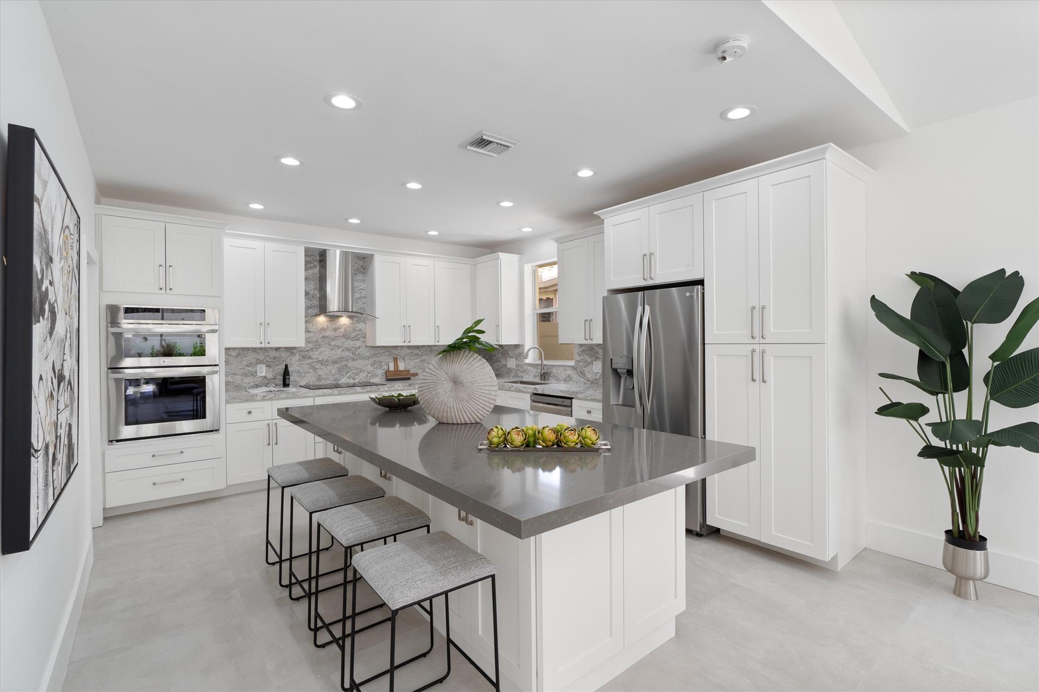 A modern home that's both magnetic and timeless, this Laurel Pointe property sparks pure joy for all who enter its spacious, distinctly contemporary design. Not only does this property exemplify an easy open floor plan, luxe finishes, sleek lines, and infinite natural light, but it brings the perfect balance of utility and tranquility. High-end, cutting-edge designer finished 3-bed, 3-bath single-story home is truly turn-key, private, and looks and feels brand new. Relax and retreat to your oversized master bedroom and soak in your stylish primary bathroom. Craft a refreshing cocktail while preparing a gourmet meal in your state-of-the-art chef's kitchen. LOCATED Immerse yourself in eye-catching indoor and outdoor spaces that expertly showcase the beauty of Boca's natural surroundings